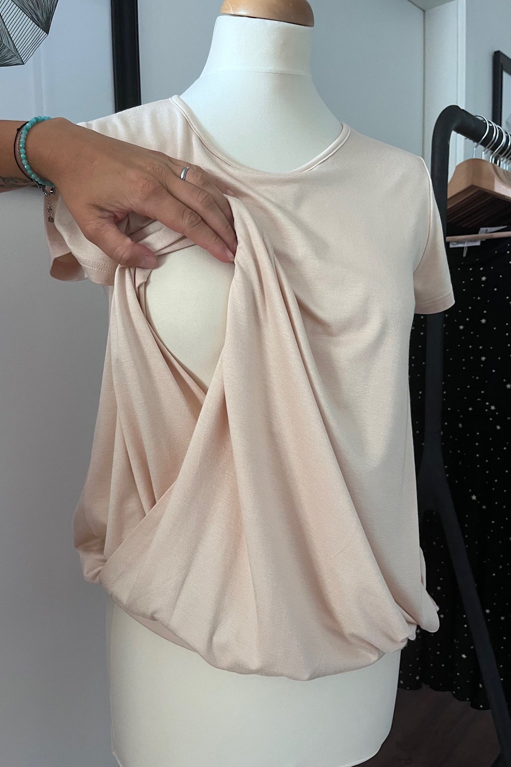 Moje velká láska pro detail se tak propisuje do kolekce Krásná mamka – módy pro (především) kojící maminky. Výroba se nachází v Čechách, kolekce vzniká v Čechách, s respektem k přírodě, lidem i zdrojům. Miluju minimalismus a proto celá kolekce nese myšlenku velmi kvalitních základních nadčasových kousků, které dokombinujete už ve svém vlastním stylu.