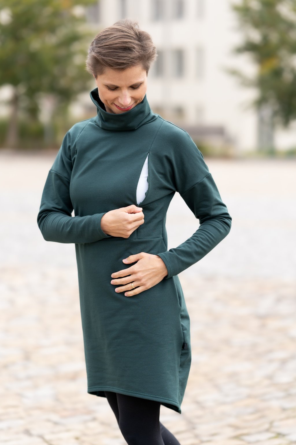 Kojicí šaty Pallas mají v přední části skryté zipy, díky kterým nakojíte své miminko nenápadně a pohodlně opravdu kdekoliv. Díky tomu, že zipy vedou přes prsa, je přístup k nim opravdu rychlý. Zip se otevírá dolů, je tedy možné ho otevřít i jednou rukou.