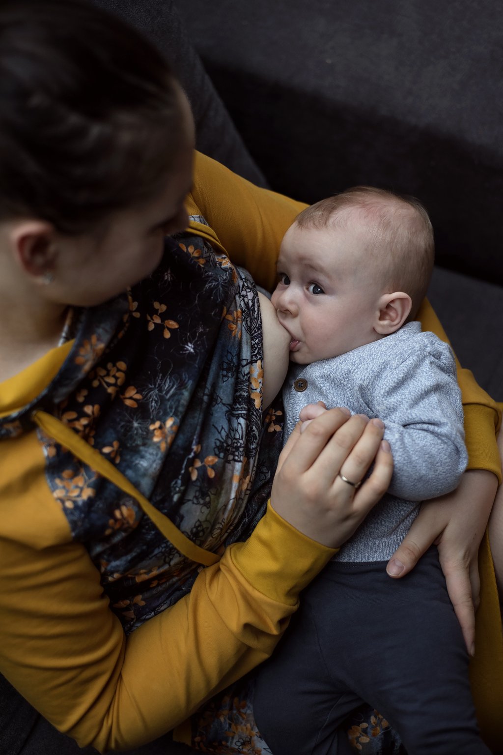 Kojení je zcela diskrétní díky dvojitému přednímu dílu, kdy se horní látka vyhrne nahoru a spodní naopak stáhne, čímž se vytvoří miminku potřebný prostor ke kojení. Horní díl šatů má pod prsy pružnou tkanici, která zabraňuje vytahání a následné odstávání namáhané části šatů.