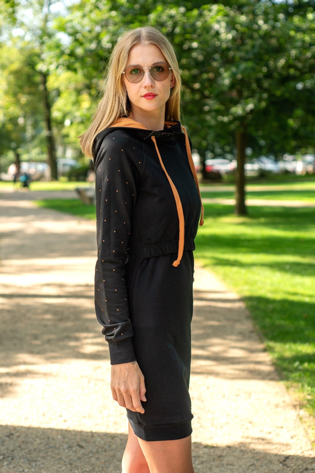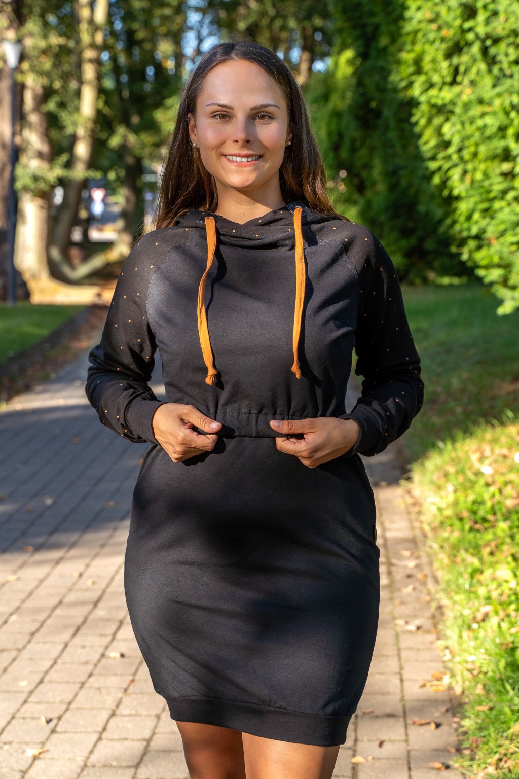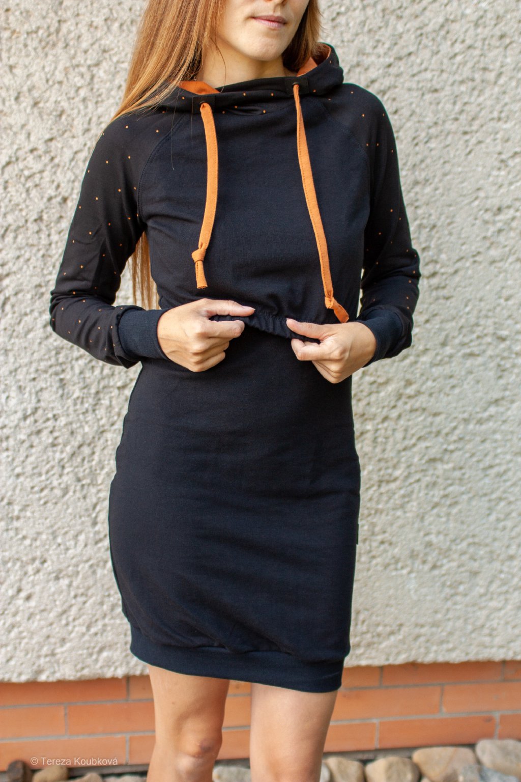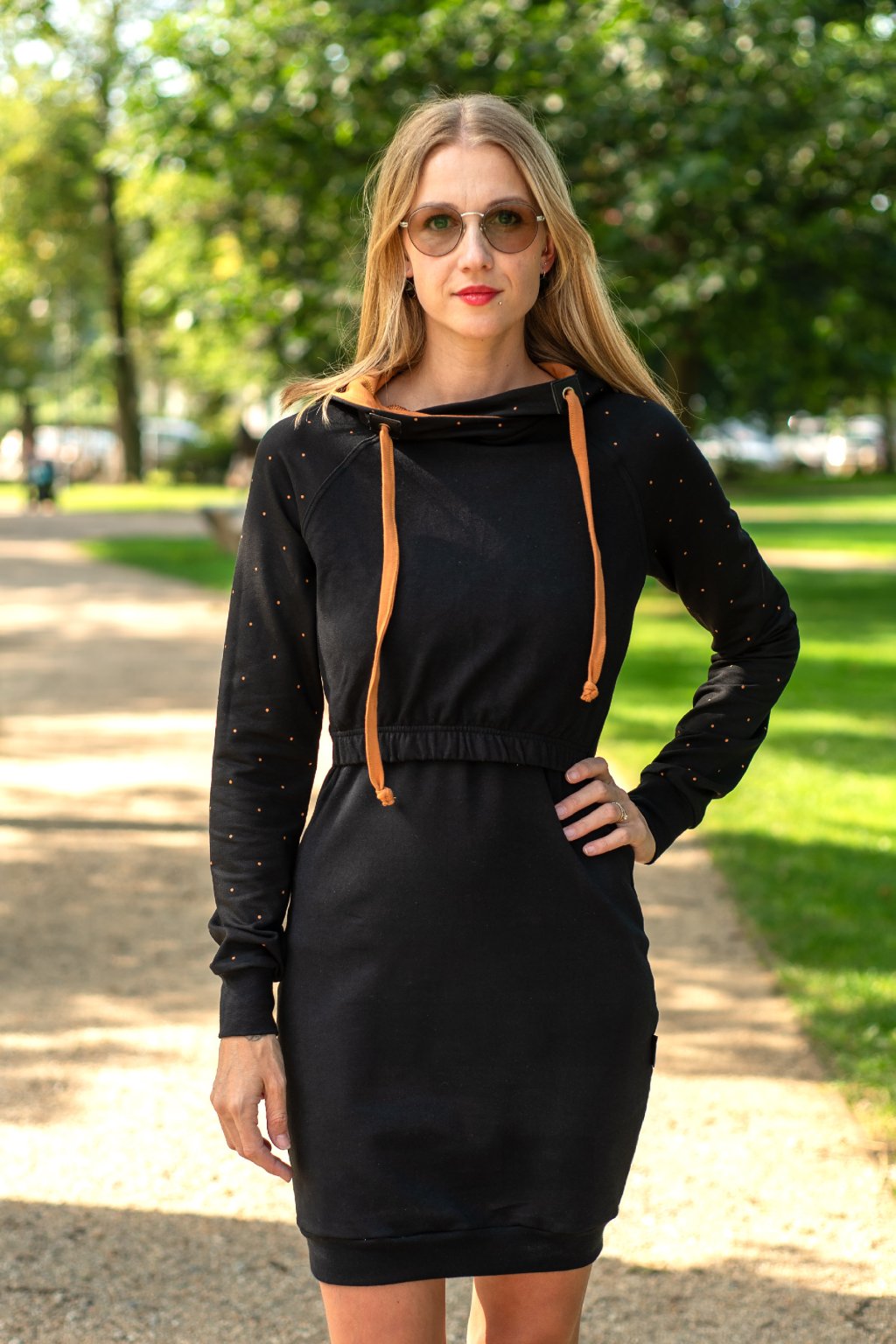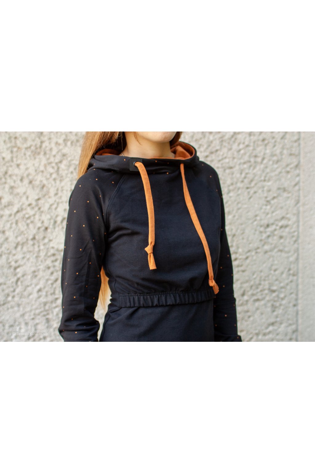 Mikinové šaty jsou do detailu promyšleny a sladěny do jednotného stylu. Mají velkou kapuci, která je ve stejném barevném provedení jako puntíky rukávů. Tyto volnočasové šaty se hodí k teniskám i na sportovní aktivity, ale perfektně ladí také s balerínami a kabelkou.