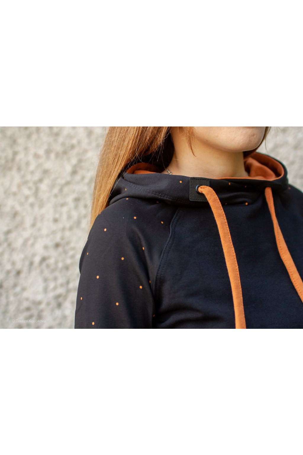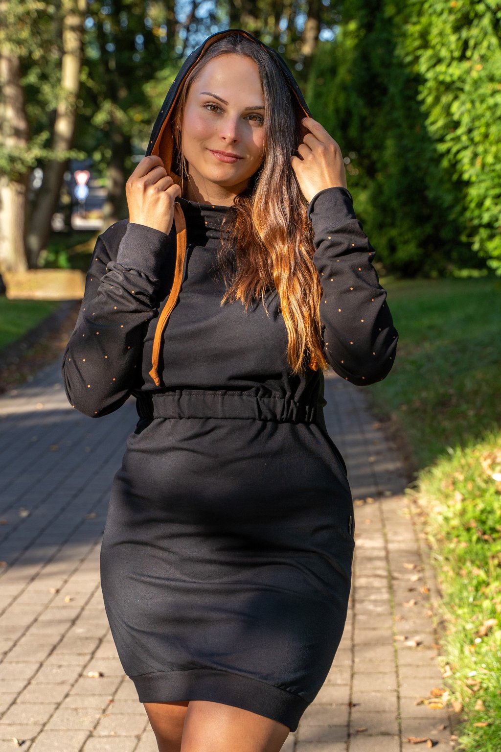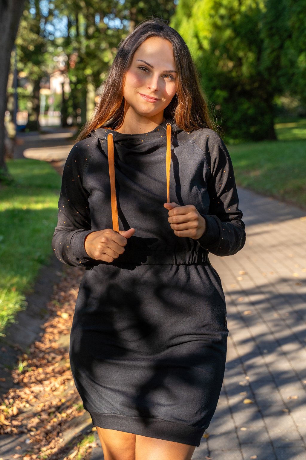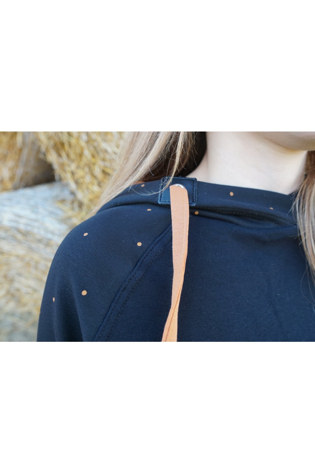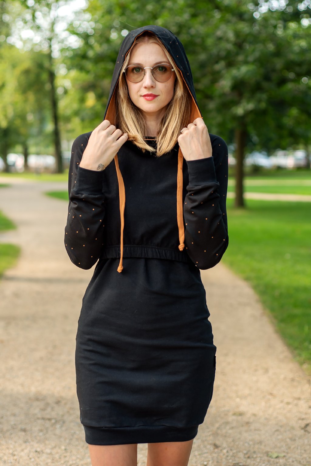 Mikinové šaty jsou do detailu promyšleny a sladěny do jednotného stylu. Mají velkou kapuci, která je ve stejném barevném provedení jako puntíky rukávů. Tyto volnočasové šaty se hodí k teniskám i na sportovní aktivity, ale perfektně ladí také s balerínami a kabelkou.