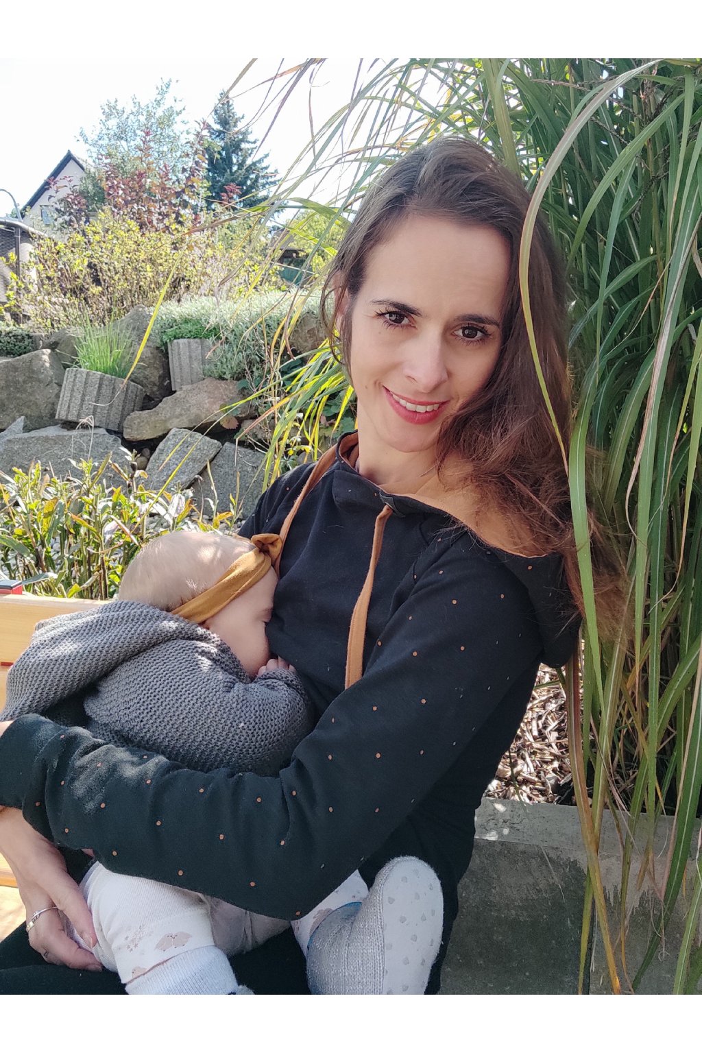 Kojení je zcela diskrétní díky dvojitému přednímu dílu, kdy se horní látka vyhrne nahoru a spodní naopak stáhne, čímž se vytvoří miminku potřebný prostor ke kojení. Horní i spodní látka má ve svém lemu všitou pohodlnou gumu, která zabraňuje vytahání a následné odstávání namáhané části šatů.