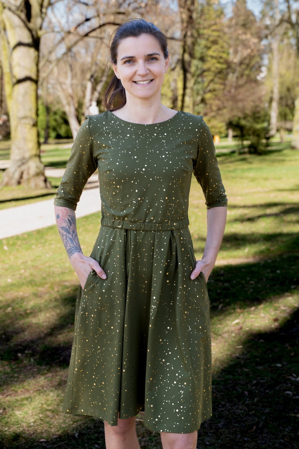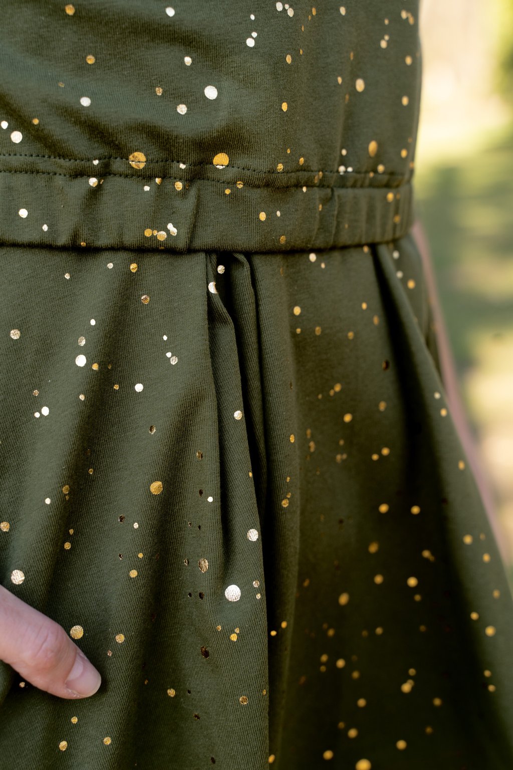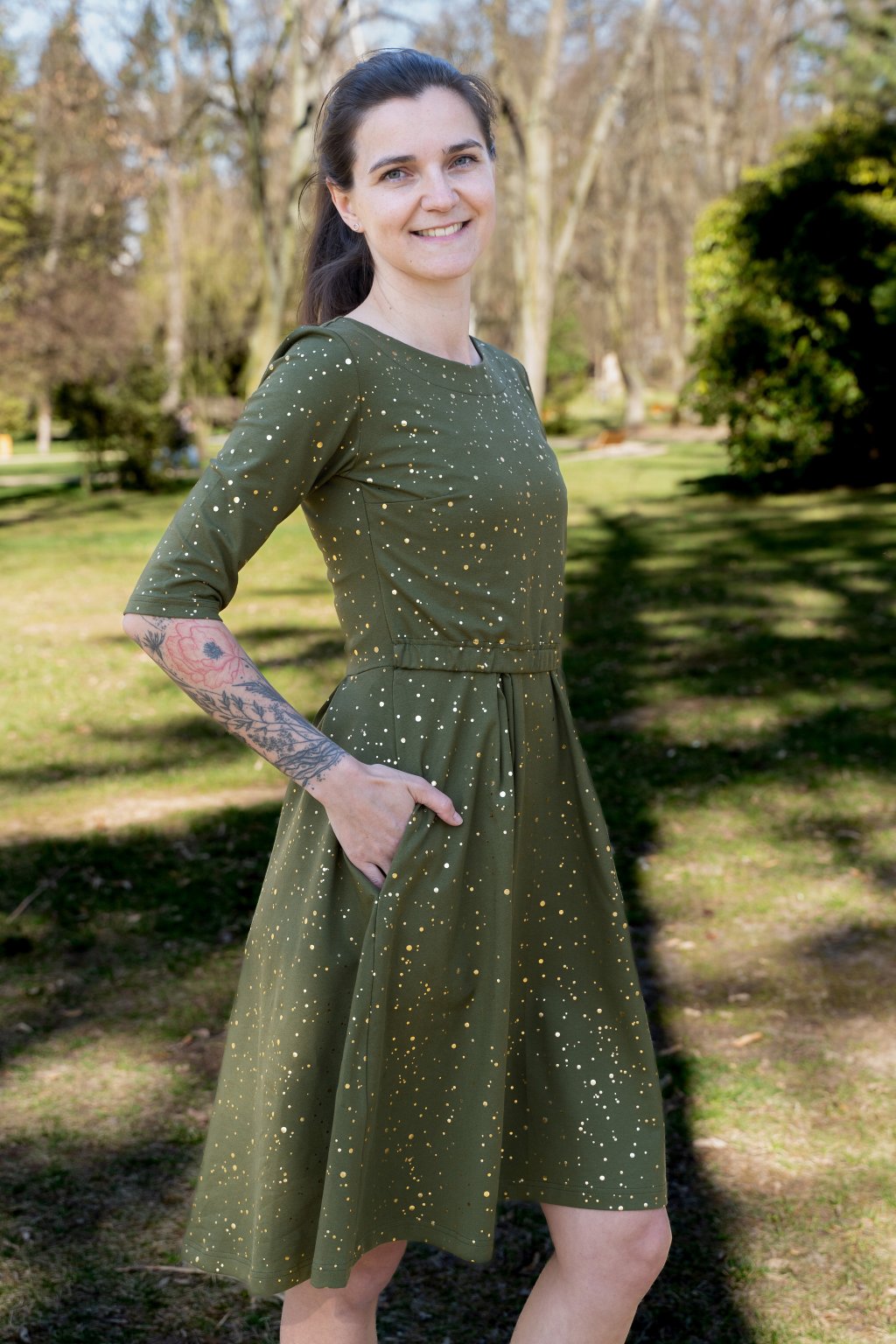 Khaki barva v sobě ukrývá stabilitu a zakořenění. Působí nenápadně, ale silně. A právě na jejím pozadí vyniknou drobné zlaté kapky – jako hvězdy, které se nebojí zazářit ani v tom nejhlubším tichu. Tato kombinace je jako stvořená pro ženu, která ví, kým je. Nemusí na sebe upozorňovat. Přesto v ní něco září. Vnitřní jiskra, která se nevnucuje, ale nelze ji přehlédnout. Pořiďte si šaty, které podtrhnou vaši ženskou sílu!