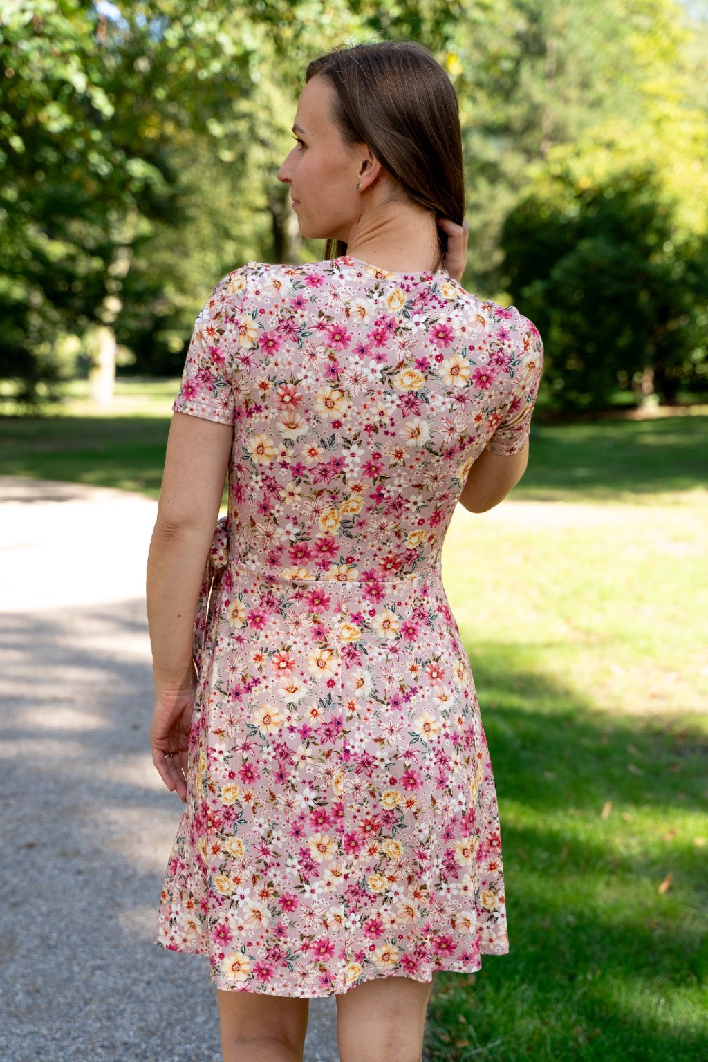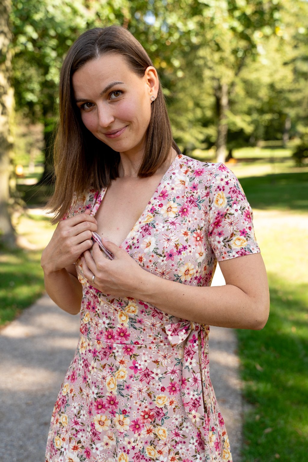 Ve vzdušných růžových šatech posetých romantickými květy pocítíte dotek léta a radosti. Žluté a růžové odstíny kvítků působí optimisticky, vesele, probudí ve vás dobrou náladu. Budete vidět krásu okolo sebe a užívat si jedinečné chvilky mateřství. Jako by vás obklopila aura štěstí. Dopřejte si tenhle krásný kousek, ve kterém doslova rozkvétá radost!