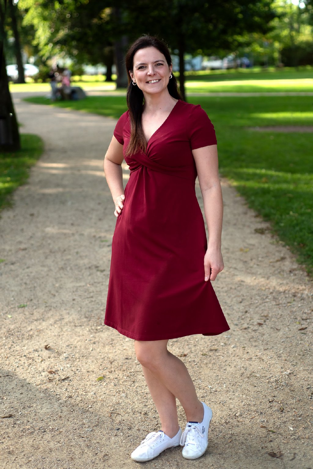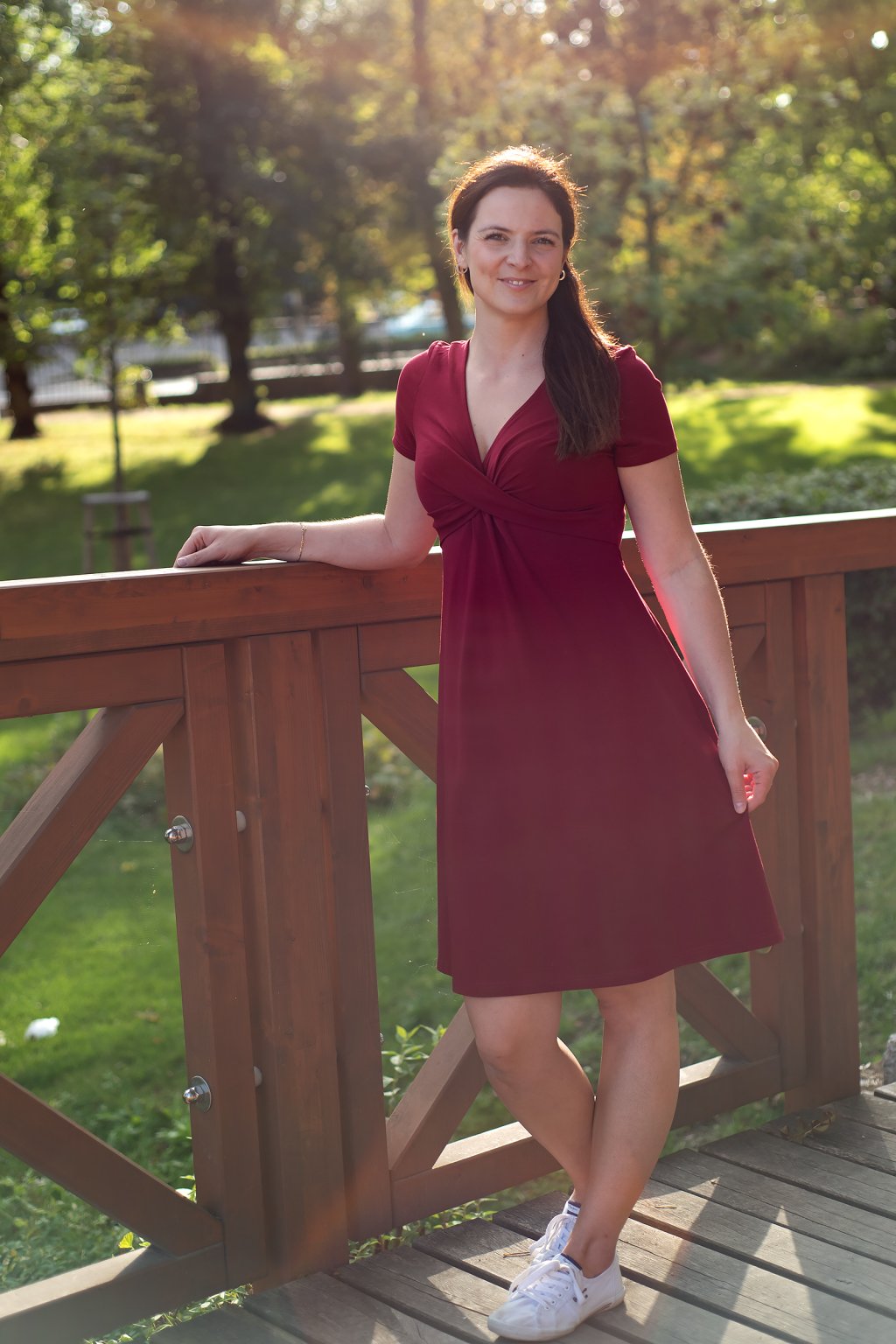 Buďte sebevědomou ženou a získejte s našimi šaty pocit sebejistoty. Náš jedinečný zeštíhlující střih šatů je navržen s ohledem na těhotenské i poporodní bříško a pohodlné kojení. Zavinovací výstřih s elegantním uzlem působí lichotivě a sedne i ženám s menšími ňadry. Lehké řasení pod prsy perfektně zakryje vše, co nemá být vidět a spolu s volnější áčkovou sukní, která začíná pod prsy, dodává celkově velmi ženský a štíhlý vzhled.