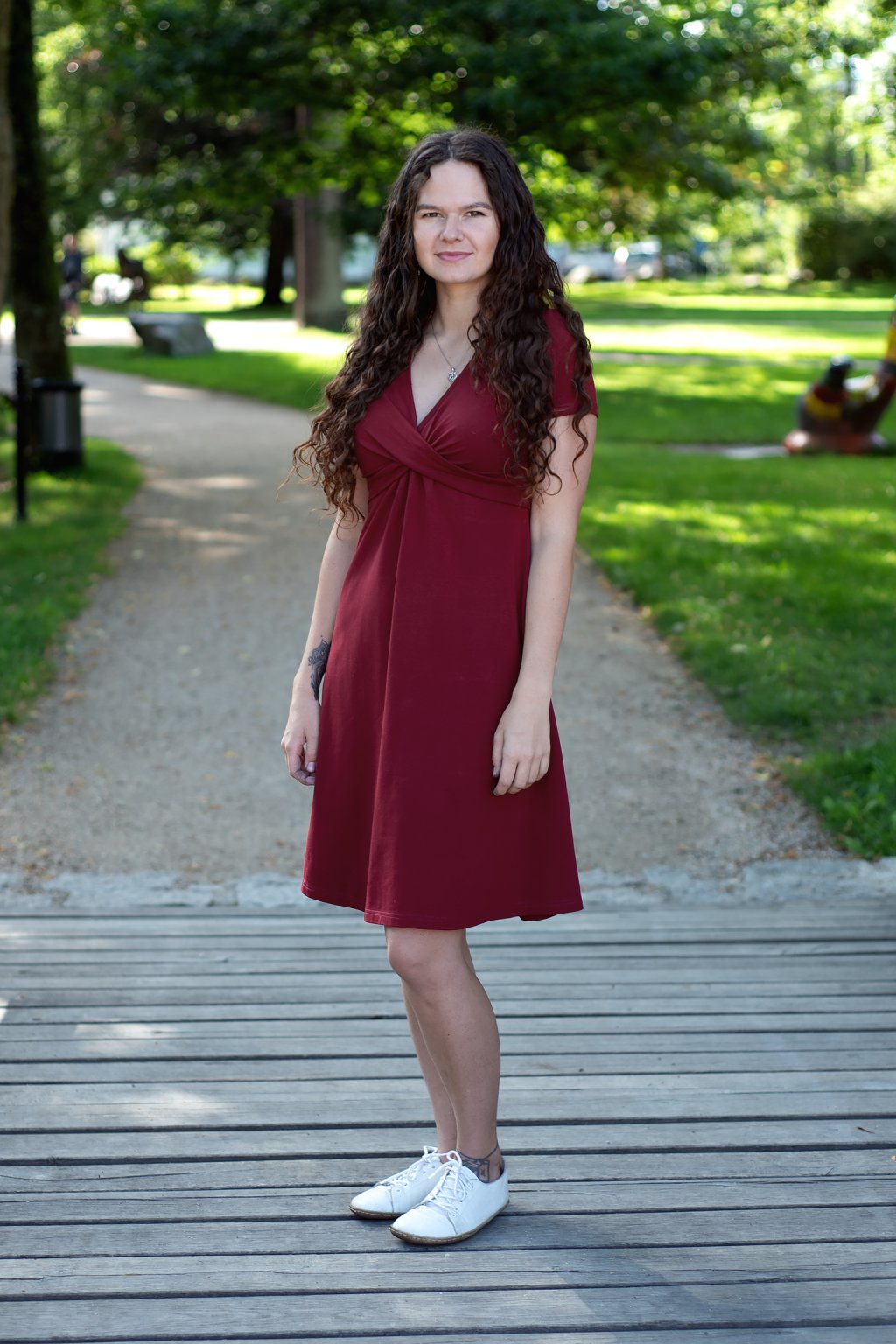 Šaty jsou vyrobeny z kvalitní bio bavlněné látky v nádherné bordó barvě, kterou lze jednoduše kombinovat s různými doplňky. Certifikace GOTS, jíž materiál disponuje, patří mezi nejpřísnější mezinárodní certifikáty pro zajištění ekologické čistoty výroby i konečného výrobku. Chrání životní prostředí, zajímá se o etiku zaměstnání, zakazuje dětskou práci, zajišťuje důstojné pracovní podmínky a použití výhradně bio textilií.