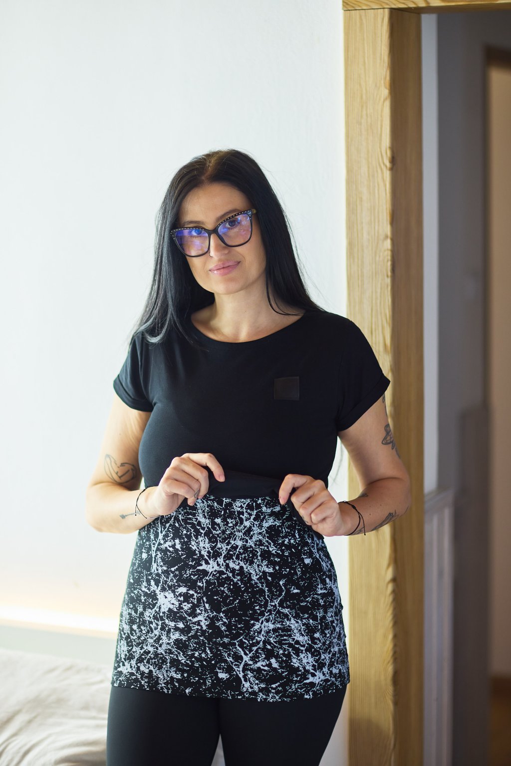 Kojící trička mají delší a pohodlný střih. Materiál je slabší úplet bavlna/elastan. Stačí odhrnout vrchní díl, pod kterým je hlubší výstřih, a vy tak můžete pohodlně a diskrétně nakojit. Horní díl je originálně střižený našikmo.