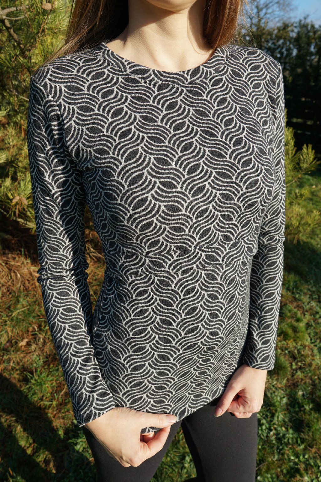 Naše funkční kojicí tričko je dokonalým propojením mateřství, pohybu a elegance. Jemný vlnkový vzor v černobílém provedení vytváří optický efekt, díky němuž model přitahuje pozornost, a zároveň si zachovává jemný, decentní look. Stylový design z trička dělá univerzální kousek, který se hodí na každodenní nošení, na sport a během chladných podzimních dnů si ho můžete obléknout i do kina nebo na milé setkání s přáteli. 🥂
