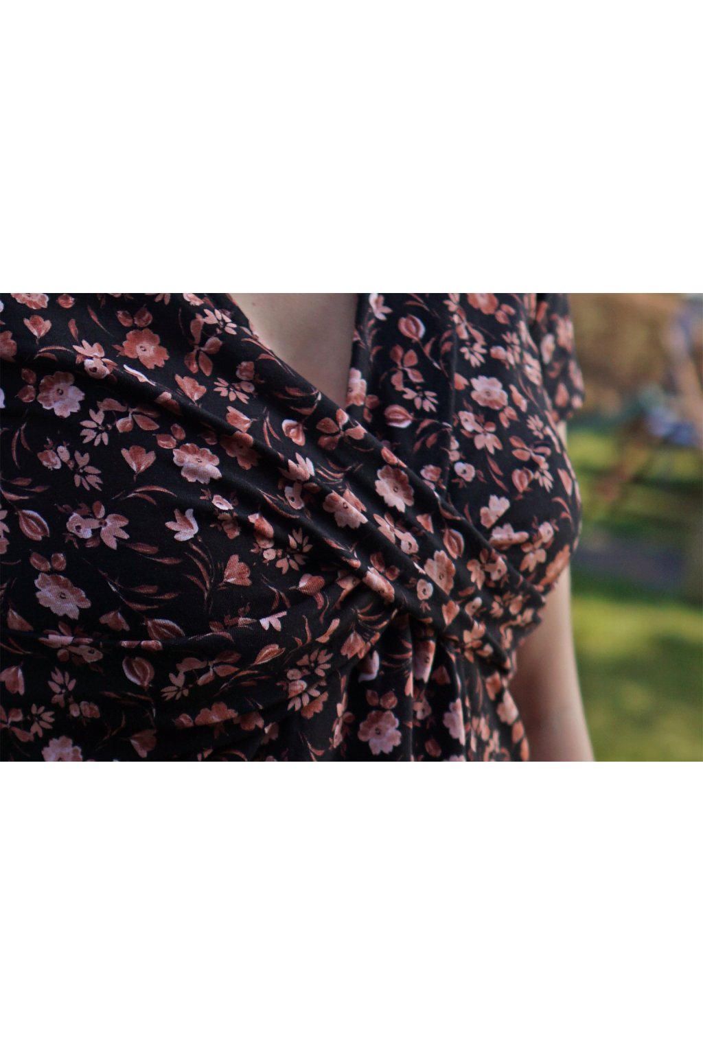 Zvolený květinový vzor na tmavém pozadí je jemný, ale i praktický, protože snadno skryje nejrůznější skvrny, o které v kontaktu s miminkem nebývá nouze. V našem bavlněném kojicím tričku se bude cítit naprosto úžasně.