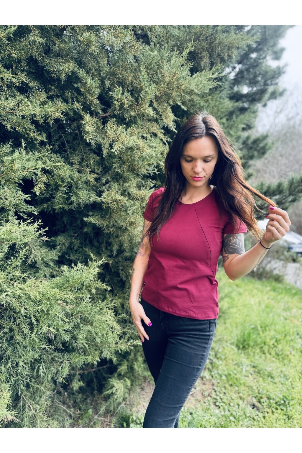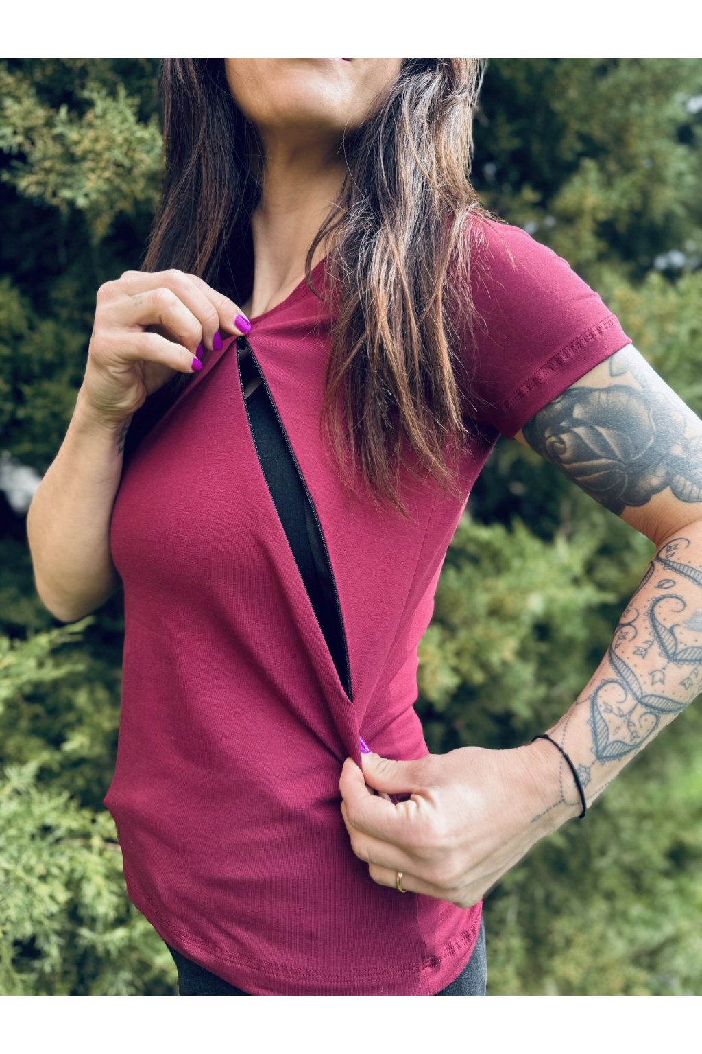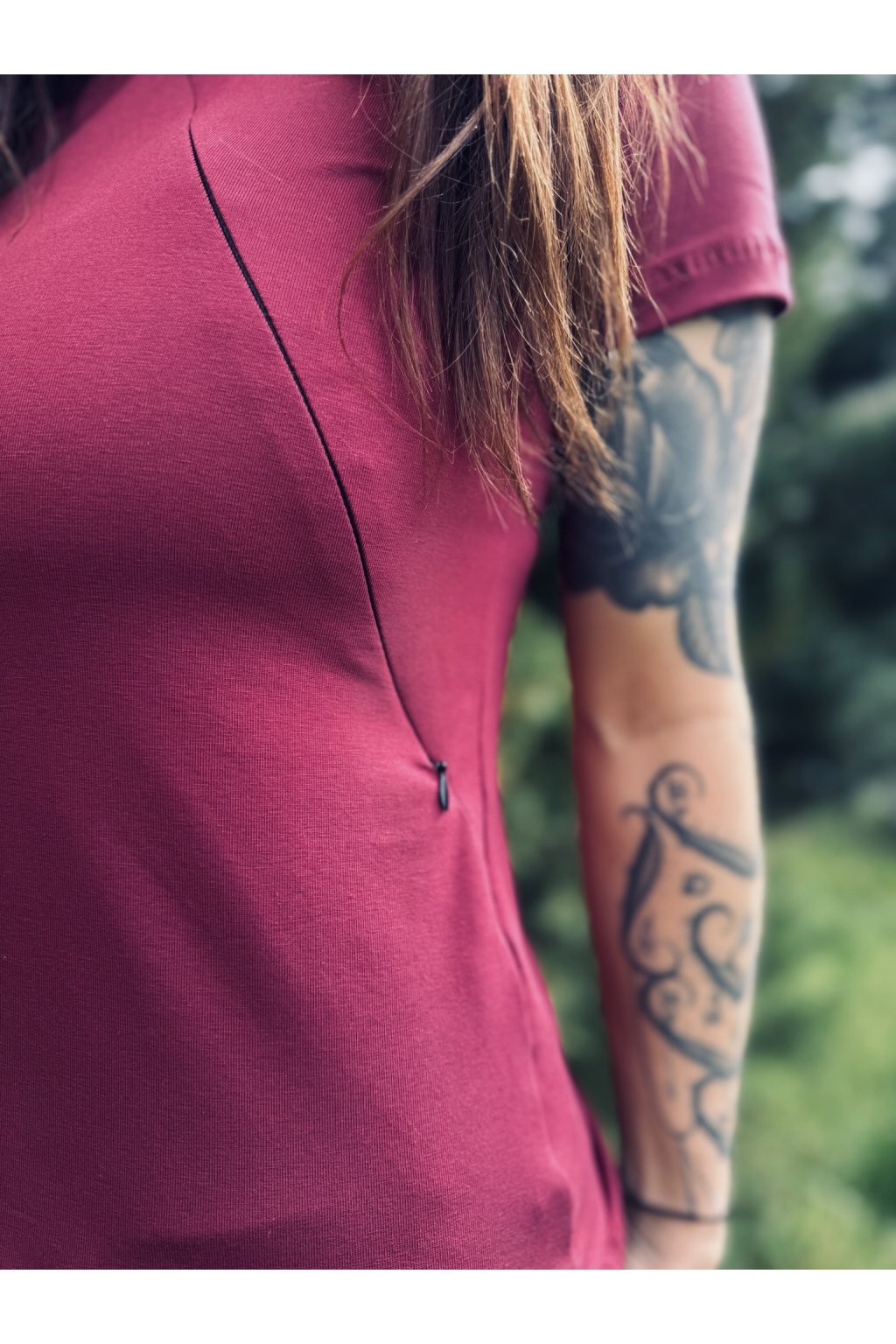 Tričko je ušité ze silnějšího vínového bavlněného úpletu s elastanem. Přes prsa má skryté zipy, skrz které můžete diskrétně nakojit. Tričko není dlouhé, takže se dá zastrčit do kalhot, sukní nebo kraťasů.