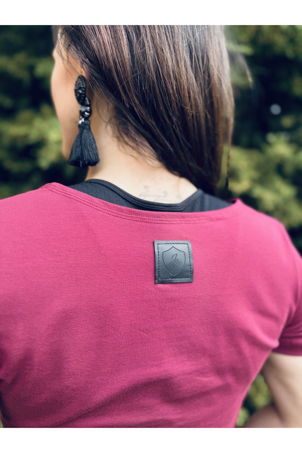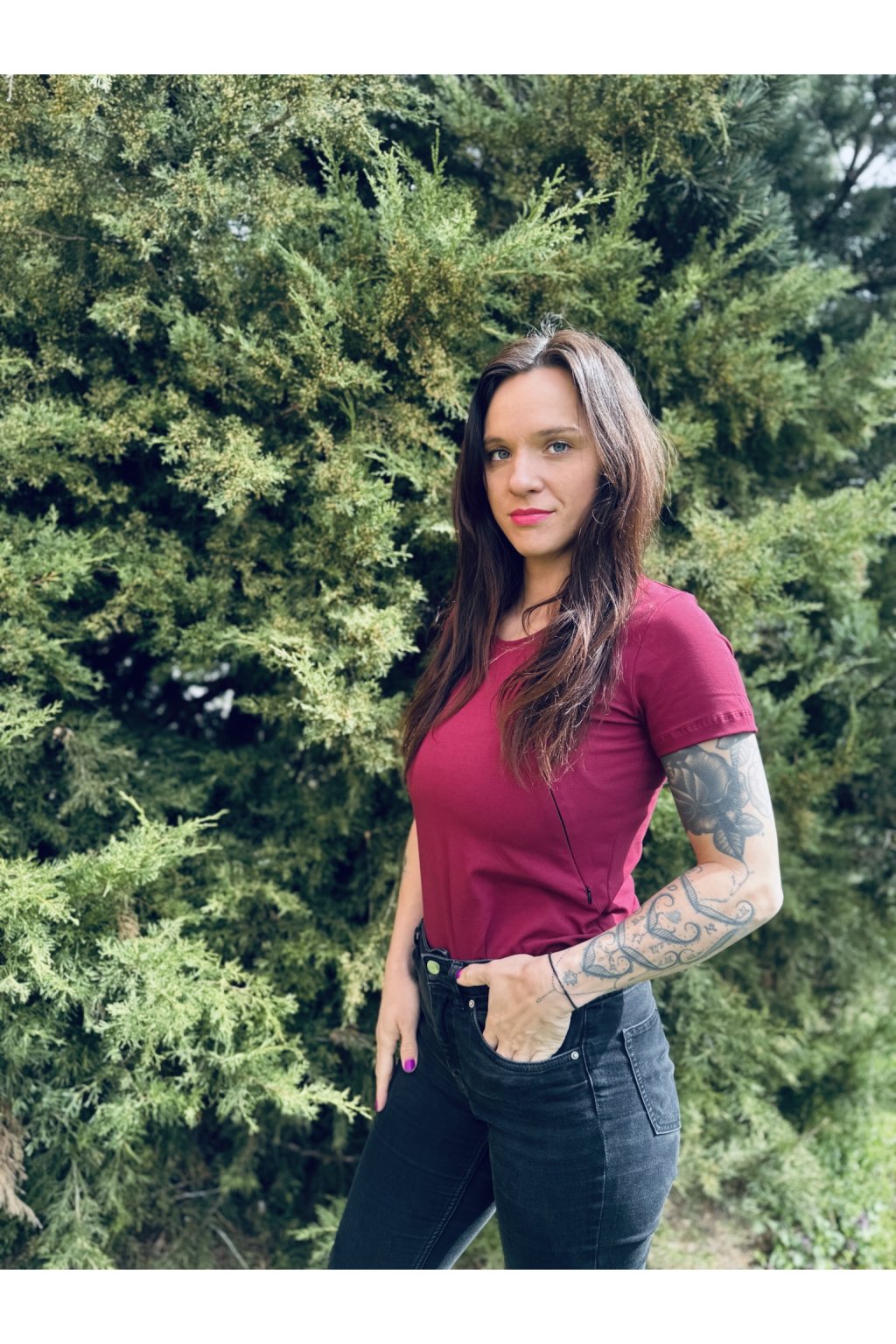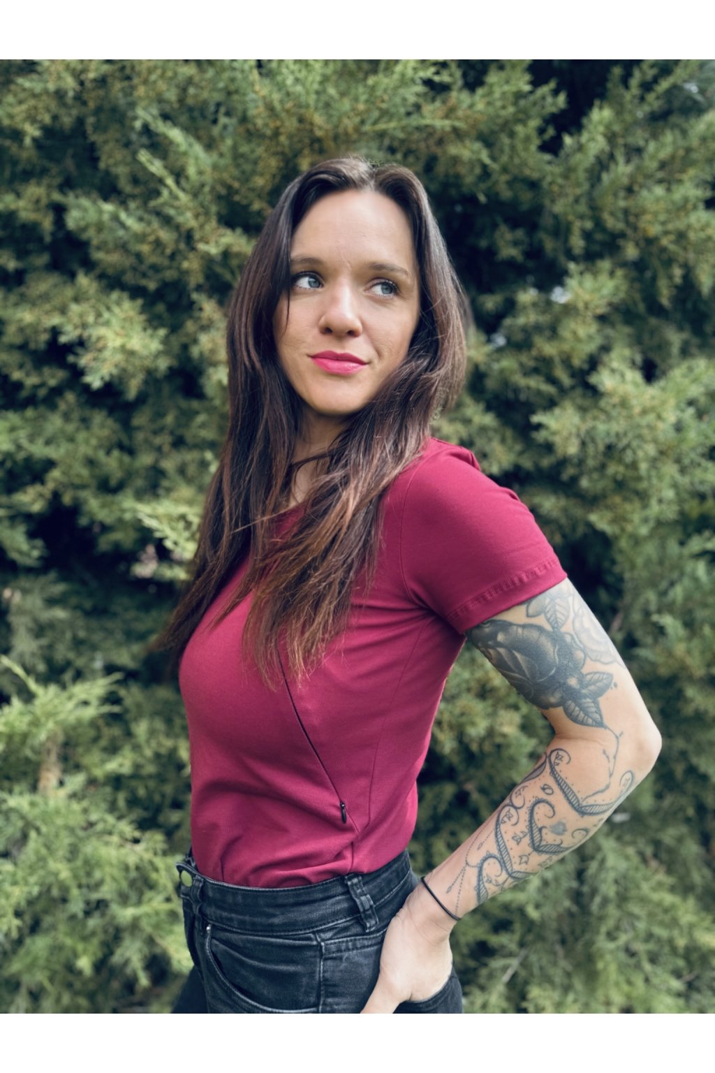 Tričko je ušité ze silnějšího vínového bavlněného úpletu s elastanem. Přes prsa má skryté zipy, skrz které můžete diskrétně nakojit. Tričko není dlouhé, takže se dá zastrčit do kalhot, sukní nebo kraťasů.