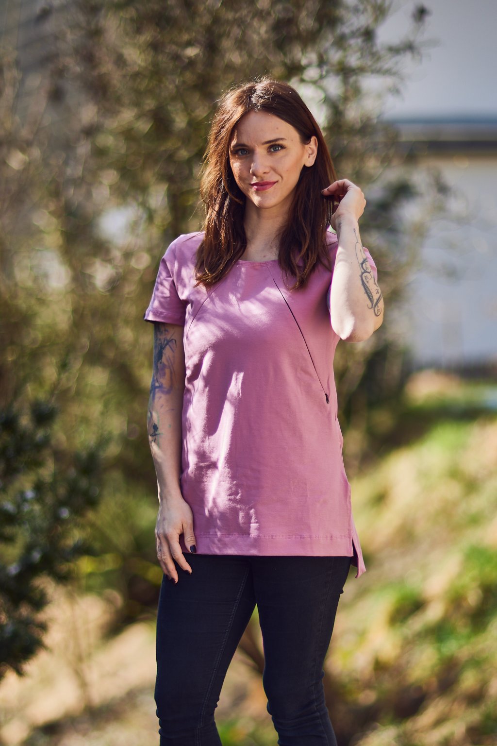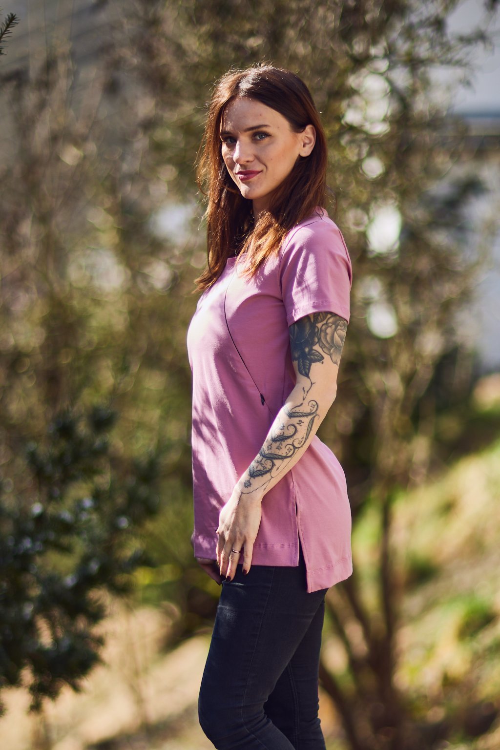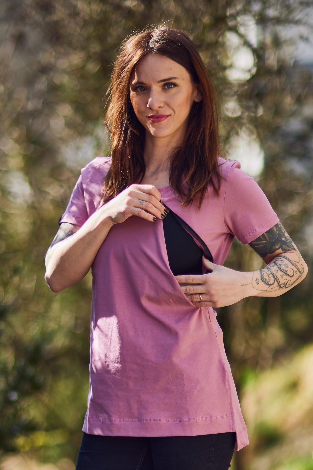 Tričko je ušité ze silnějšího tmavě růžového bavlněného úpletu s elastanem. Přes prsa má skryté zipy, skrz které můžete diskrétně nakojit. Po stranách dole jsou dva rozparky. Tričko se dá krásně nosit, i když nekojíte :)