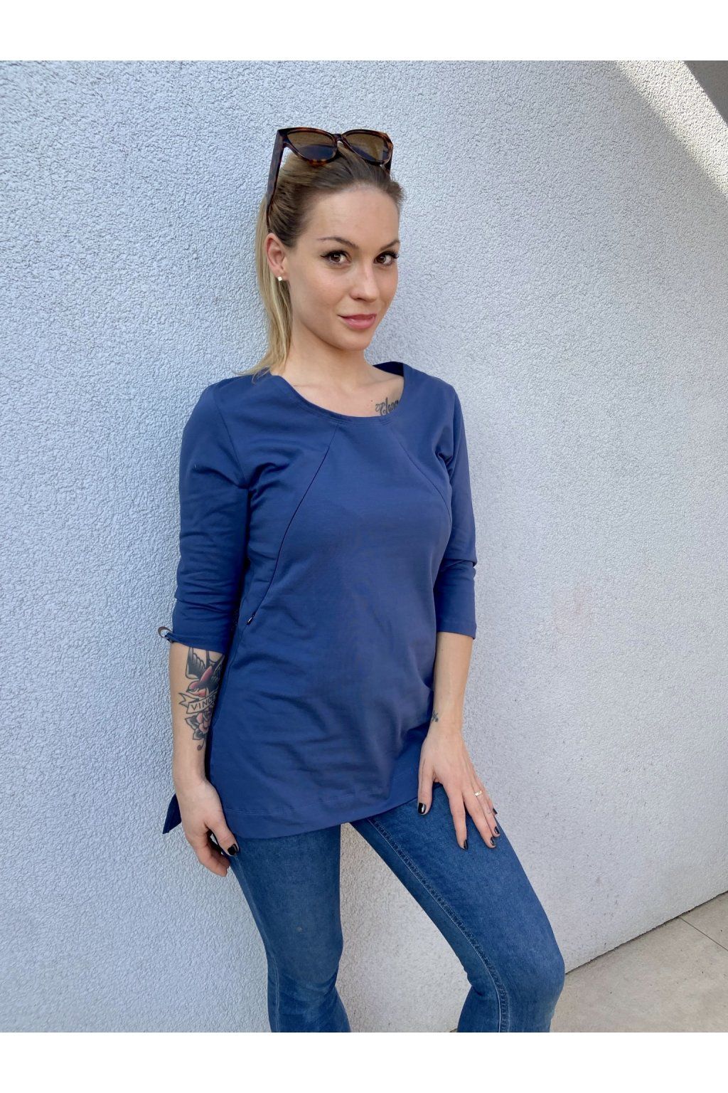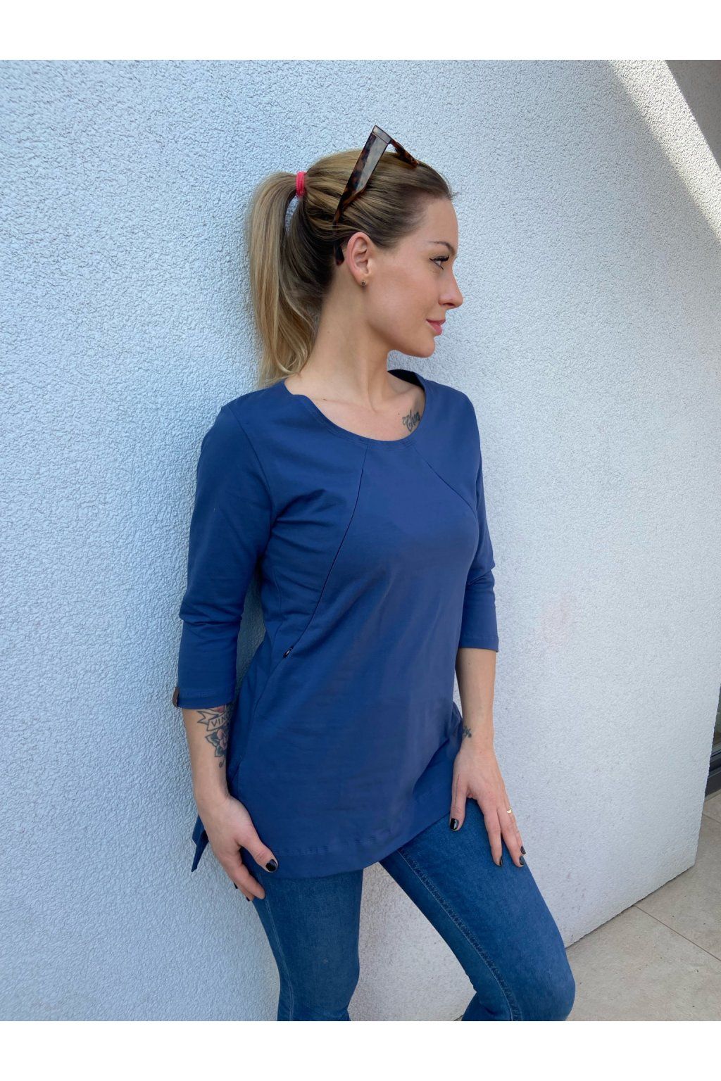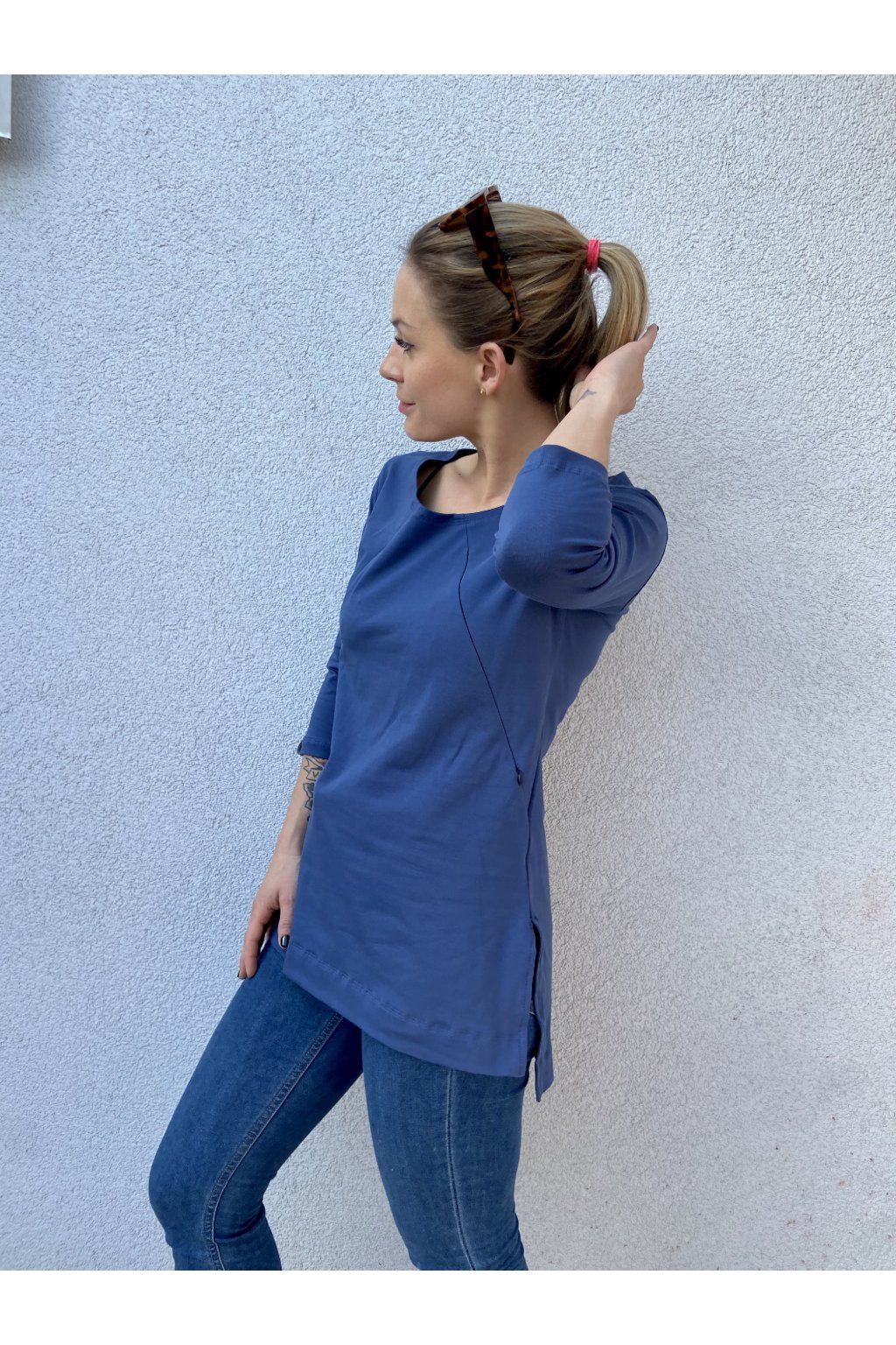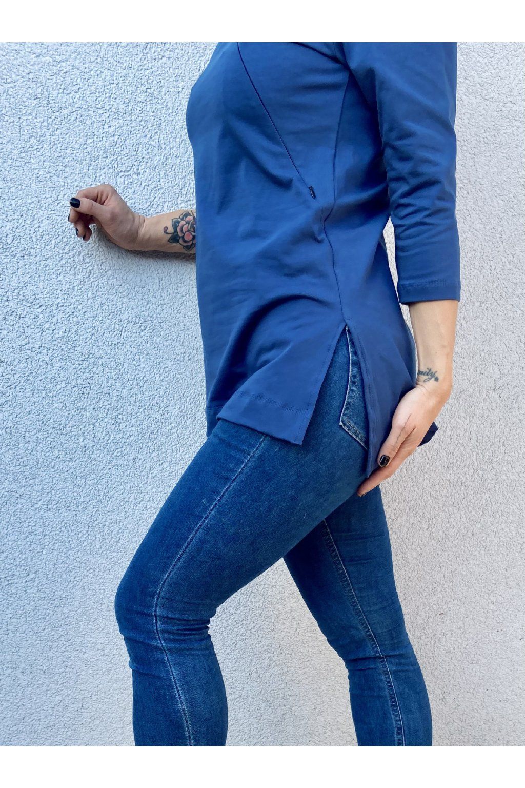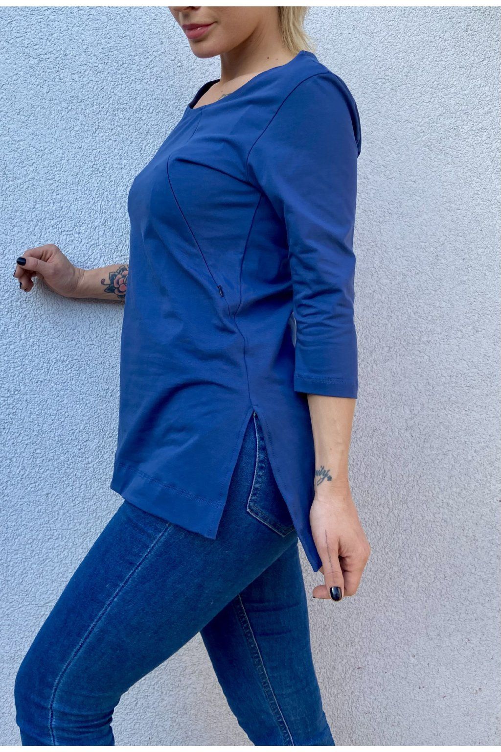 Tričko je ušité ze silnějšího modrého bavlněného úpletu s elastanem. Přes prsa má skryté zipy, skrz které můžete diskrétně nakojit. Po stranách dole jsou dva rozparky. Tričko se dá krásně nosit, i když nekojíte :)
