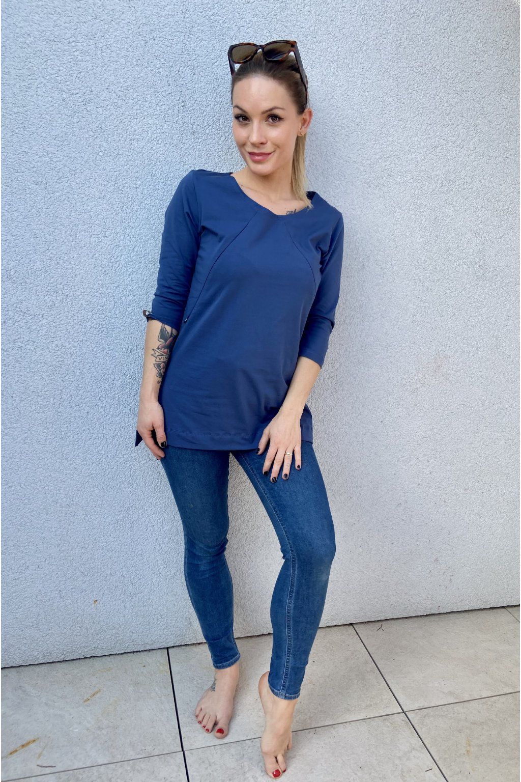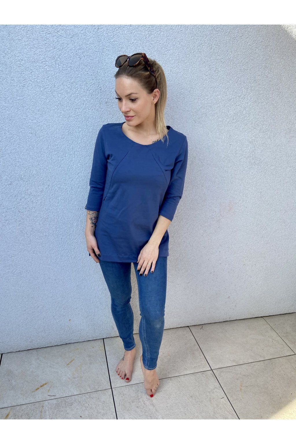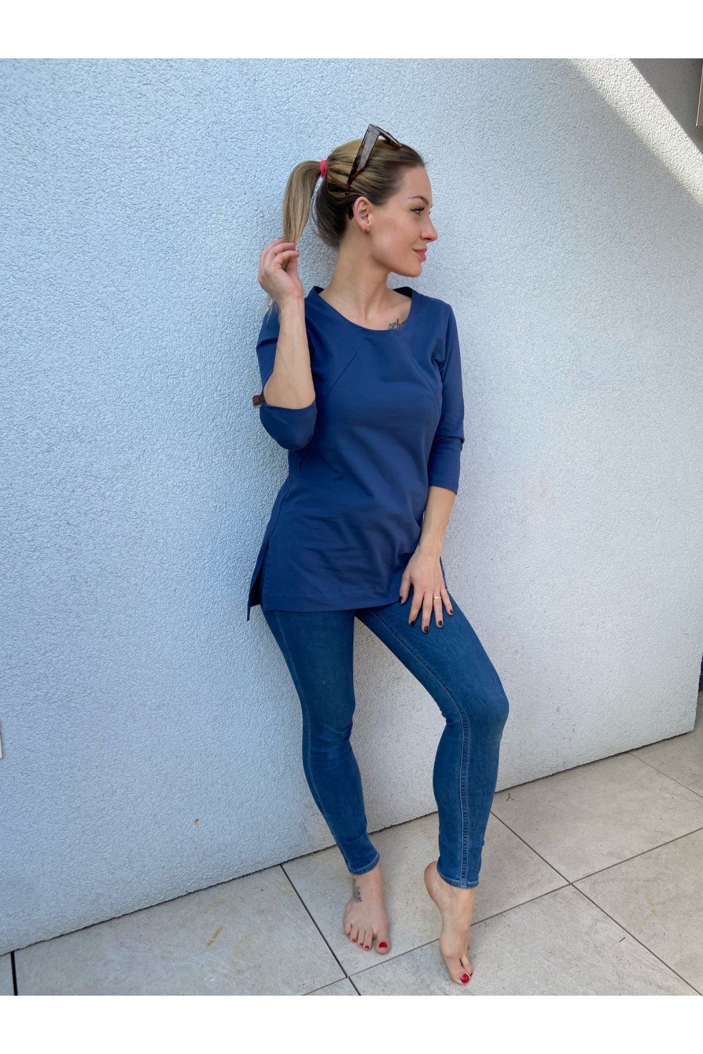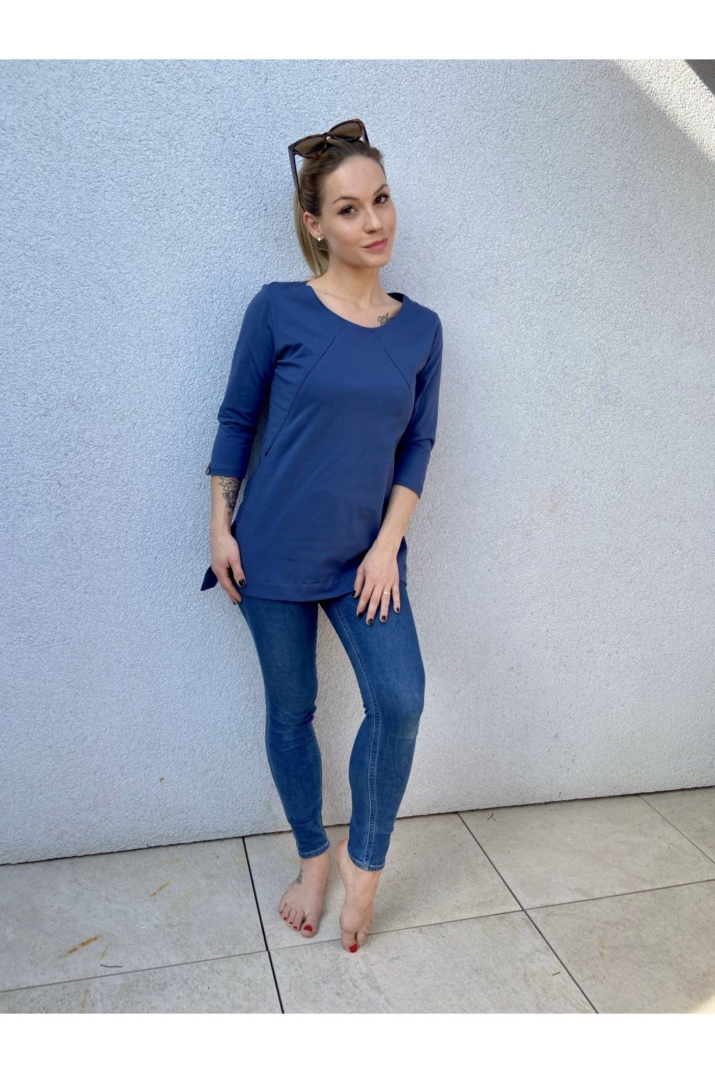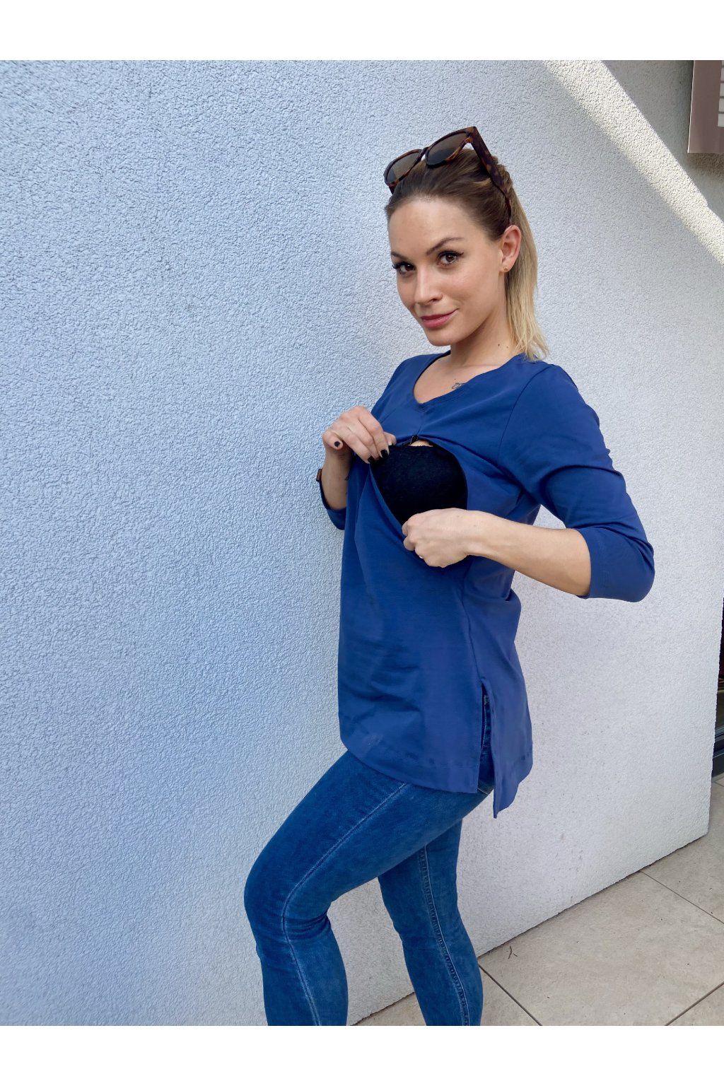 Tričko je ušité ze silnějšího modrého bavlněného úpletu s elastanem. Přes prsa má skryté zipy, skrz které můžete diskrétně nakojit. Po stranách dole jsou dva rozparky. Tričko se dá krásně nosit, i když nekojíte :)