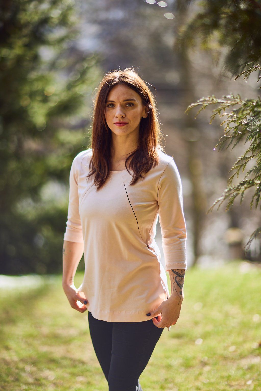 Tričko je ušité ze silnějšího bavlněného úpletu s elastanem. Přes prsa má skryté zipy, skrz které můžete diskrétně nakojit. Po stranách dole jsou dva rozparky. Tričko se dá krásně nosit, i když nekojíte :)