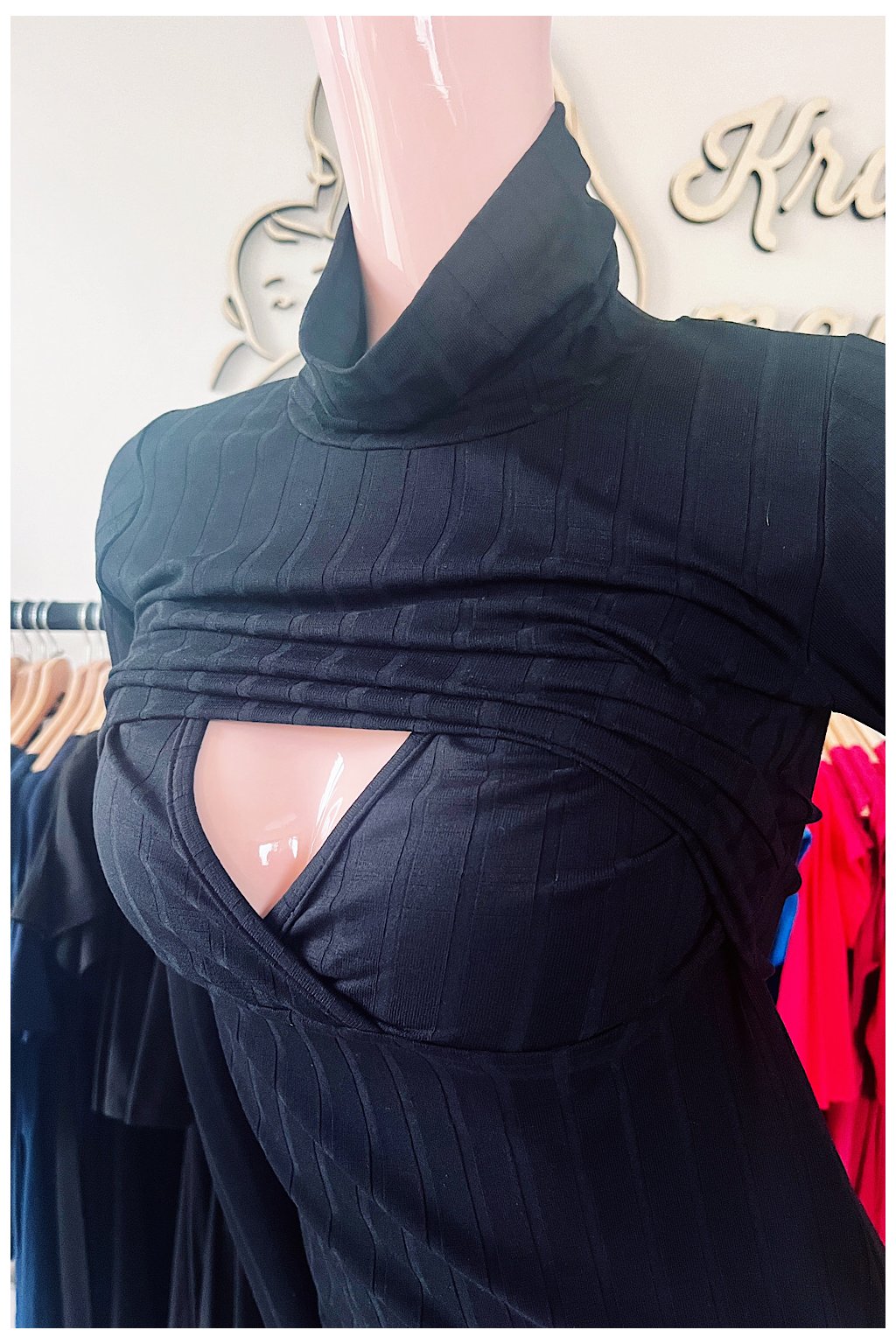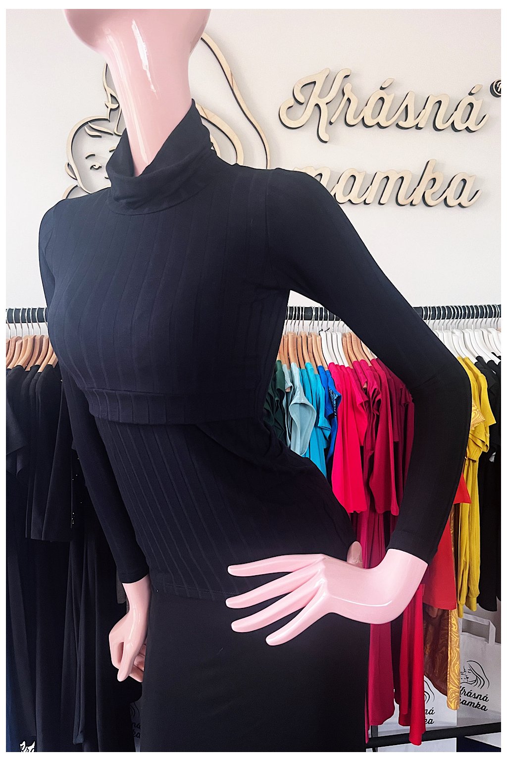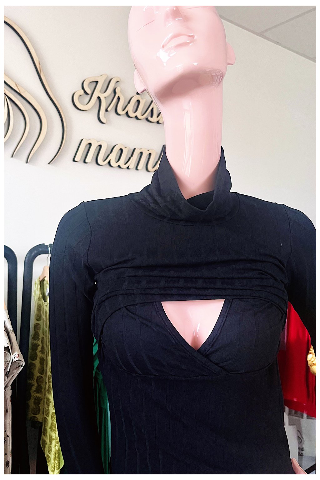 3) Vysoký roláčkový výstřih je minimalistický, decentní a bude Vám skvěle sloužit při nošení miminka. Mezi Vámi a miminkem je příjemná vrstva, díky níž se miminko nepřilepí na hrudník a bude tak spokojeně a déle odpočívat.