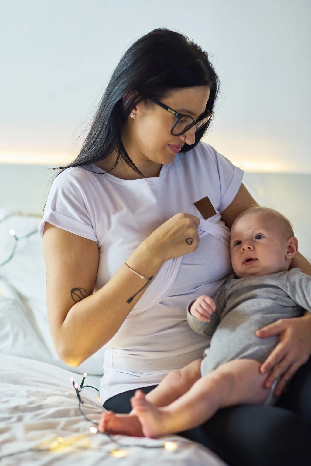 Kojící trička mají delší a pohodlný střih. Materiál je slabší úplet bavlna/elastan. Stačí odhrnout vrchní díl, pod kterým je hlubší výstřih, a vy tak můžete pohodlně a diskrétně nakojit. Horní díl je originálně střižený našikmo.