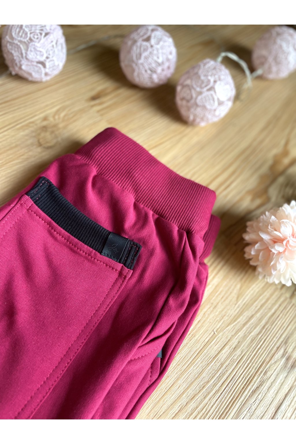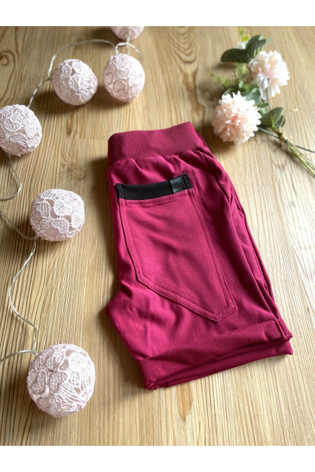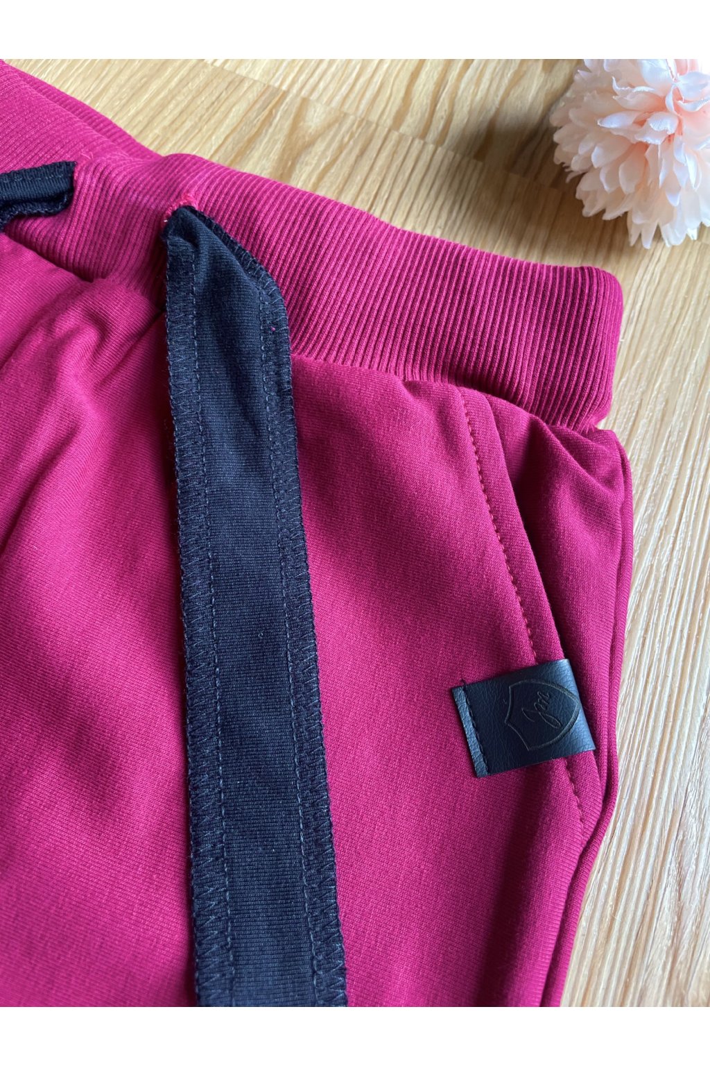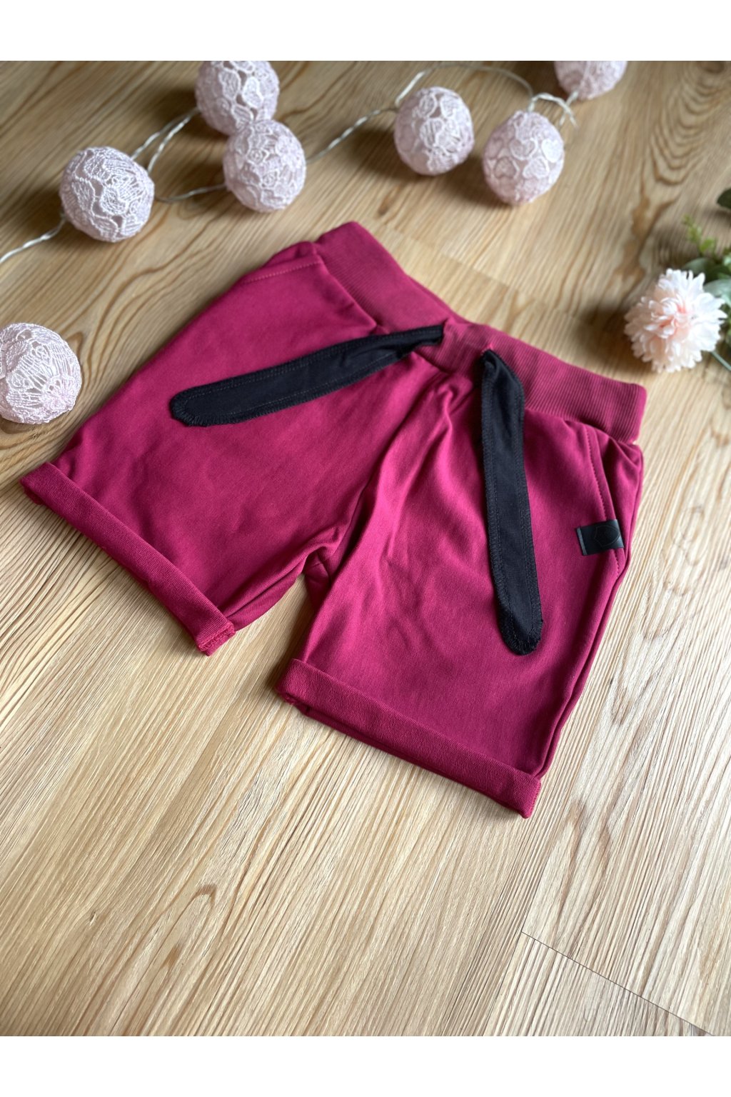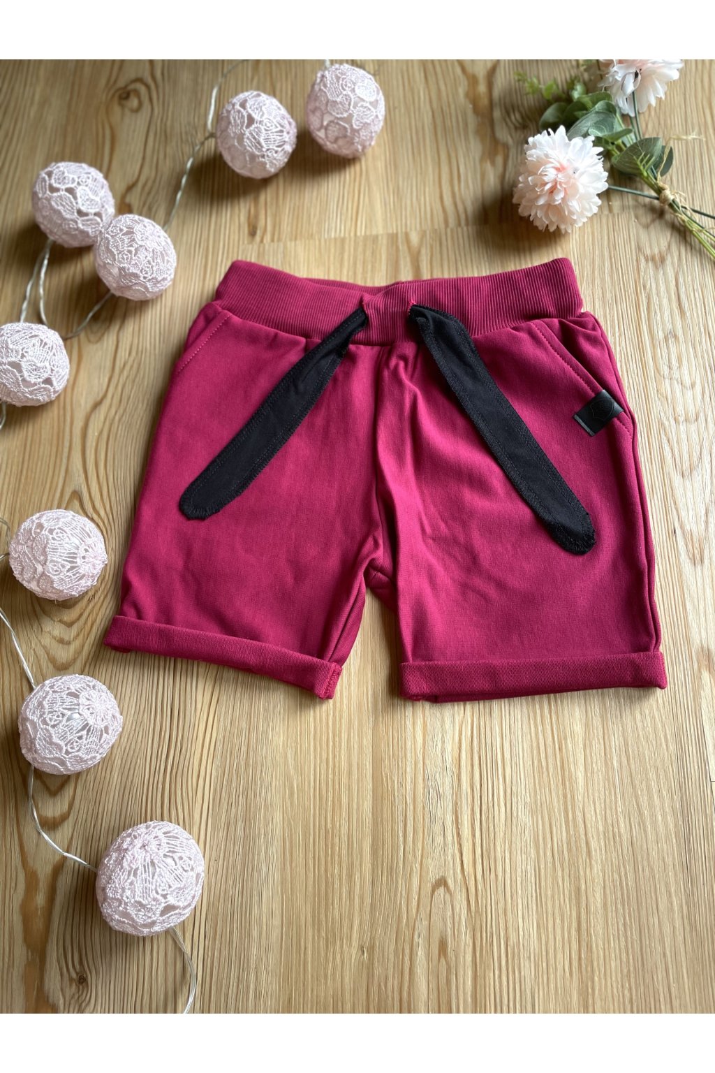 Kraťasy jsou z příjemné růžové teplákoviny. V pase jsou na gumu, mají černou úpletovou tkanici a vzadu dvě kapsy.