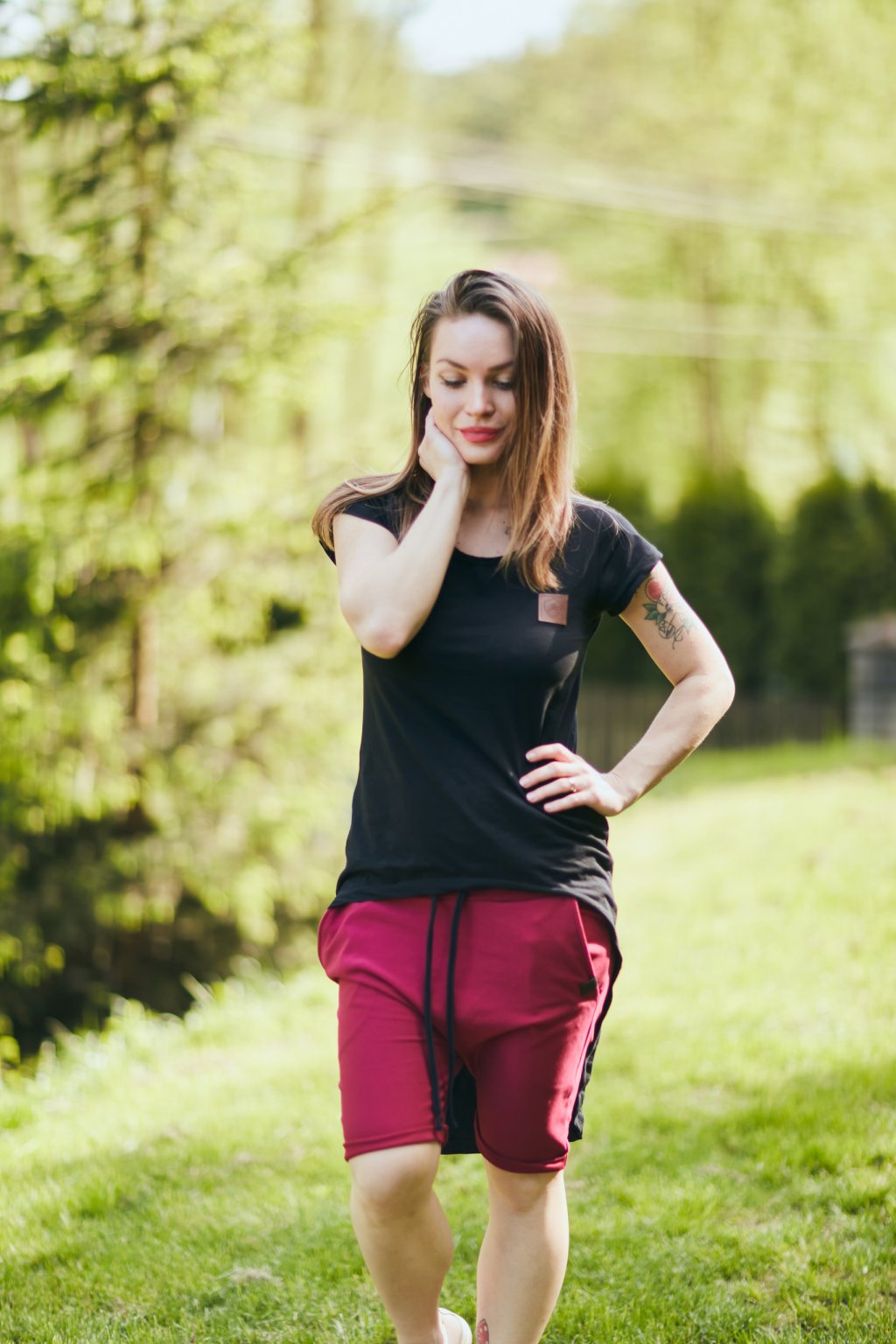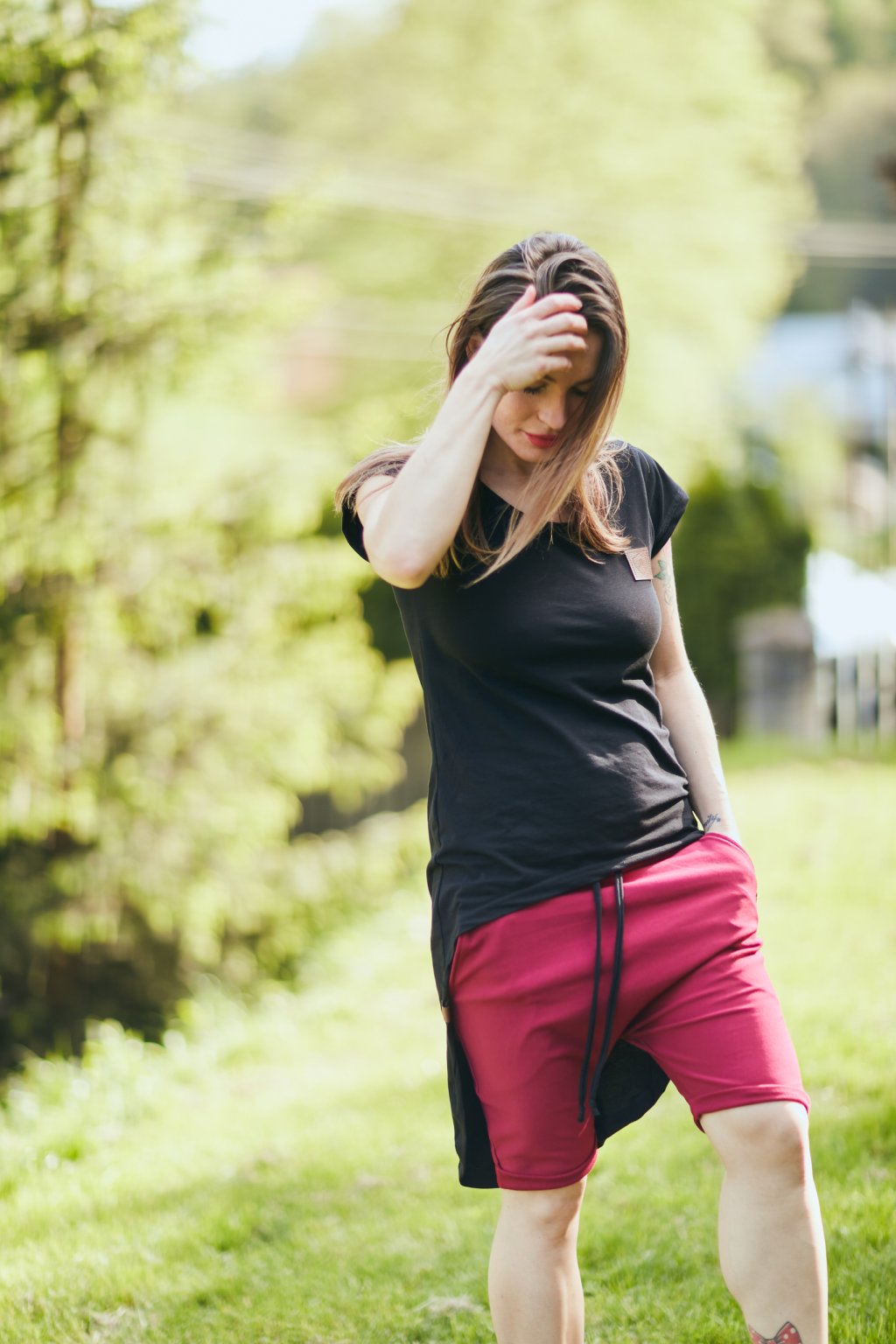 Kraťasy jsou z příjemné růžové teplákoviny. V pase jsou na gumu, mají černou úpletovou tkanici a vzadu dvě kapsy.