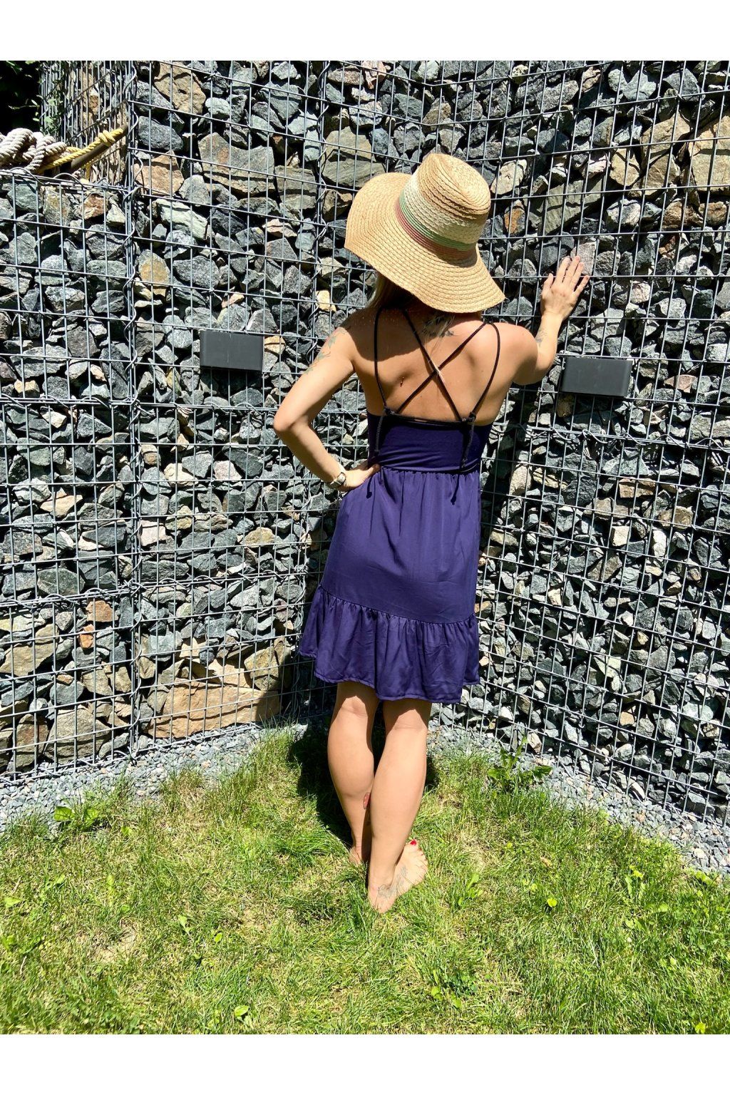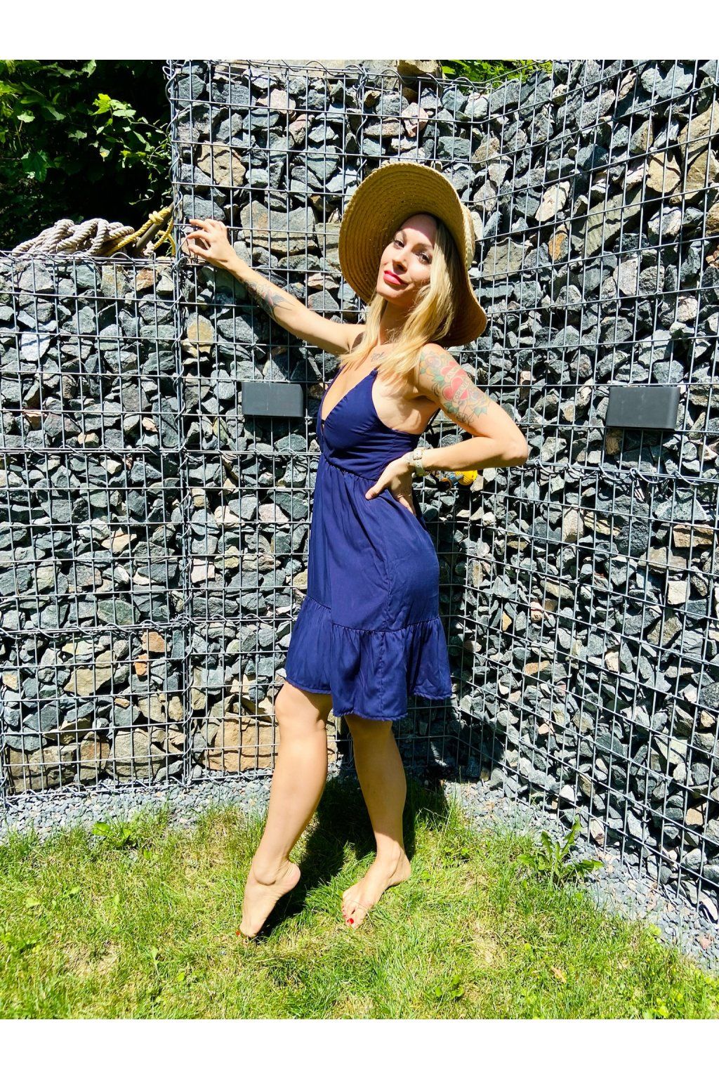 Šaty jsou ušité z lehoučké tkané viskózy v tmavě modré barvě.