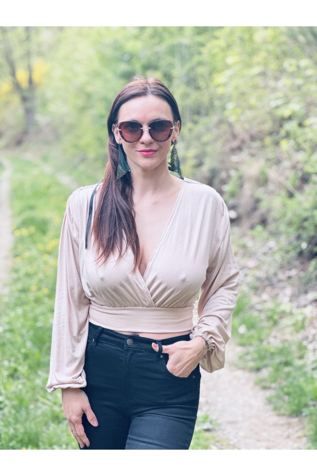 Přední díl je překřížený, vzadu má hluboký výstřih do V. Rukávy jsou volné, stažené do gumičky. Na ramenou je řasení, kterým prochází černá saténová stužka k zavázání za krkem. V pase je stažený páskem ze stejného materiálu. CROP TOP je z našeho oblíbeného letního materiálu, je maximálně pohodlný a sexy. Hodí se na různé společenské příležitosti, ale i na běžné nošení. Určitě si ho zamilujete.
