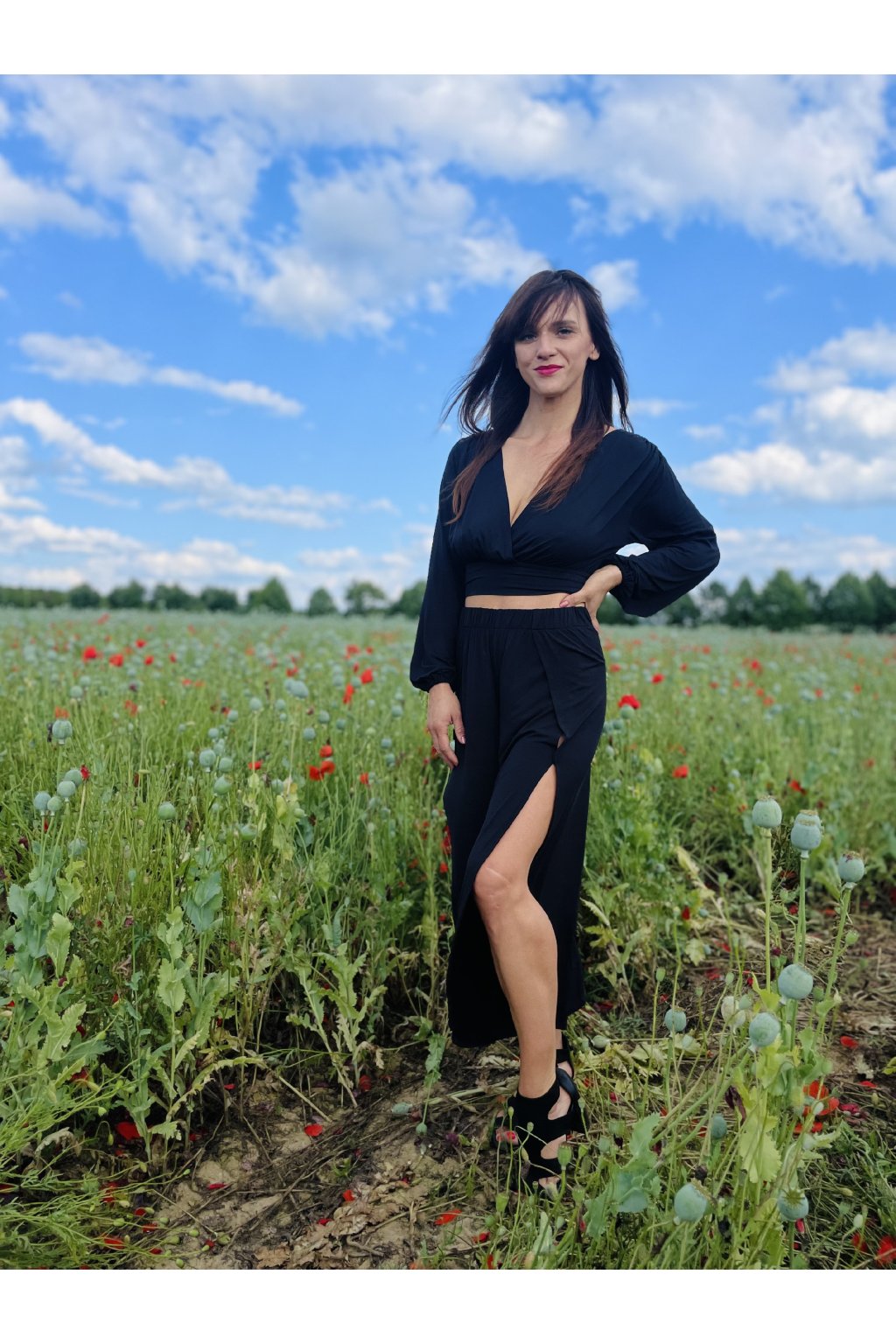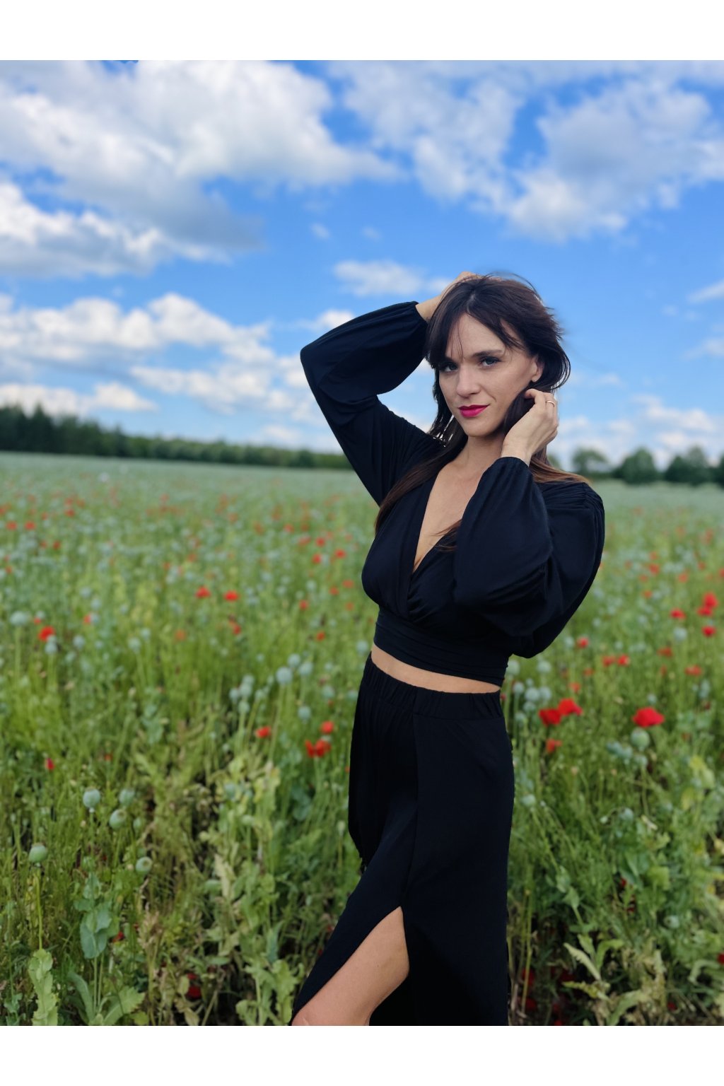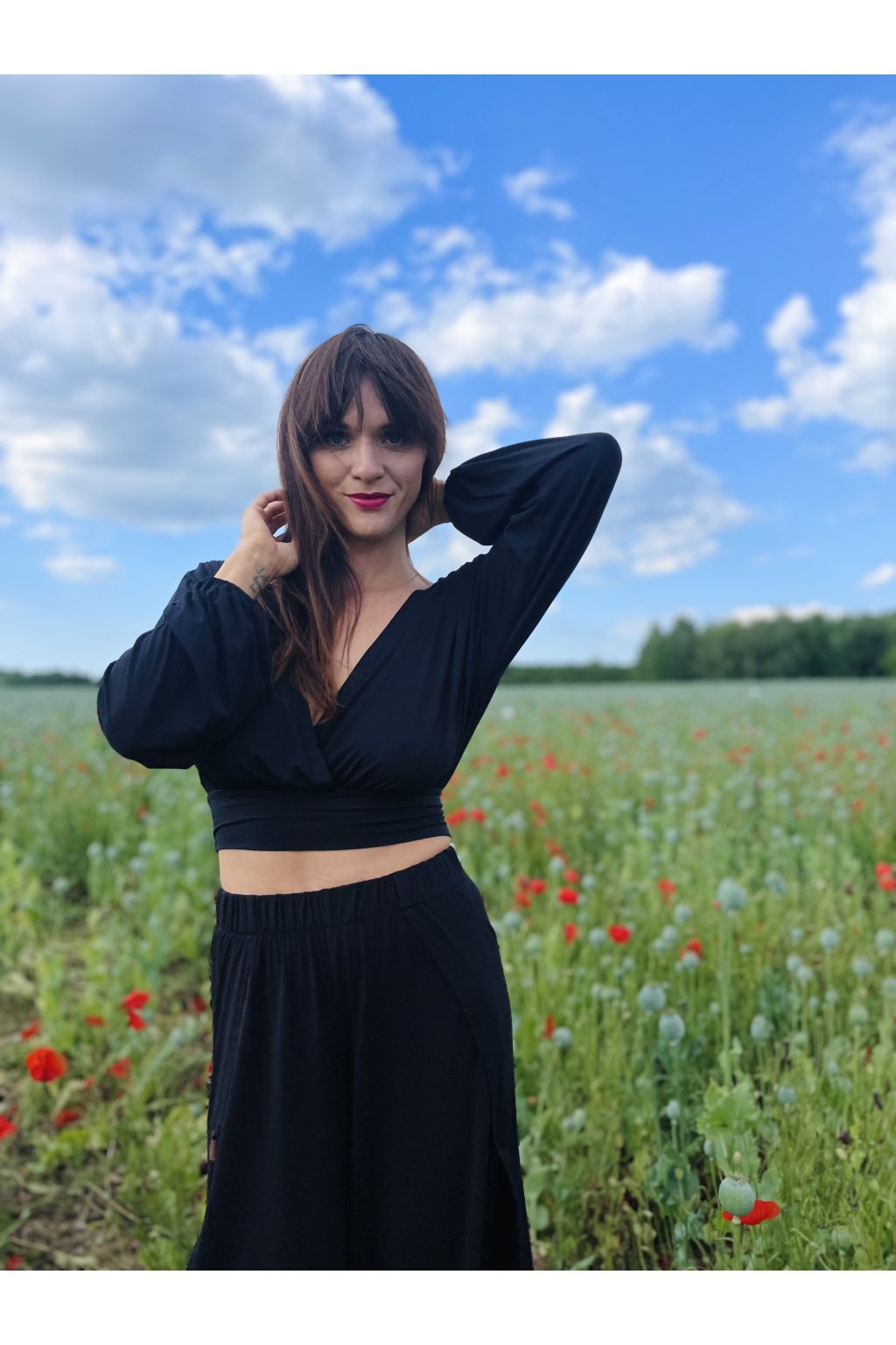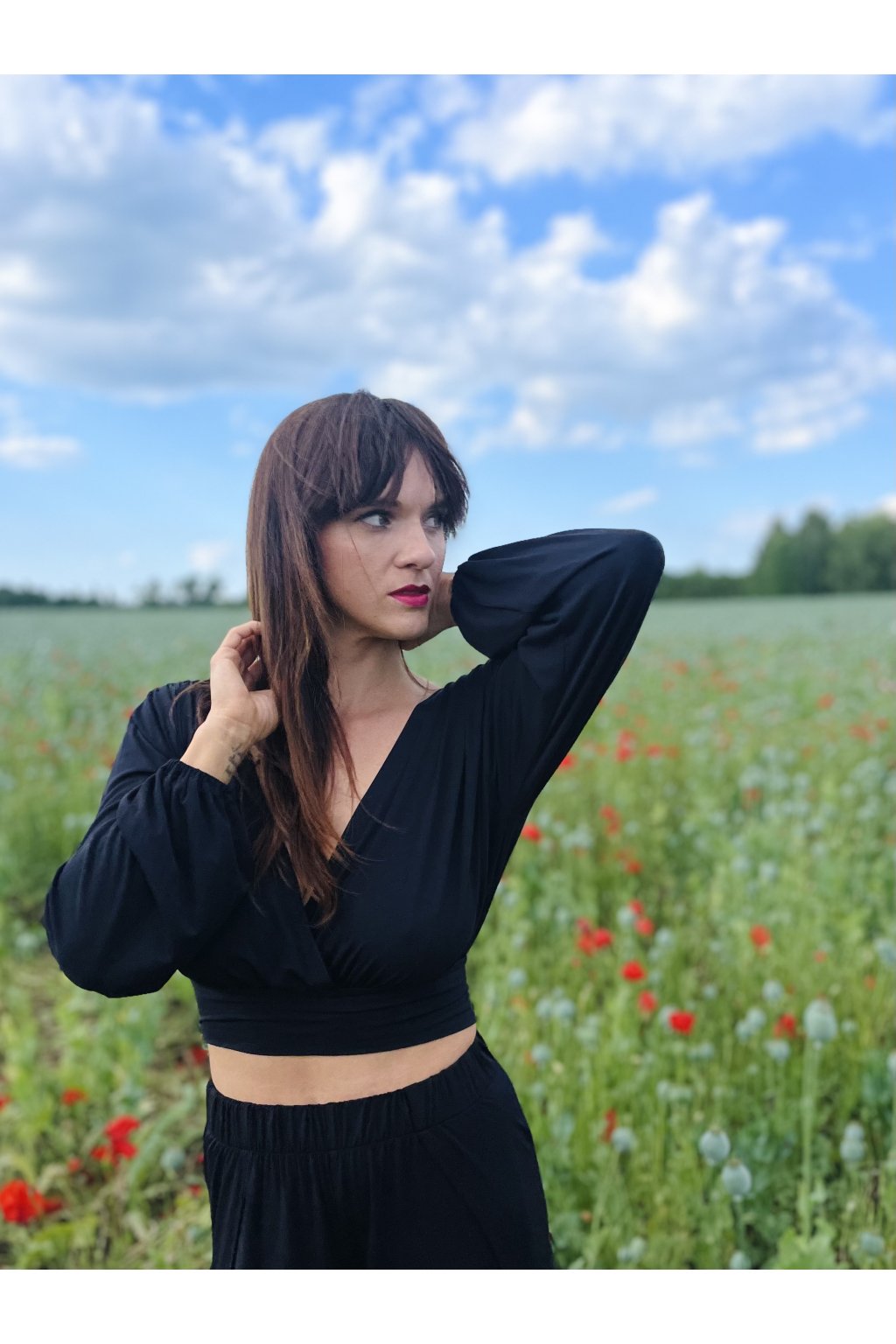 Přední díl je překřížený, vzadu má hluboký výstřih do V. Rukávy jsou volné, stažené do gumičky. Na ramenou je řasení, kterým prochází černá saténová stužka k zavázání za krkem. V pase je stažený páskem ze stejného materiálu. CROP TOP je z našeho oblíbeného letního materiálu, je maximálně pohodlný a sexy. Hodí se na různé společenské příležitosti, ale i na běžné nošení. Určitě si ho zamilujete.