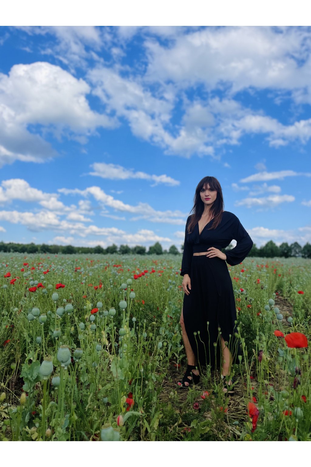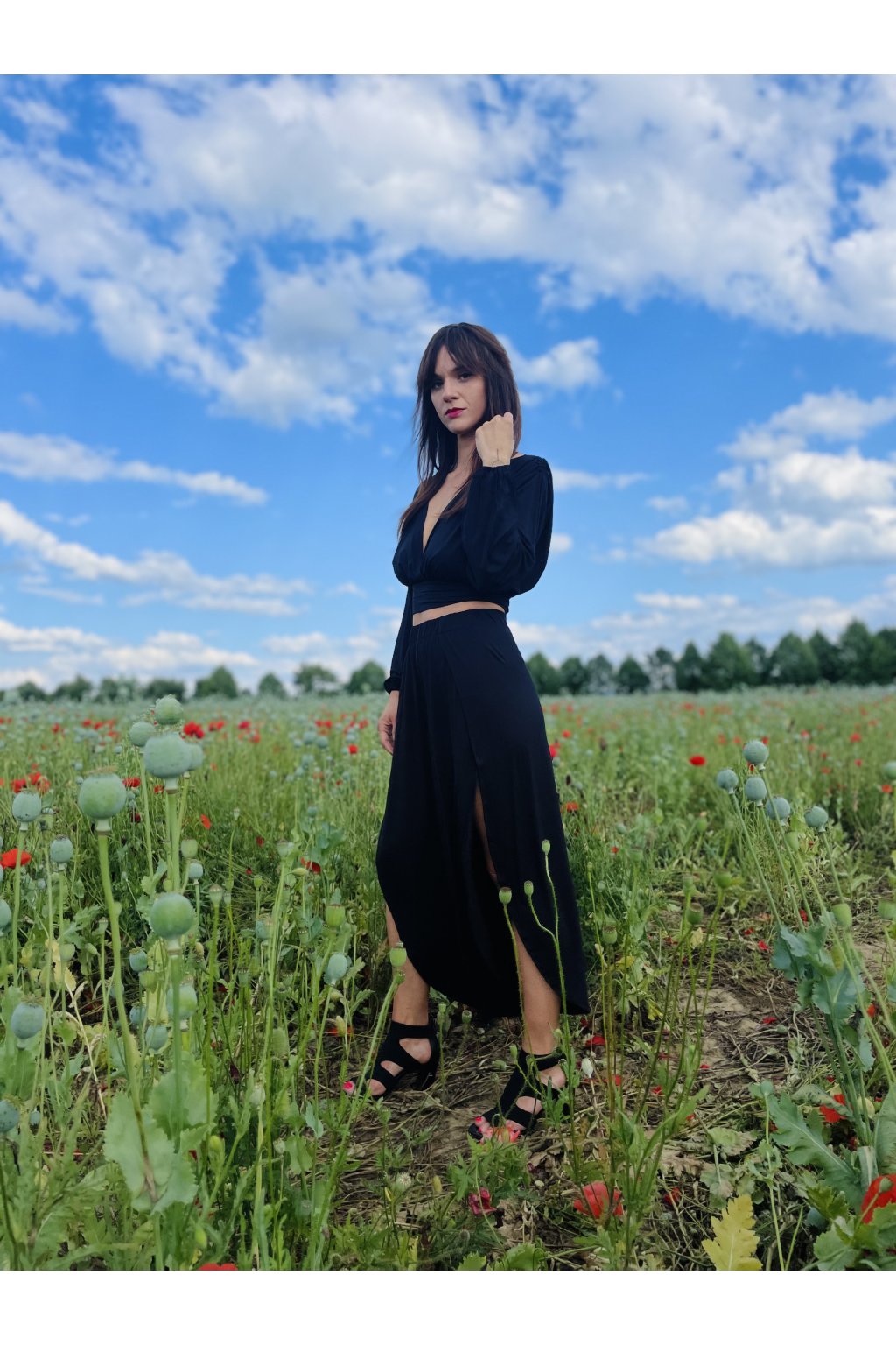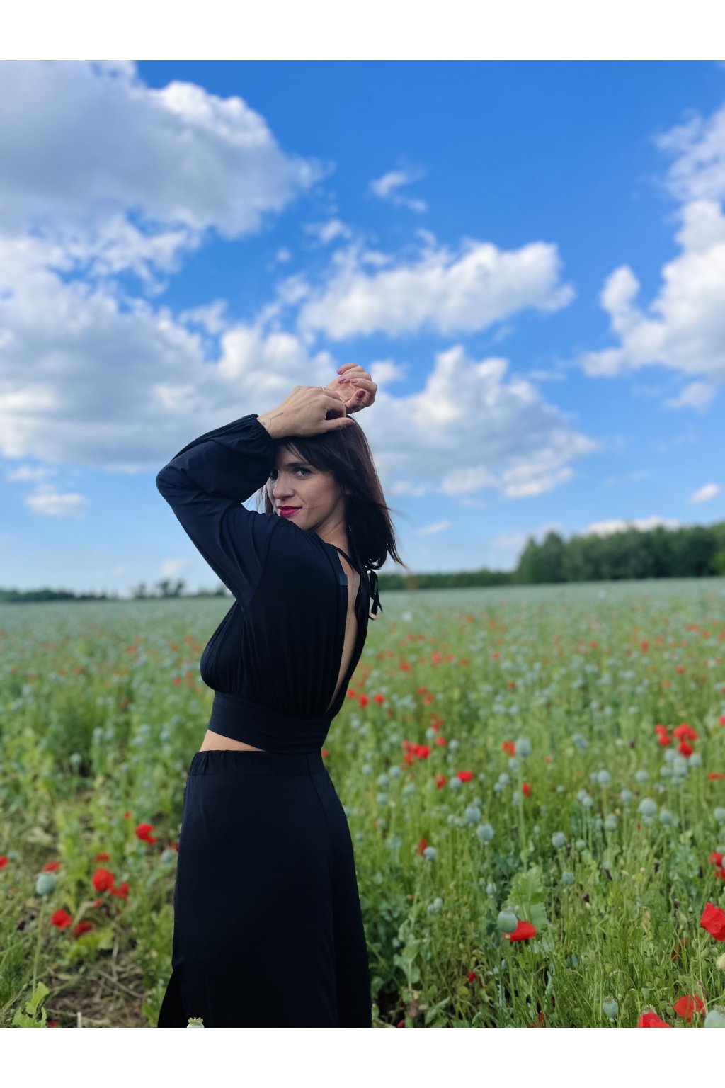 Přední díl je překřížený, vzadu má hluboký výstřih do V. Rukávy jsou volné, stažené do gumičky. Na ramenou je řasení, kterým prochází černá saténová stužka k zavázání za krkem. V pase je stažený páskem ze stejného materiálu. CROP TOP je z našeho oblíbeného letního materiálu, je maximálně pohodlný a sexy. Hodí se na různé společenské příležitosti, ale i na běžné nošení. Určitě si ho zamilujete.