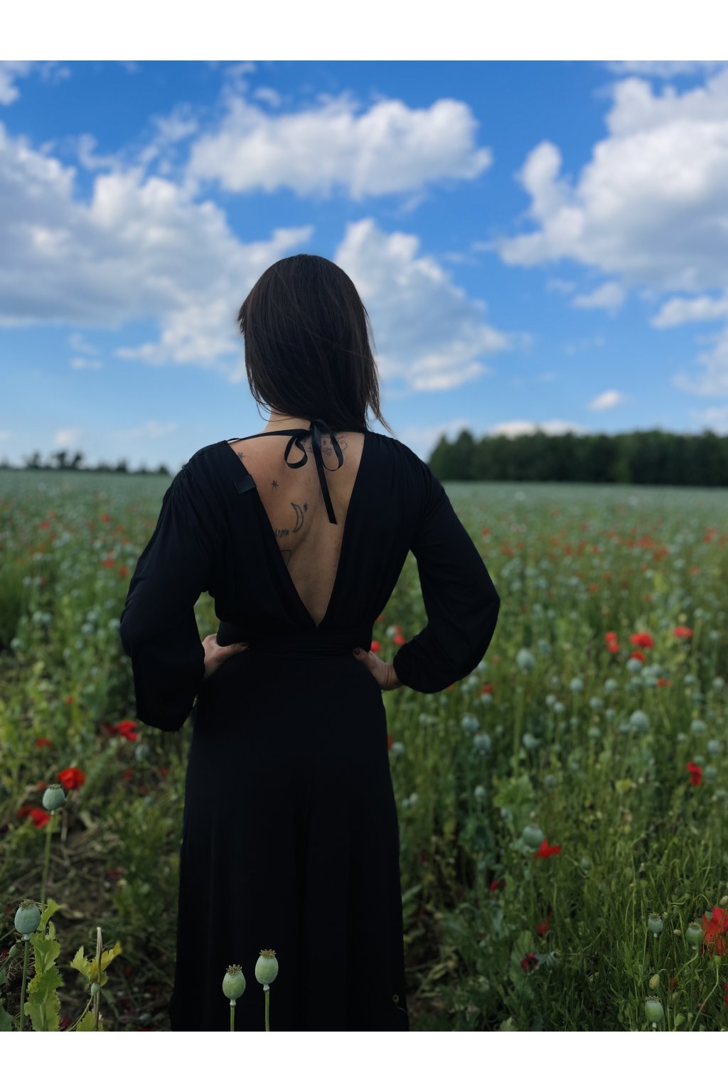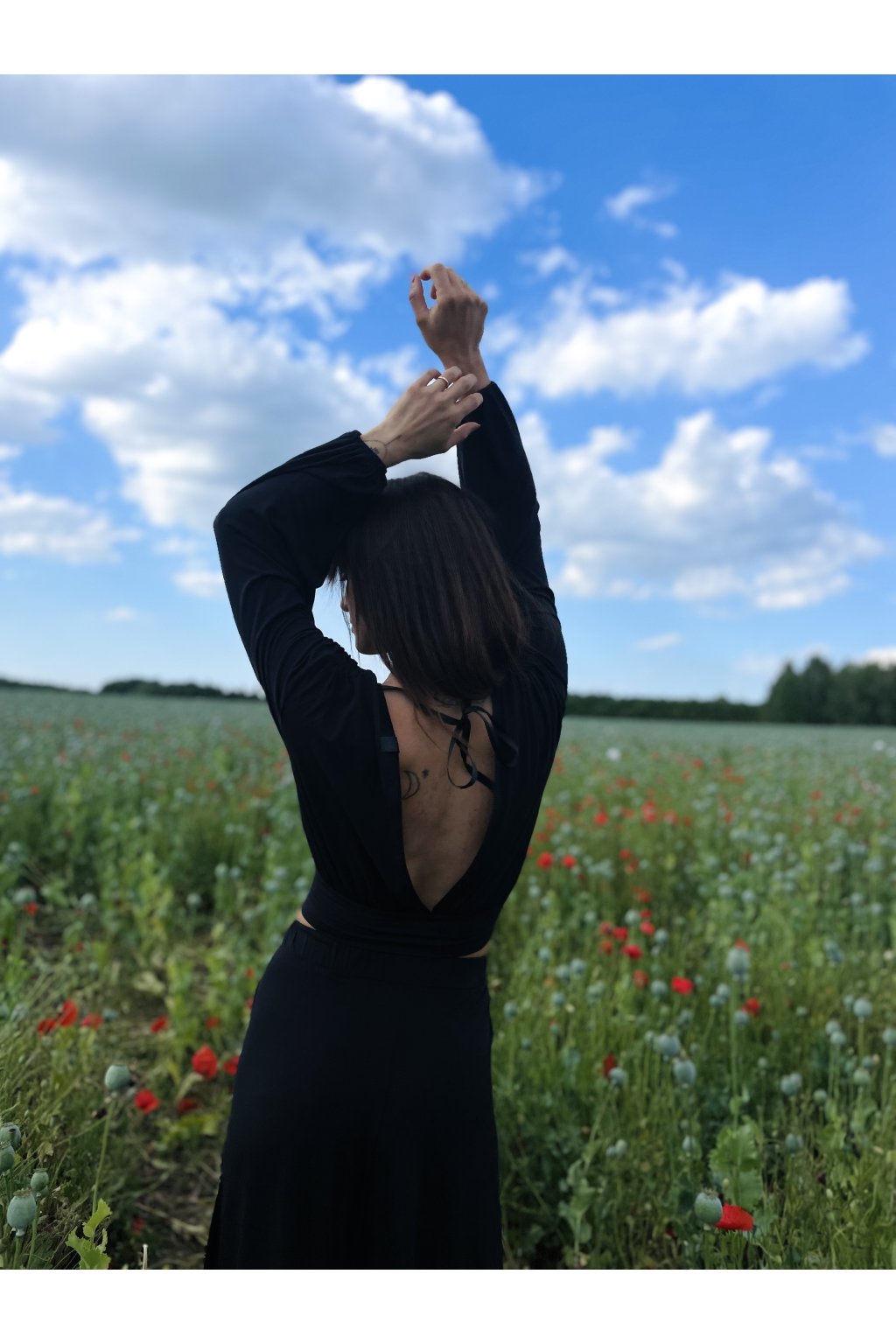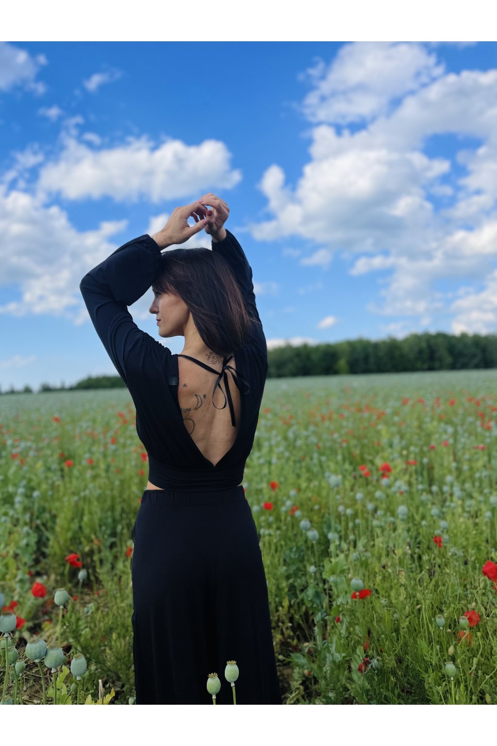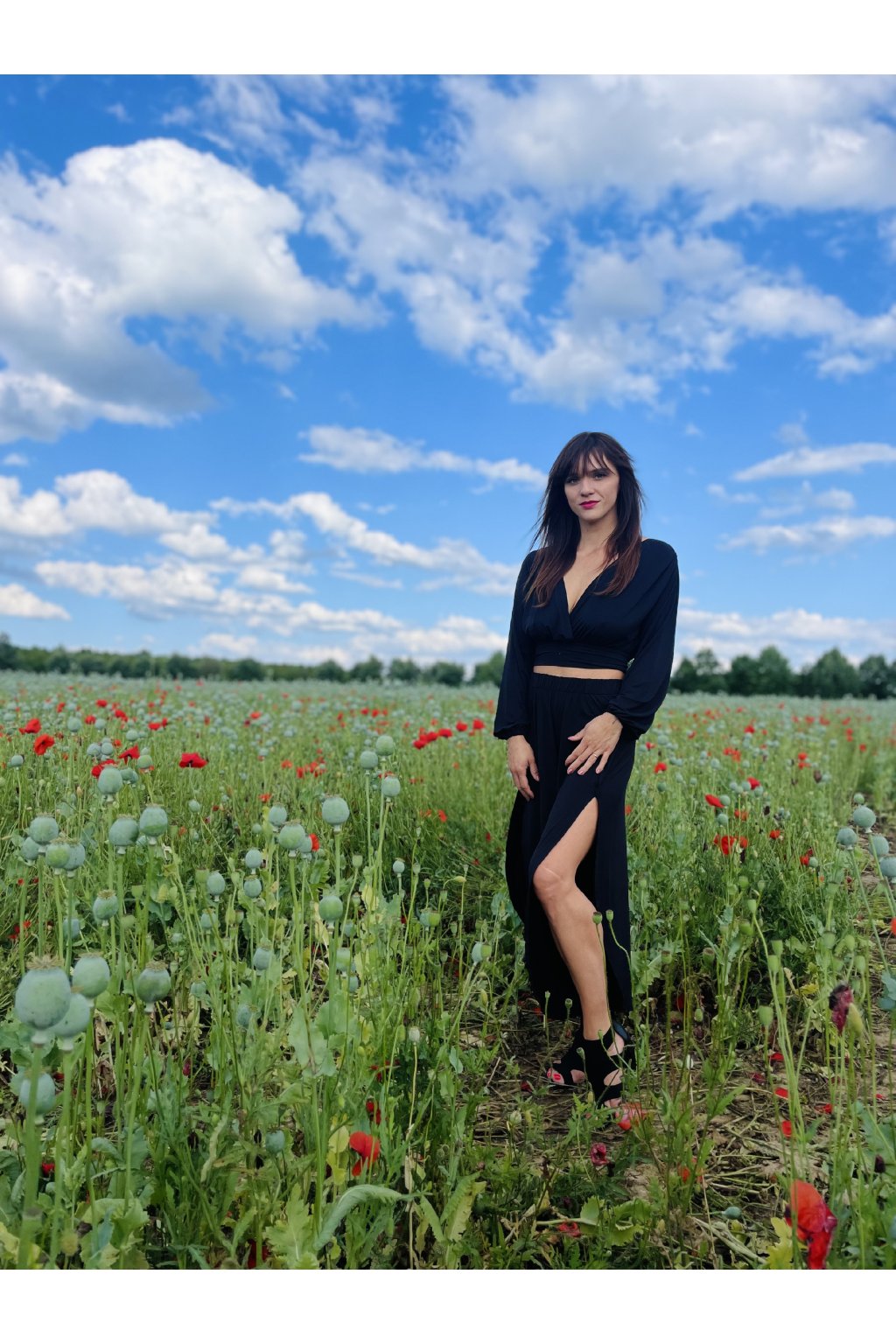Přední díl je překřížený, vzadu má hluboký výstřih do V. Rukávy jsou volné, stažené do gumičky. Na ramenou je řasení, kterým prochází černá saténová stužka k zavázání za krkem. V pase je stažený páskem ze stejného materiálu. CROP TOP je z našeho oblíbeného letního materiálu, je maximálně pohodlný a sexy. Hodí se na různé společenské příležitosti, ale i na běžné nošení. Určitě si ho zamilujete.