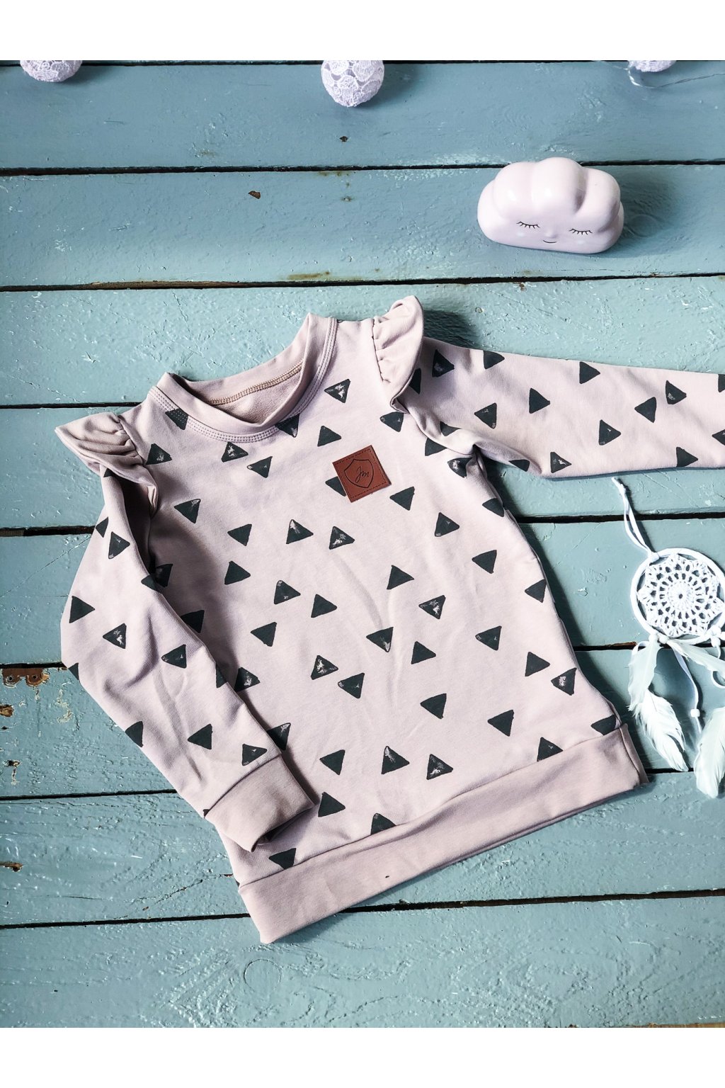 Mikina v lila barvě s potiskem šedých trojúhelníčku z kolekce DIXIE. Je ušita z příjemné teplákoviny.
