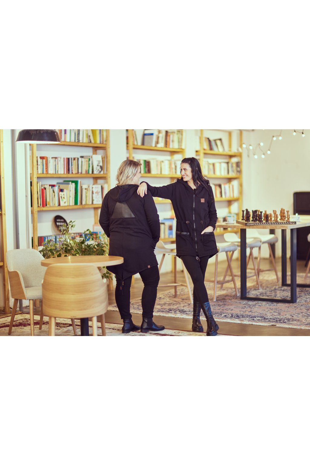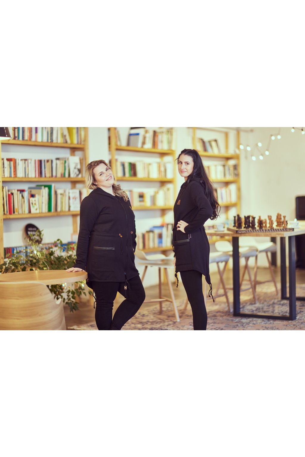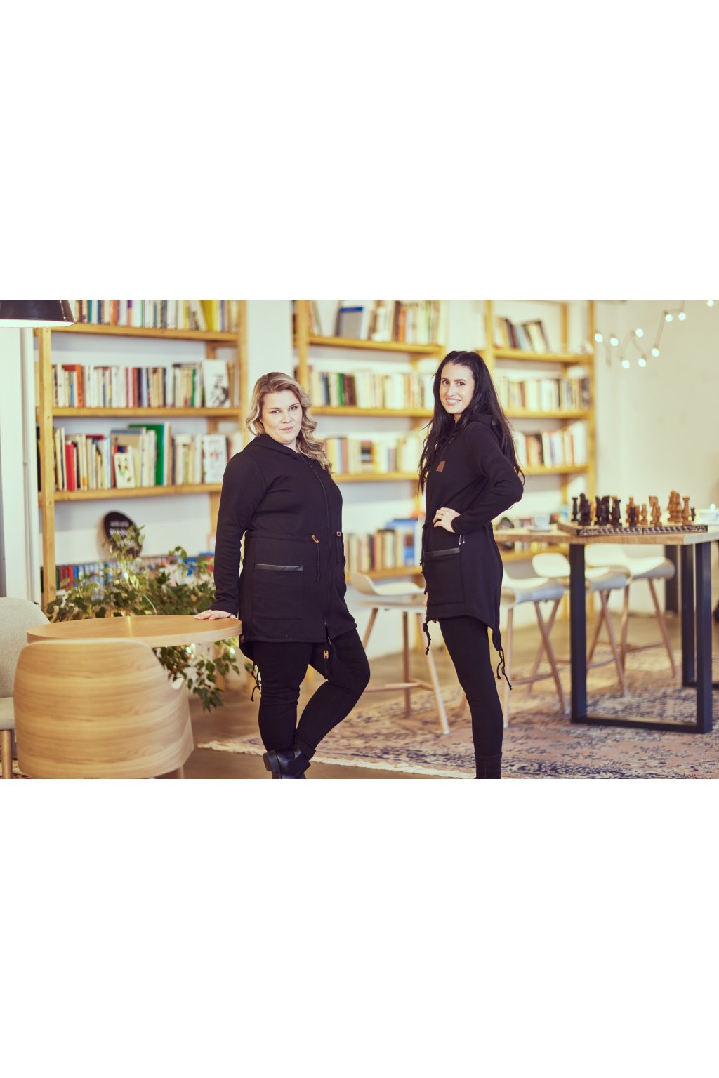 Stylová dlouhá mikina má spíše volnější střih, je ušita z černého warmkeeperu. Mikina je na zip, vpředu má kapsy lemované černou koženkou. Střih je delší a v pase má tunýlek. Mikina má na zádech ozdobný trojúhelník z černé koženky.