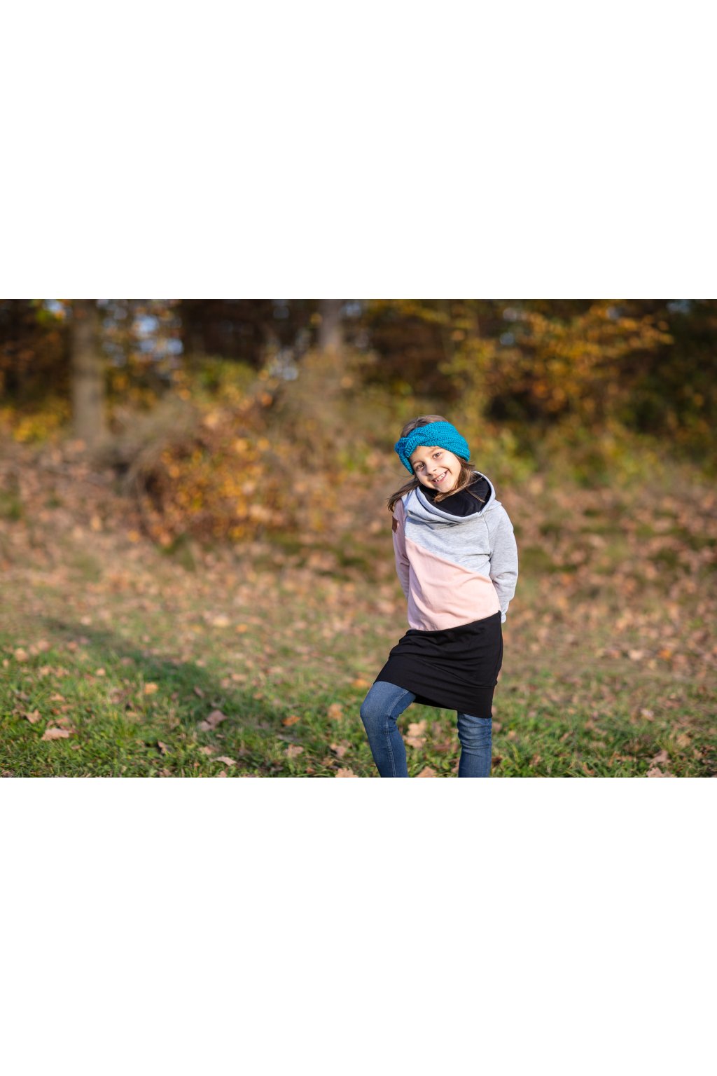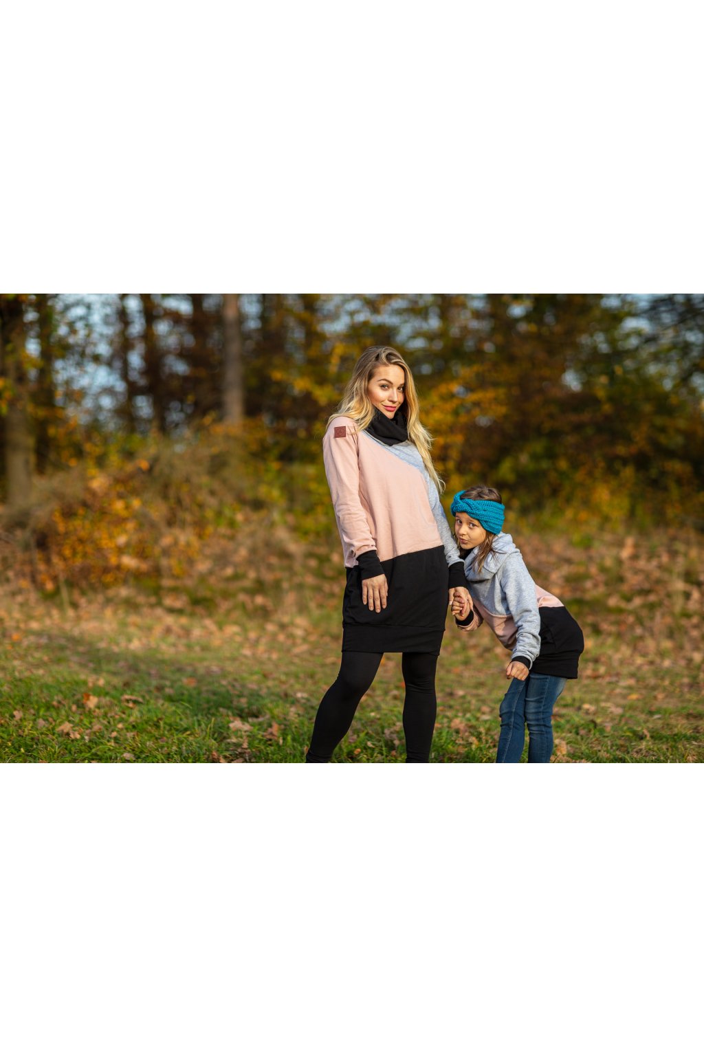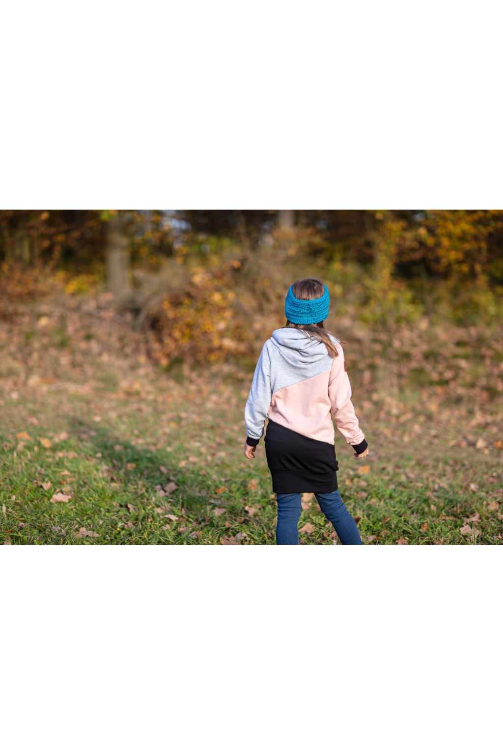 Stylová dlouhá mikina má spíše volnější střih, je ušita z růžové,černé a šedé teplákoviny. Mikina má okolo krku tunel, který je součástí mikiny a dole je stažena do nápletu.