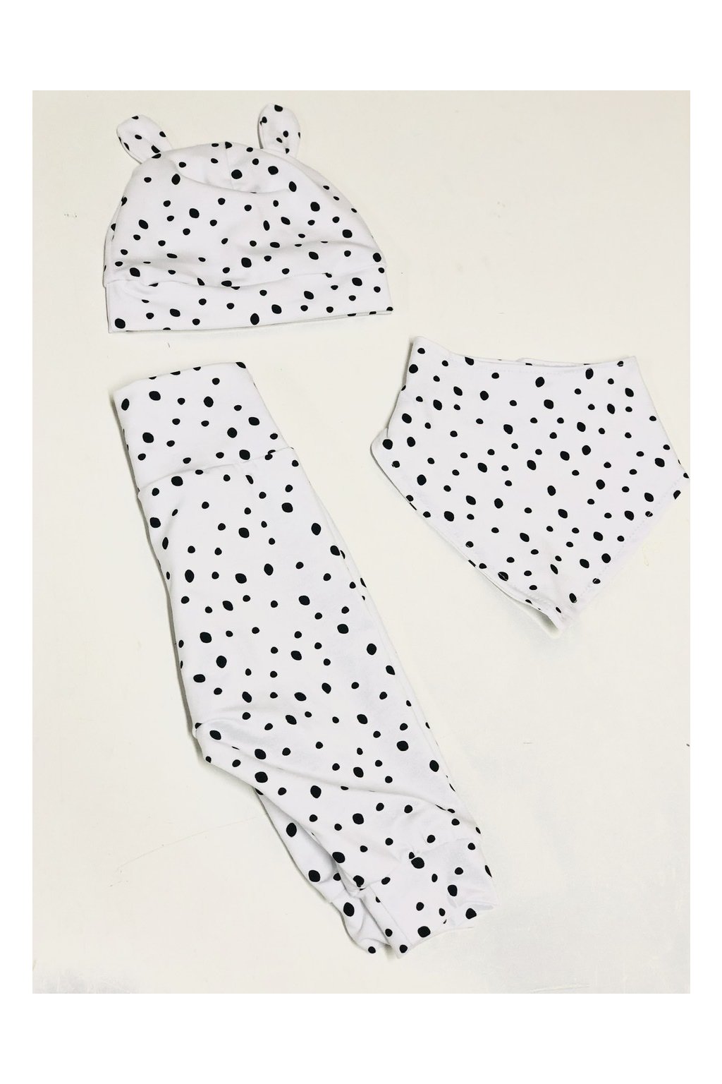 Jedná se o trojkombinaci - tepláčky, šáteček jako bryndáček a čepička s oušky.
