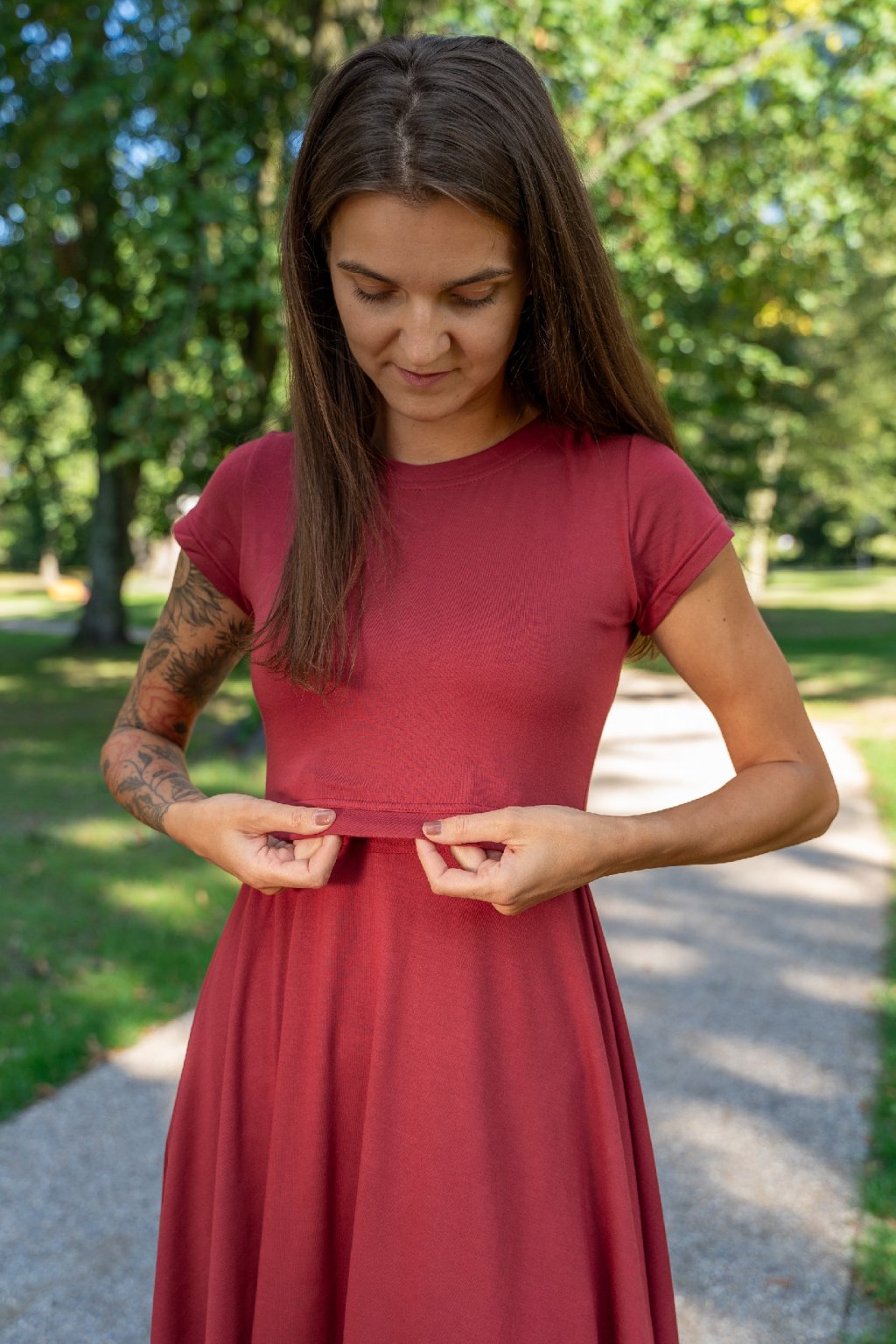 Šaty Camilla umožňují pohodlné a diskrétní kojení, a to především díky dvojitému přednímu dílu. Jak to funguje? Horní látka se vyhrne nahoru, spodní se stáhne dolů – a tím miminko snadno získá přístup k maminčinu mlíčku. Vše je velmi jednoduché a praktické, žádné knoflíčky ani zipy. Ideální řešení, pokud své dítko potřebujete sem tam nakojit na veřejnosti.