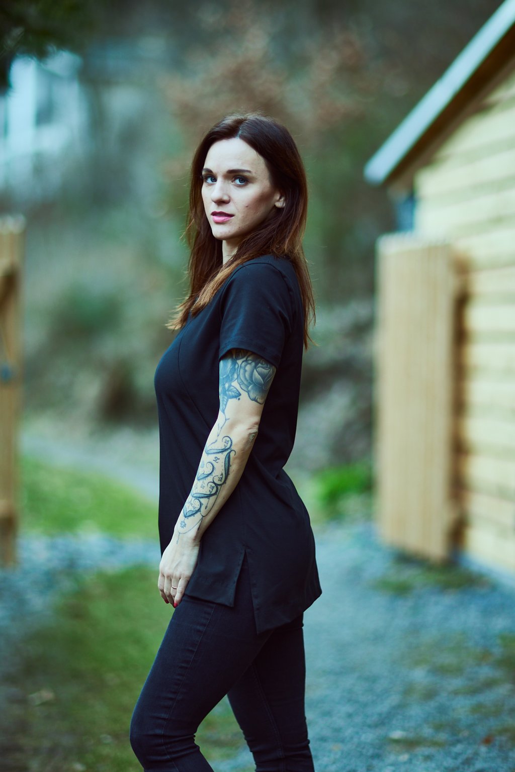 Tričko je ušité ze silnějšího černého bavlněného úpletu s elastanem. Přes prsa má dva ozdobné švy. Po stranách dole jsou dva rozparky.