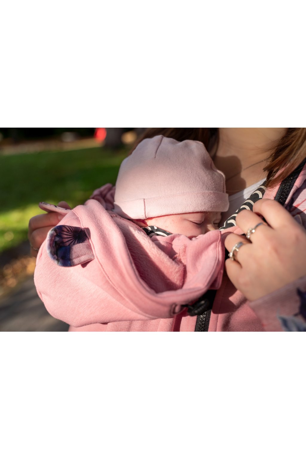 Mikina je ušita z teploučkého warmkeeperu, v jehož složení převažuje bavlna (70 %), navíc je díky elastanu hezky pružná, takže se perfektně přizpůsobí vaší postavě i velikosti děťátka. Z lícové strany se nachází jemný úplet, z rubové strany vás obejme neskutečně měkký a hebký chloupek, který vás oba příjemně zahřeje.
