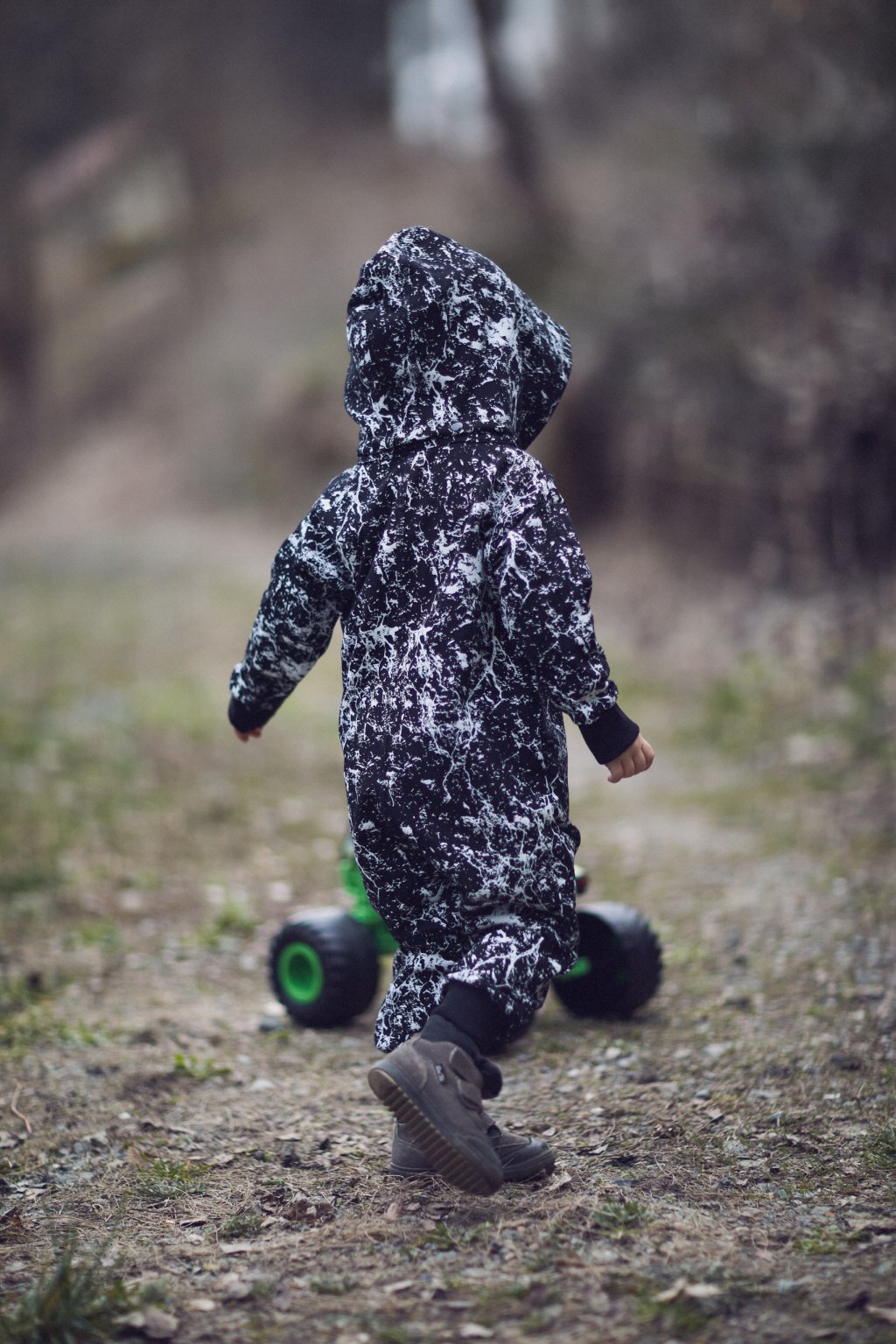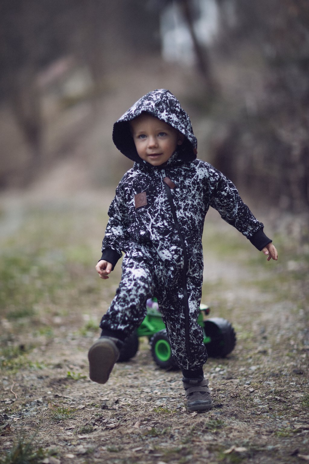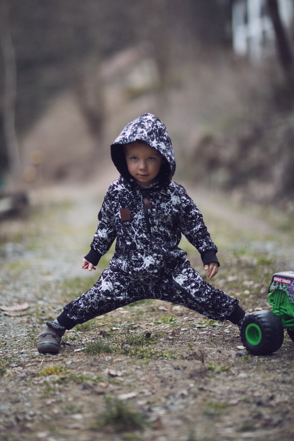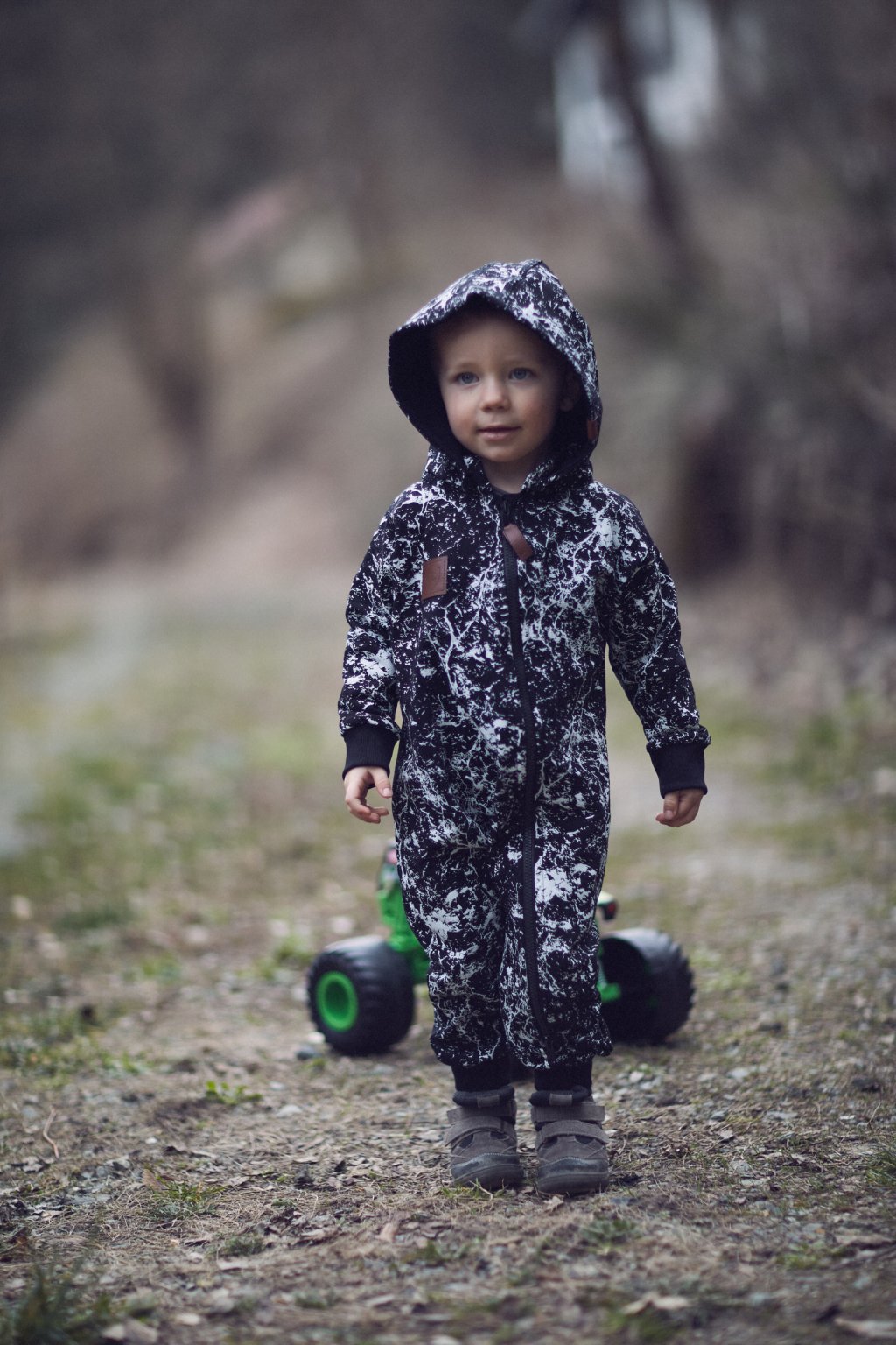Overálek z černé počesané teplákoviny bavlna/elastan s potiskem z kolekce ART. Overal má odepínací kapucu a podložení pod celou délkou zipu, aby nedošlo ke zranění.