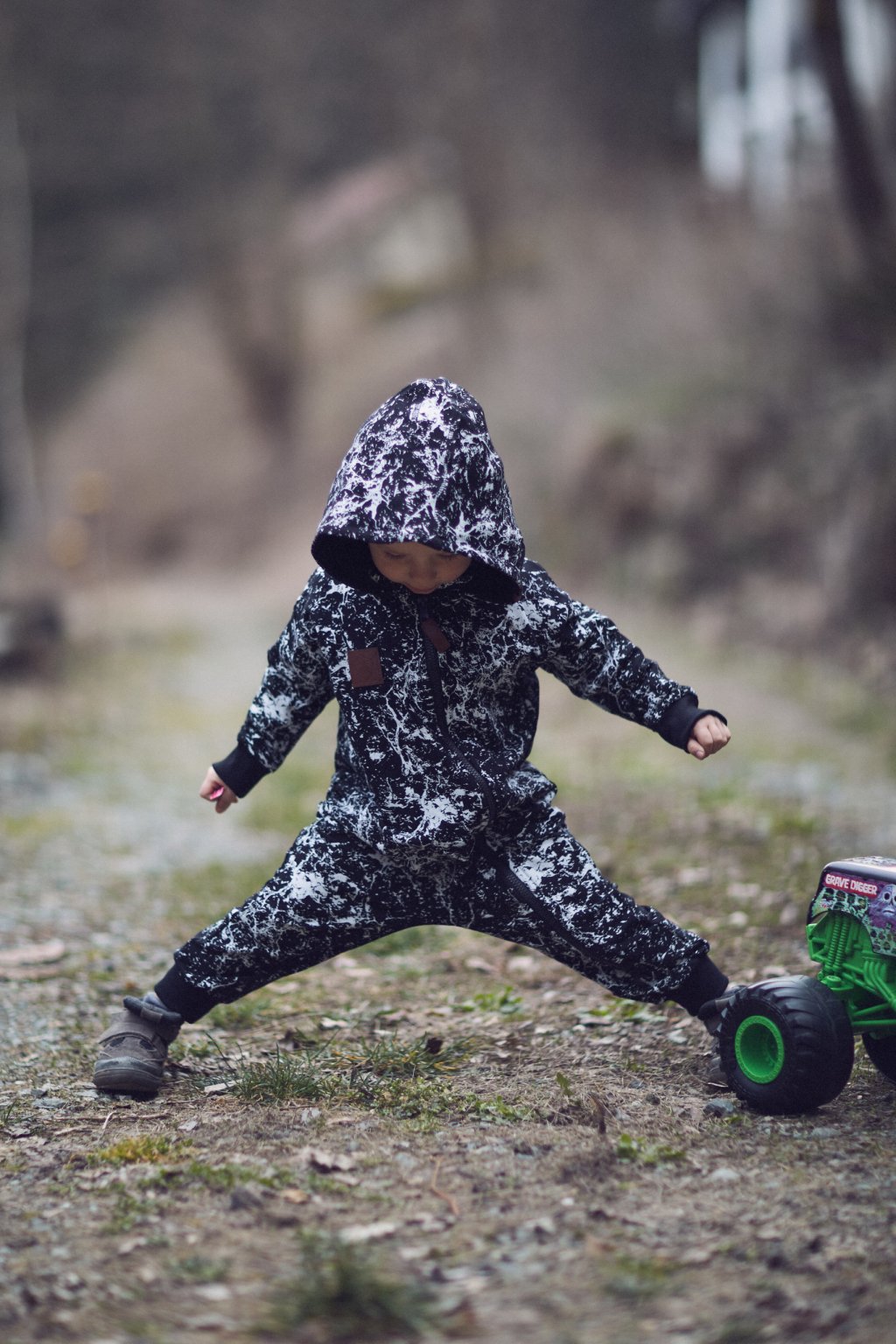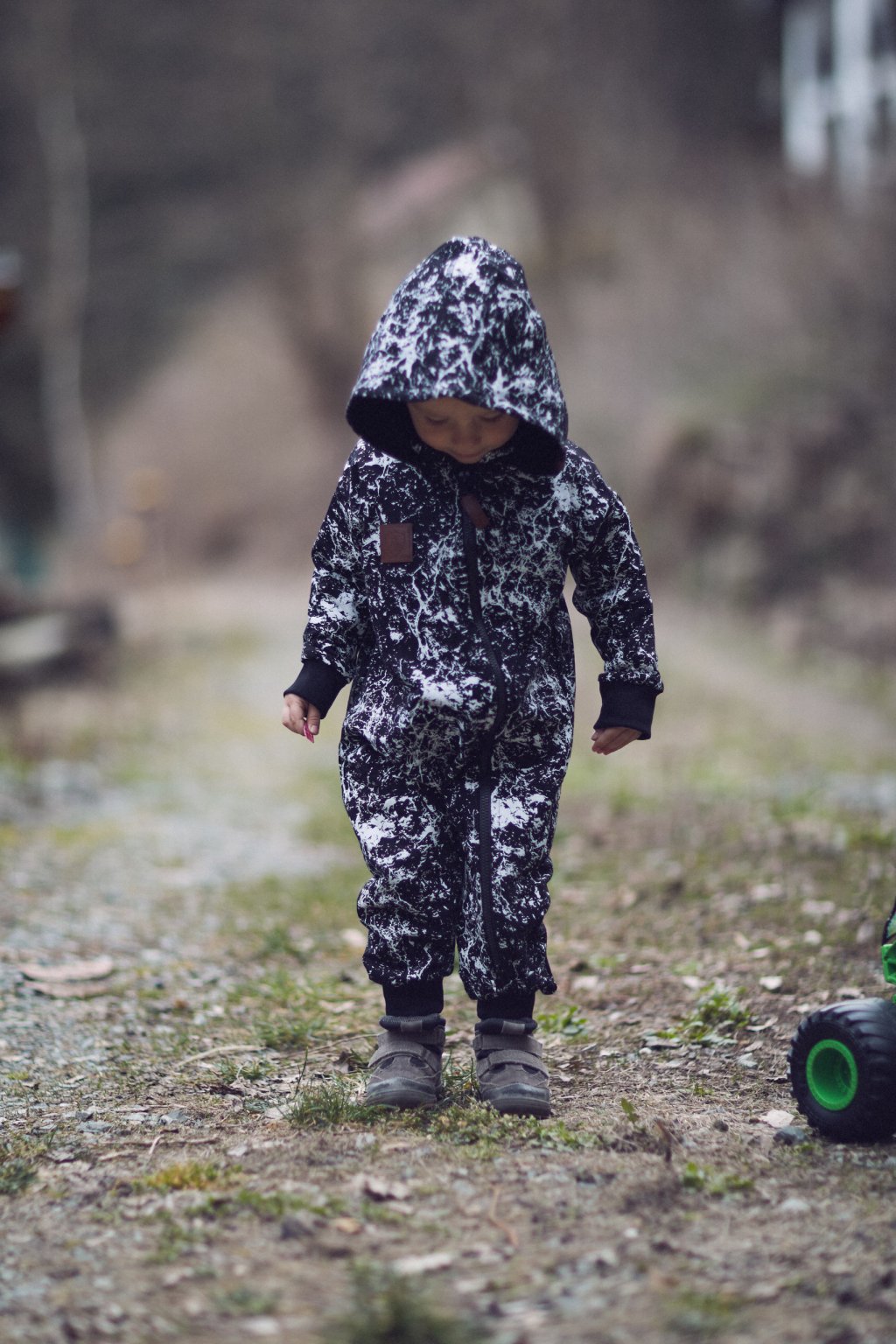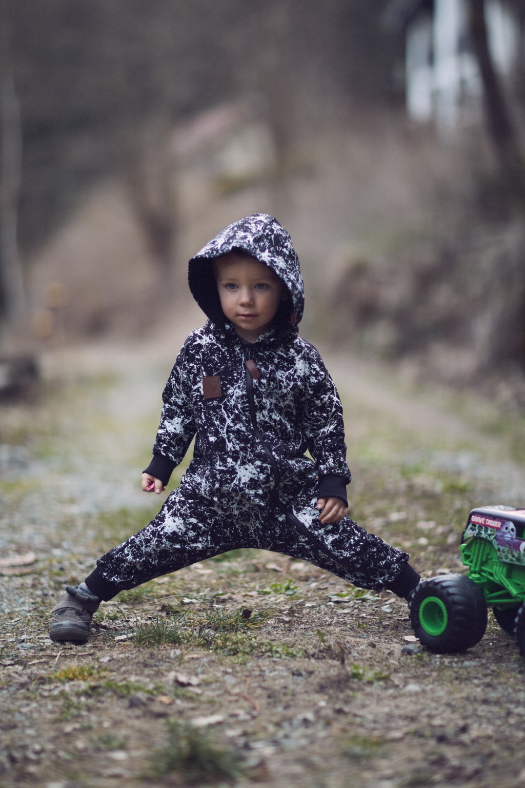 Overálek z černé počesané teplákoviny bavlna/elastan s potiskem z kolekce ART. Overal má odepínací kapucu a podložení pod celou délkou zipu, aby nedošlo ke zranění.