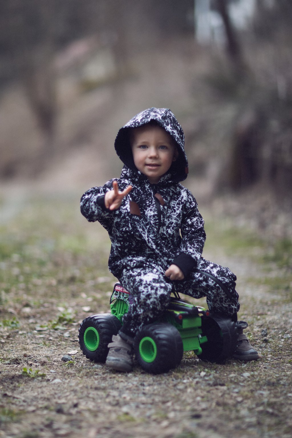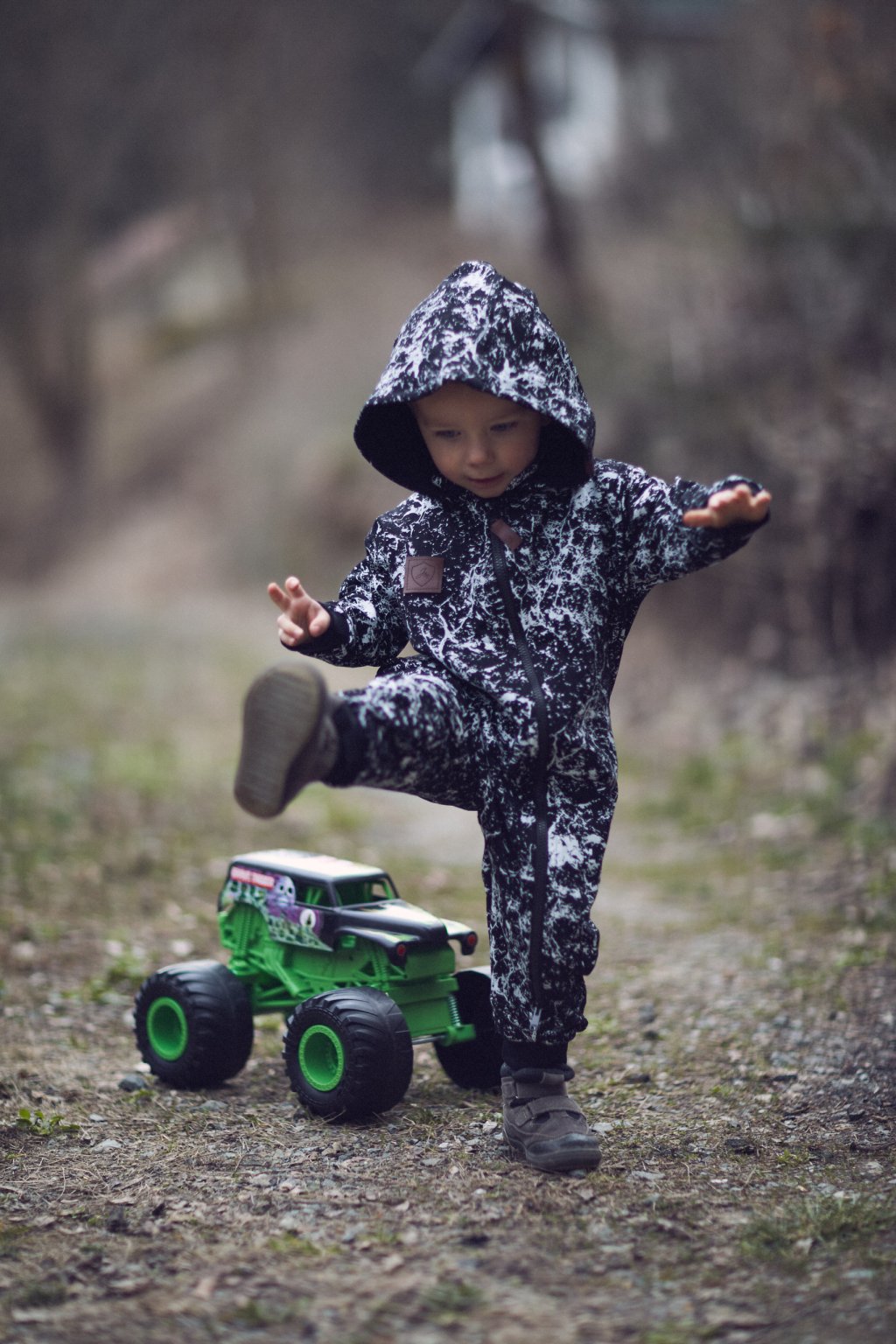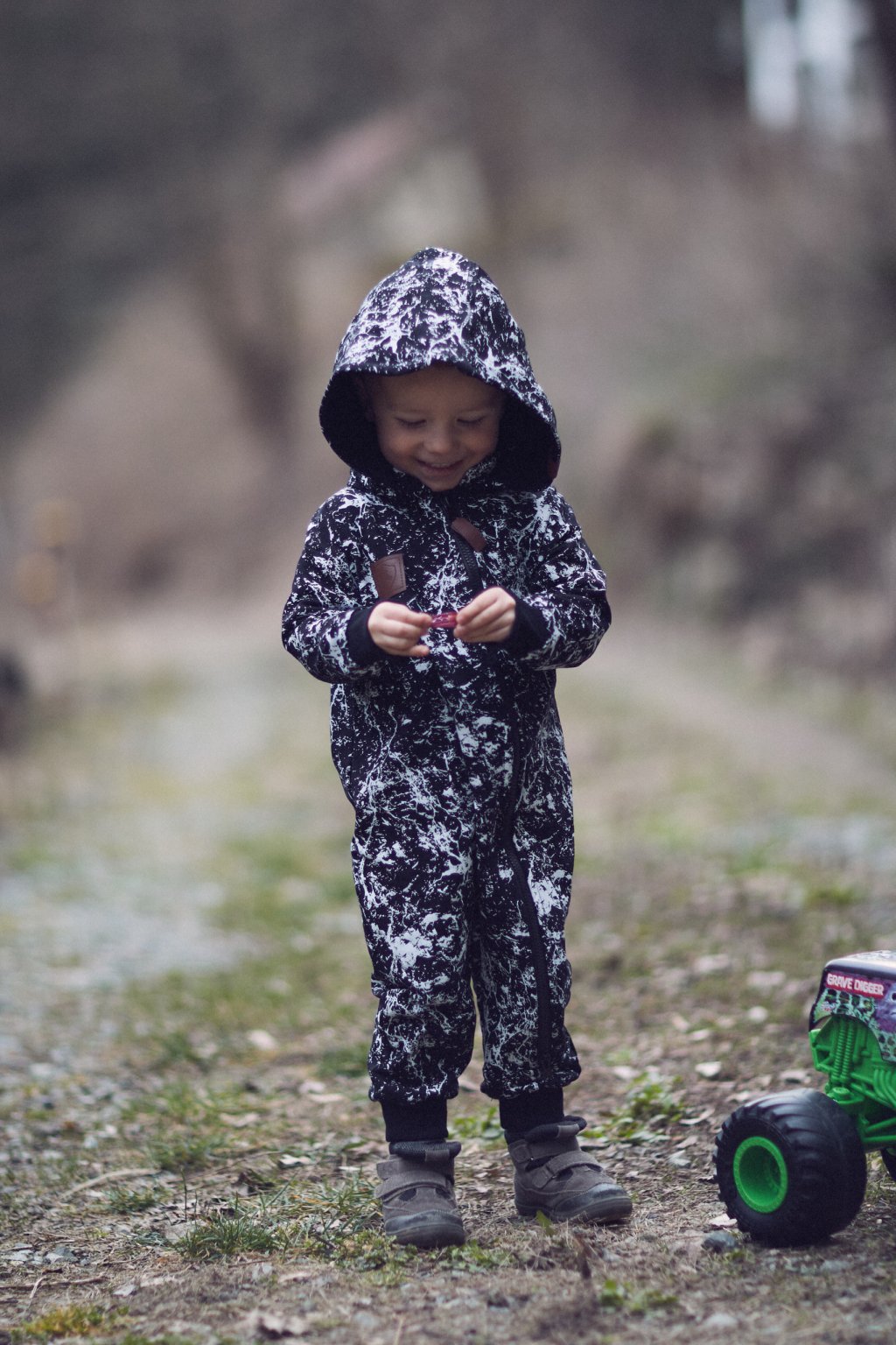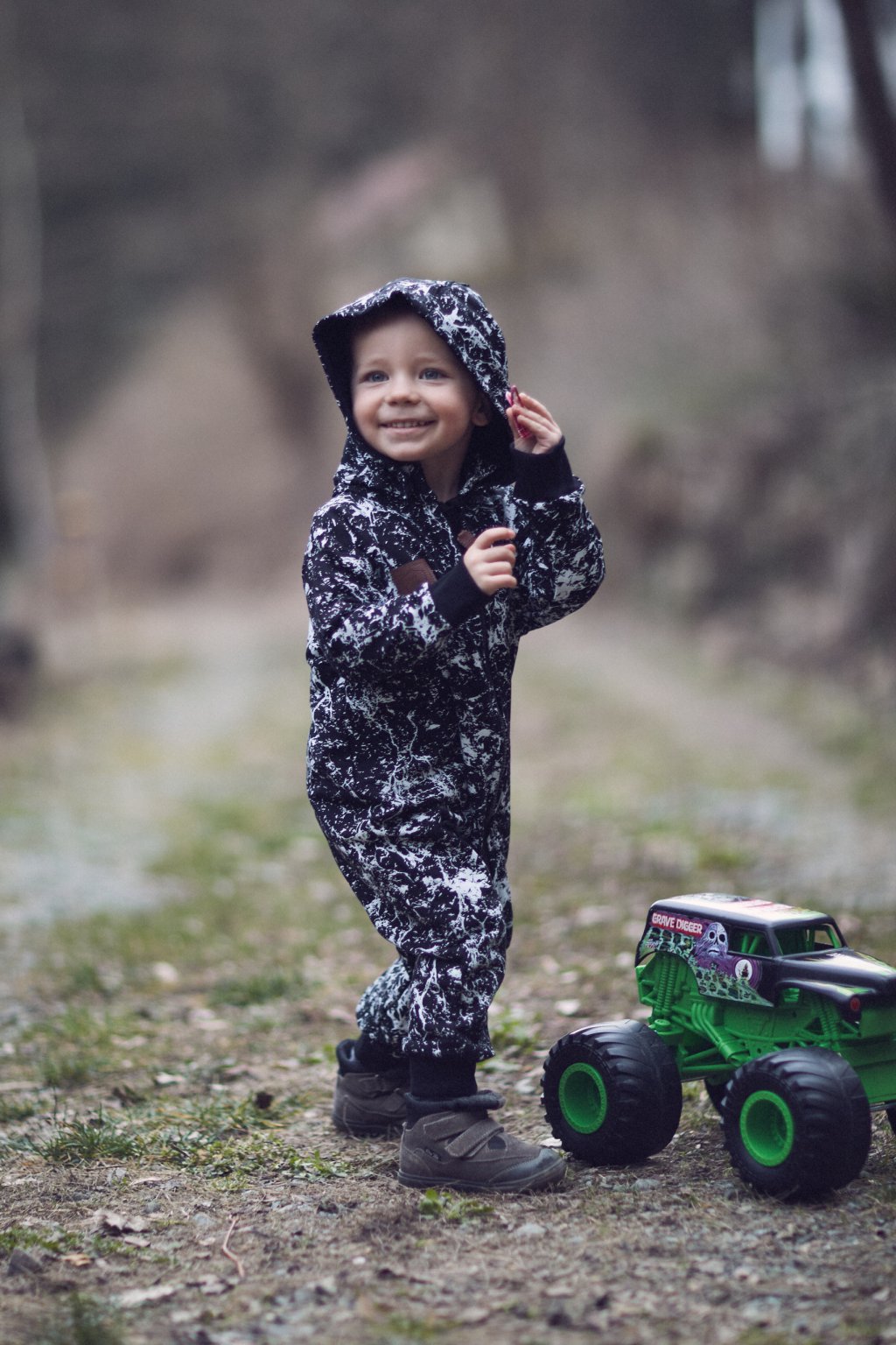 Overálek z černé počesané teplákoviny bavlna/elastan s potiskem z kolekce ART. Overal má odepínací kapucu a podložení pod celou délkou zipu, aby nedošlo ke zranění.