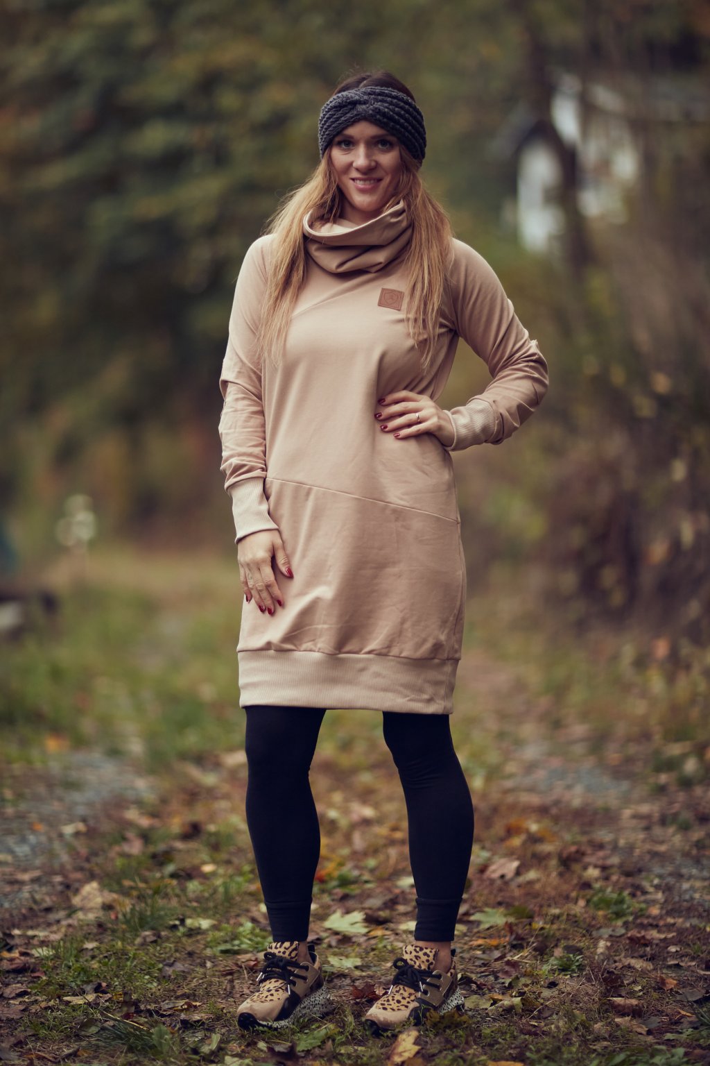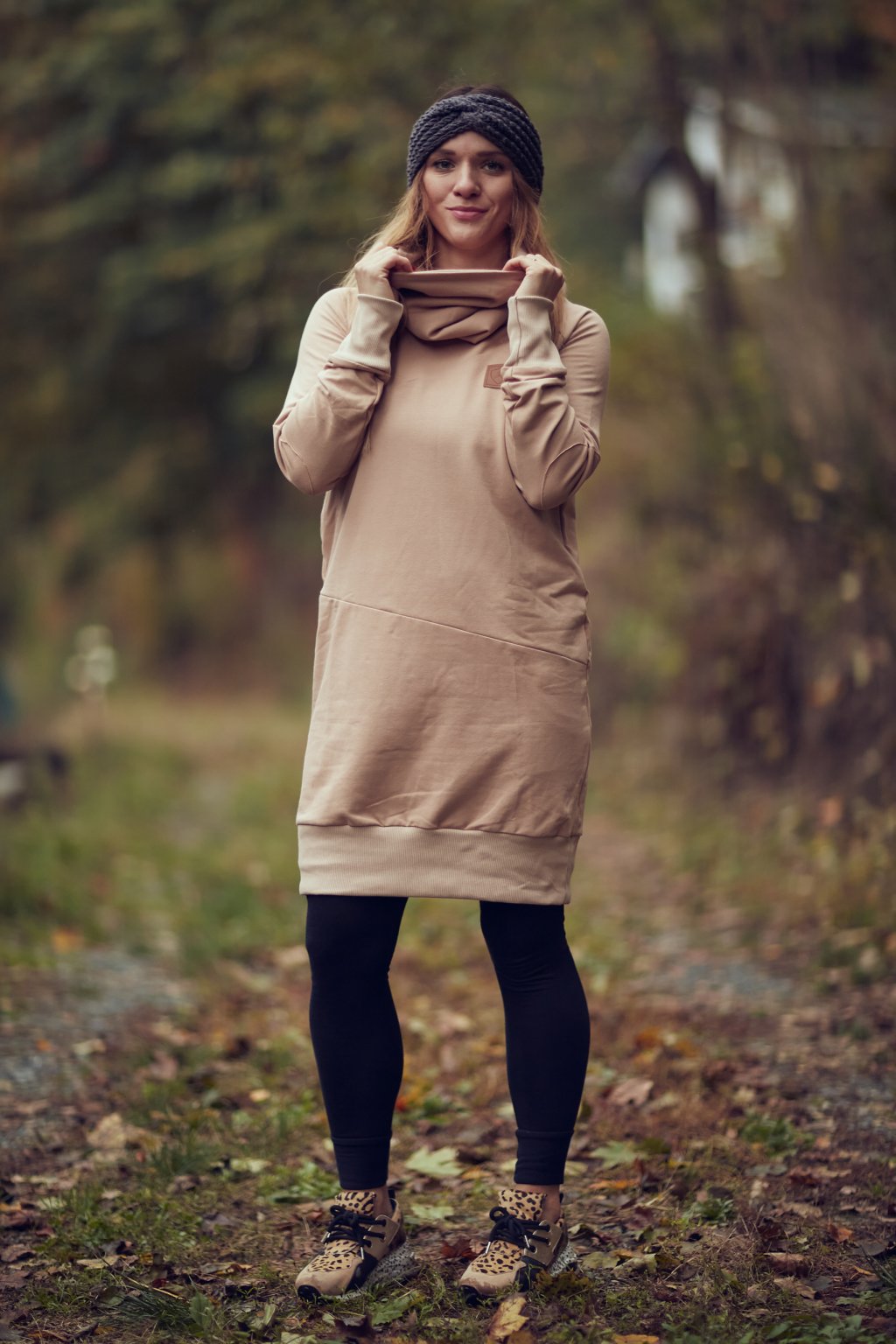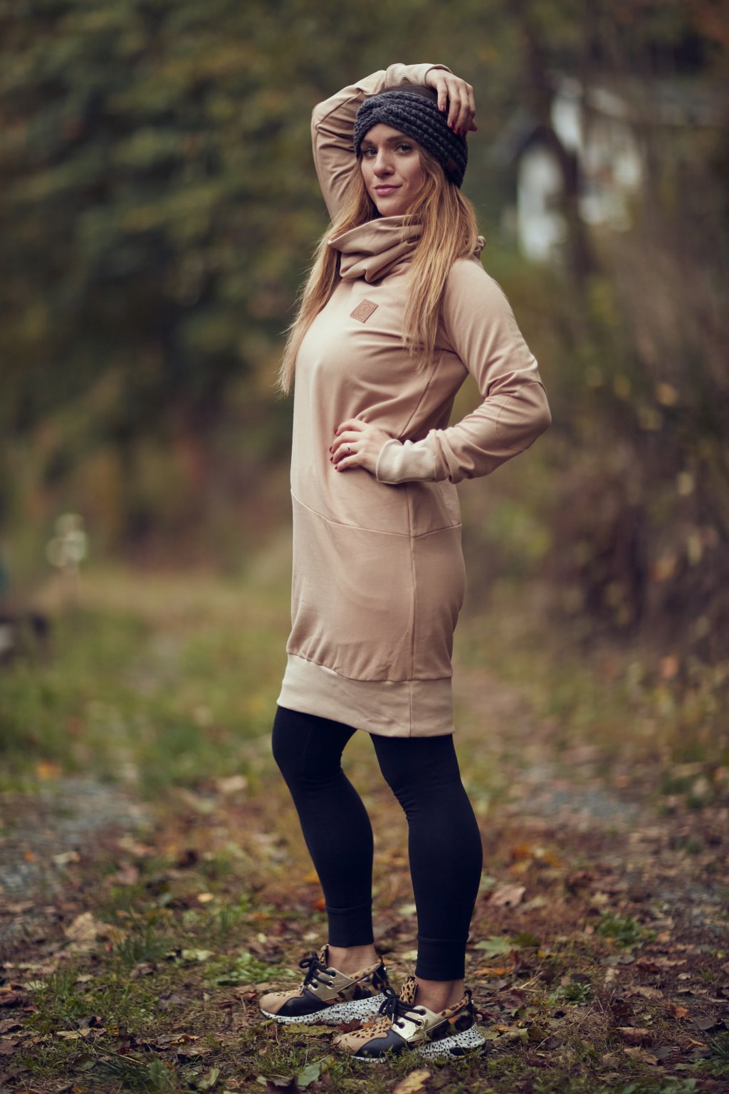Stylová dlouhá mikina má spíše volnější střih, je ušita ze béžové počesané teplákoviny. Mikina má okolo krku tunel, který je součástí mikiny a dole je stažena do nápletu.