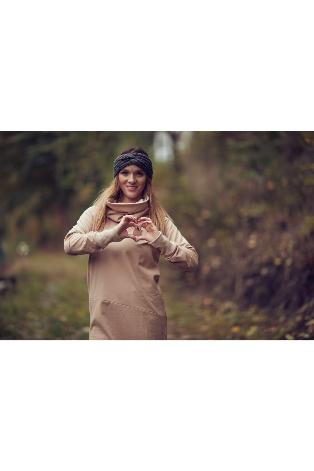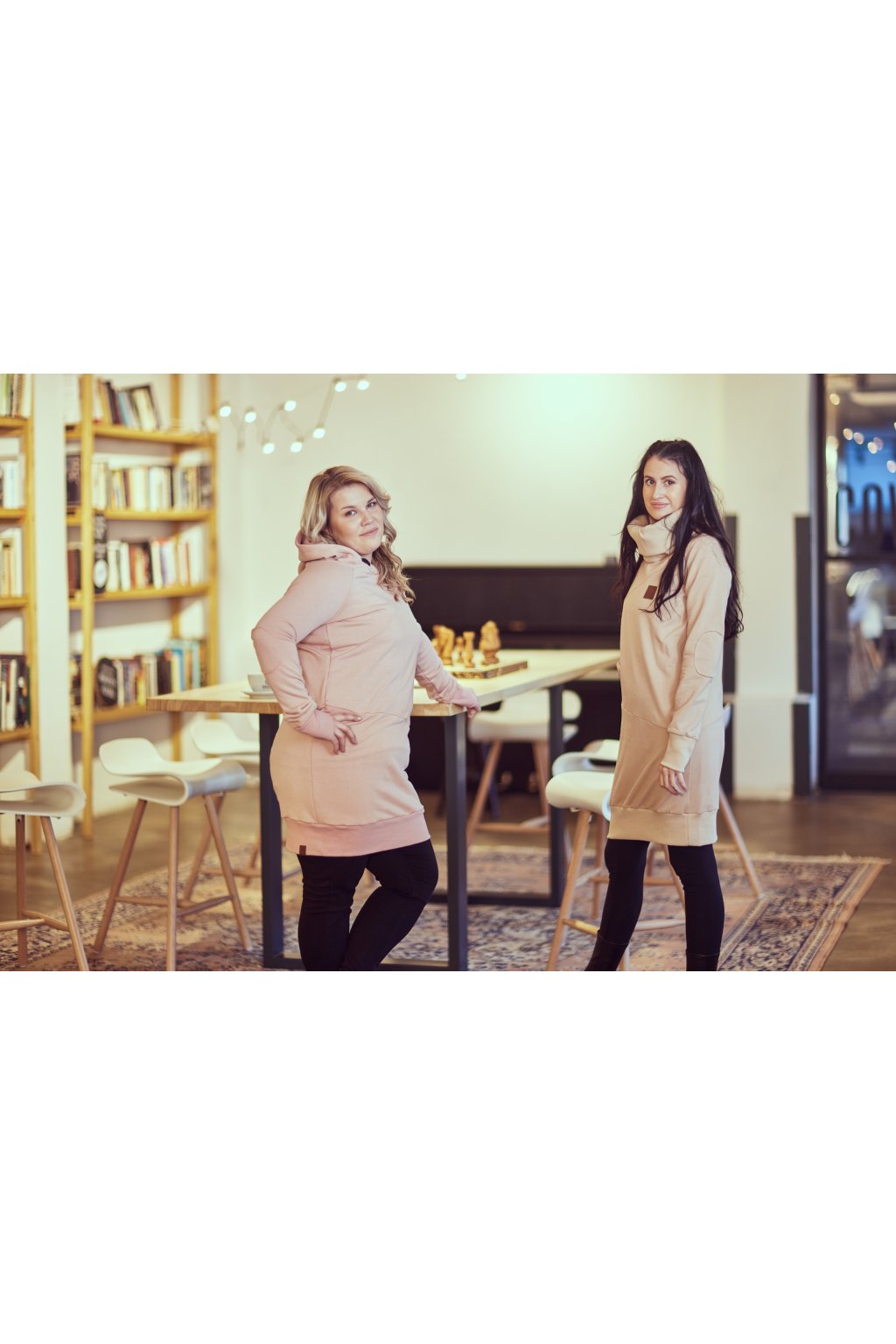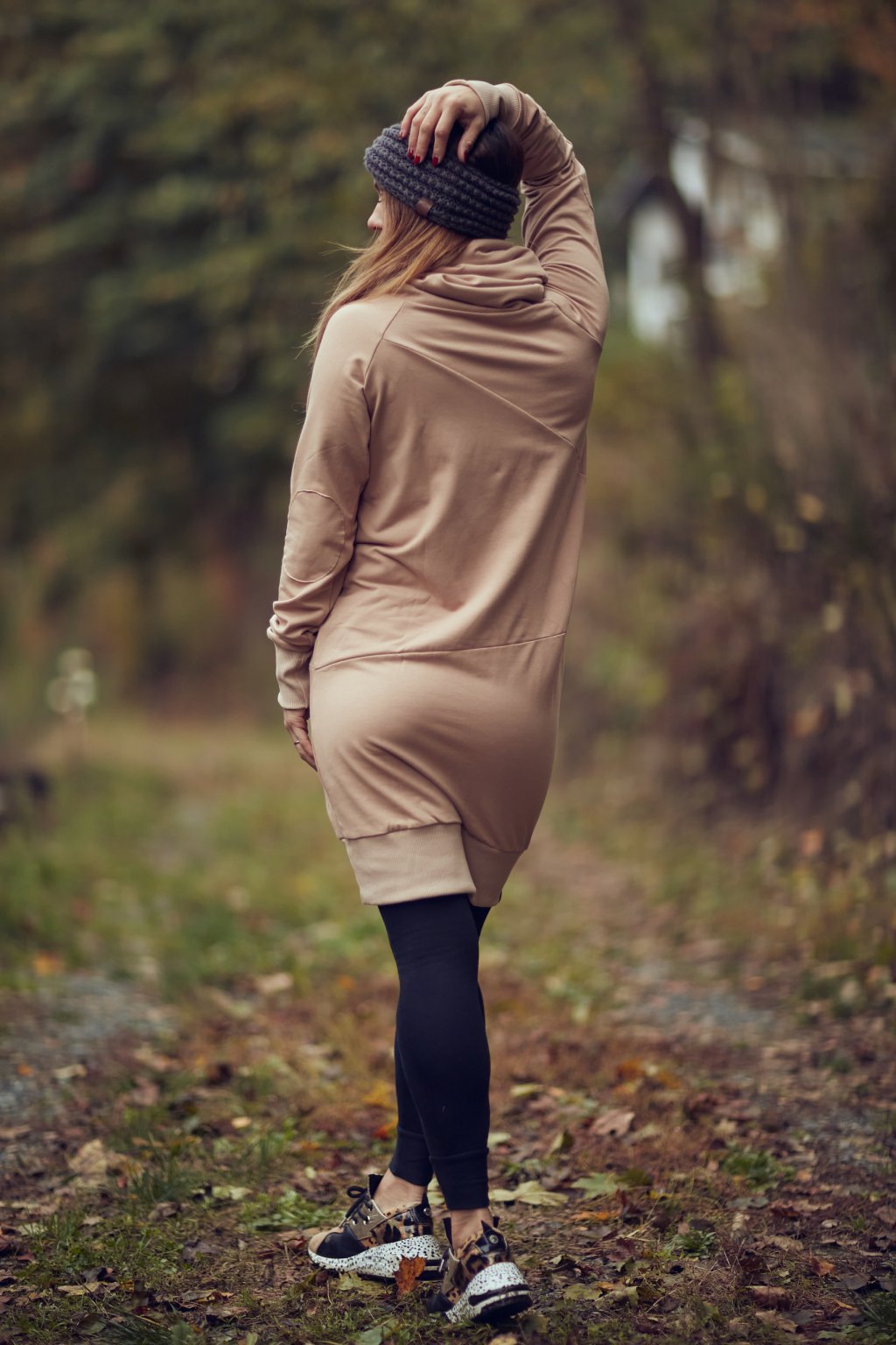 Stylová dlouhá mikina má spíše volnější střih, je ušita ze béžové počesané teplákoviny. Mikina má okolo krku tunel, který je součástí mikiny a dole je stažena do nápletu.