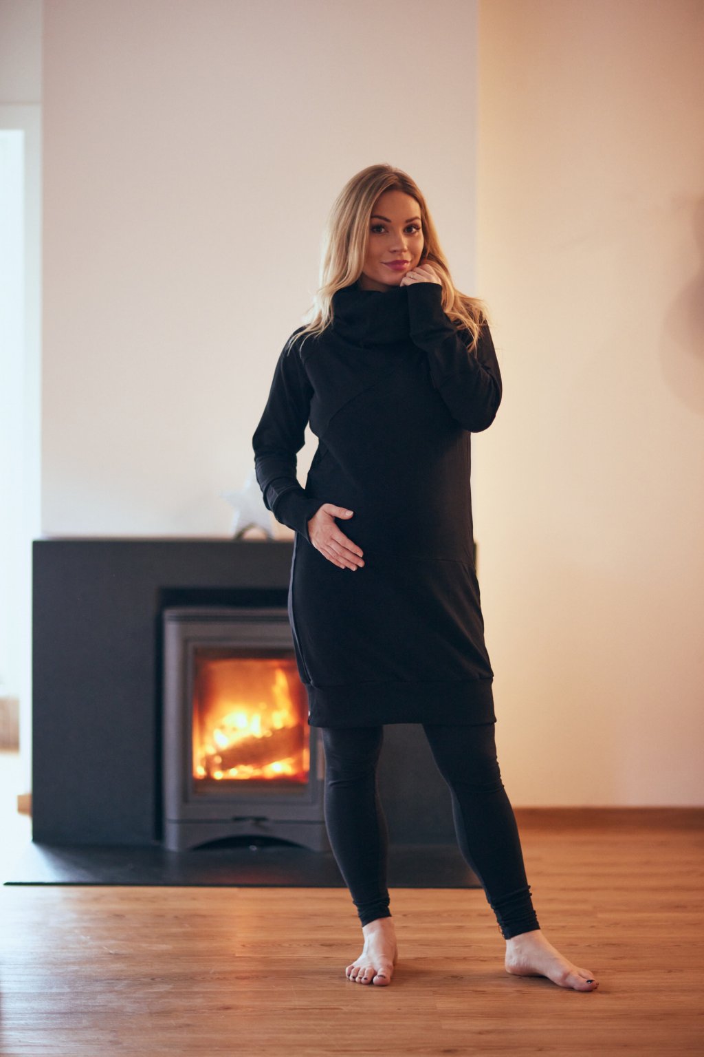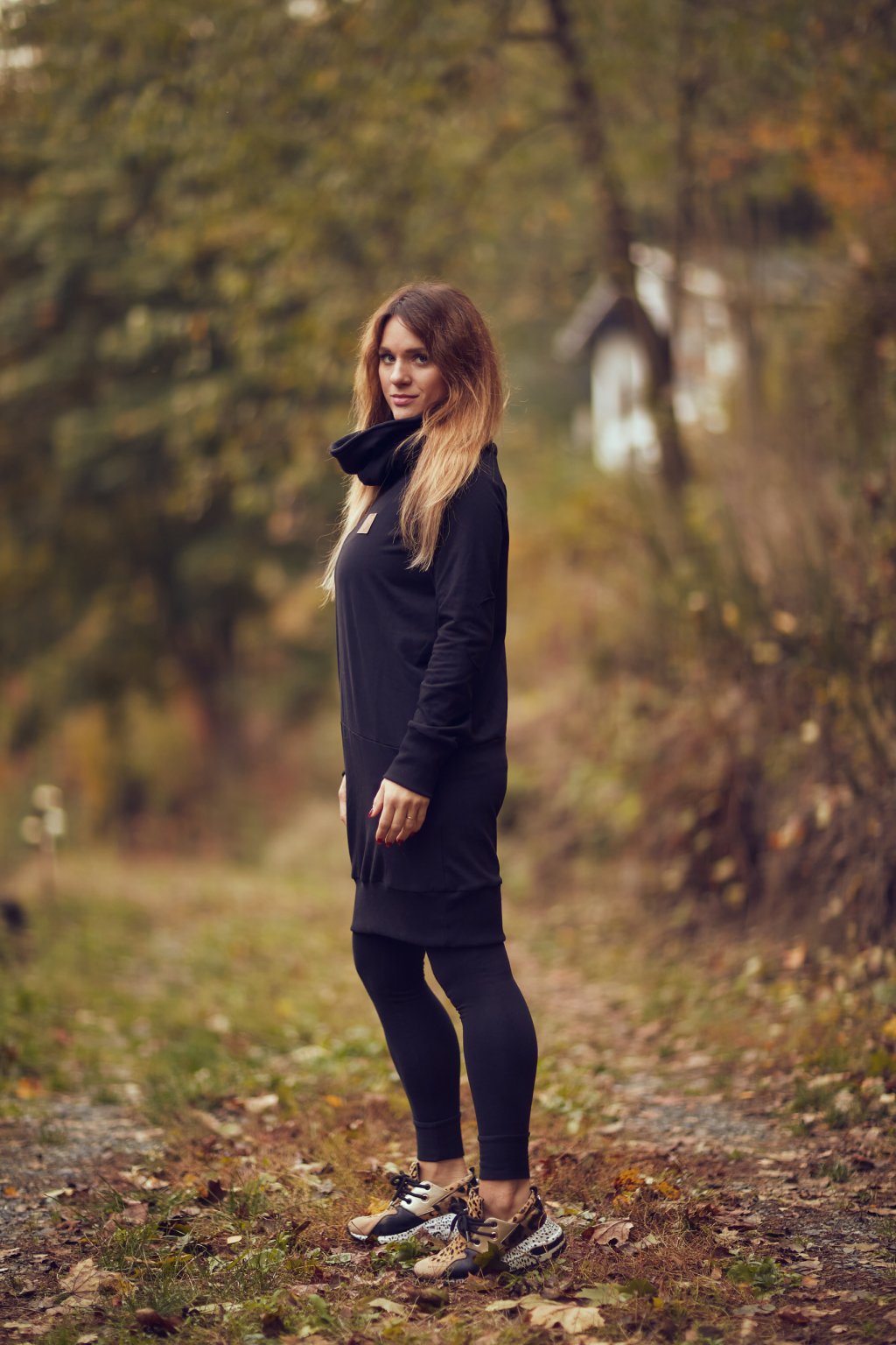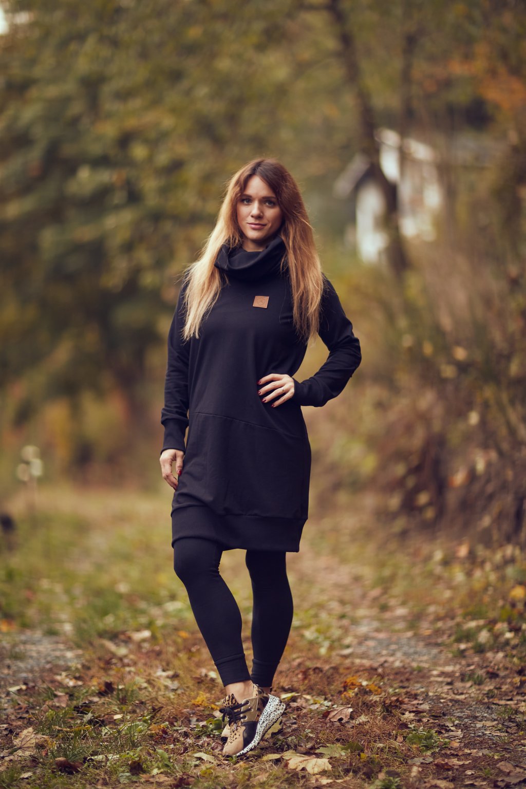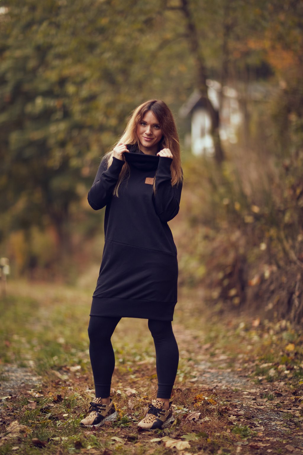 Stylová dlouhá mikina má spíše volnější střih, je ušita z černé počesané teplákoviny. Mikina má okolo krku tunel, který je součástí mikiny a dole je stažena do nápletu.