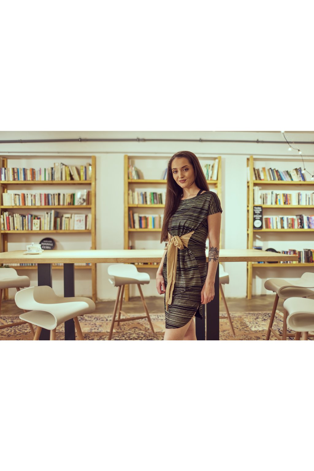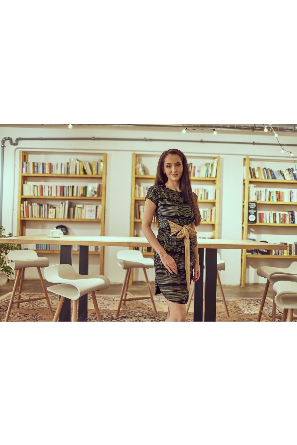 Letní volné šaty z lehkého příjemného materiálu se spadlým ramenem na zavazování v pase na několik způsobů. Šaty jsou z černé viskózy s nepravidelnými zlatými liniemi. Vázanka je z jemného zlatého tylu.
