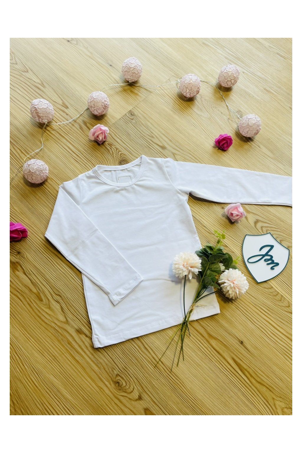 Tričko je ušité z bílého bavlněného úpletu s elastanem. Tričko má dlouhý rukáv a je úplně jednoduché, dozdobené pouze naším logem na zádech za krkem.