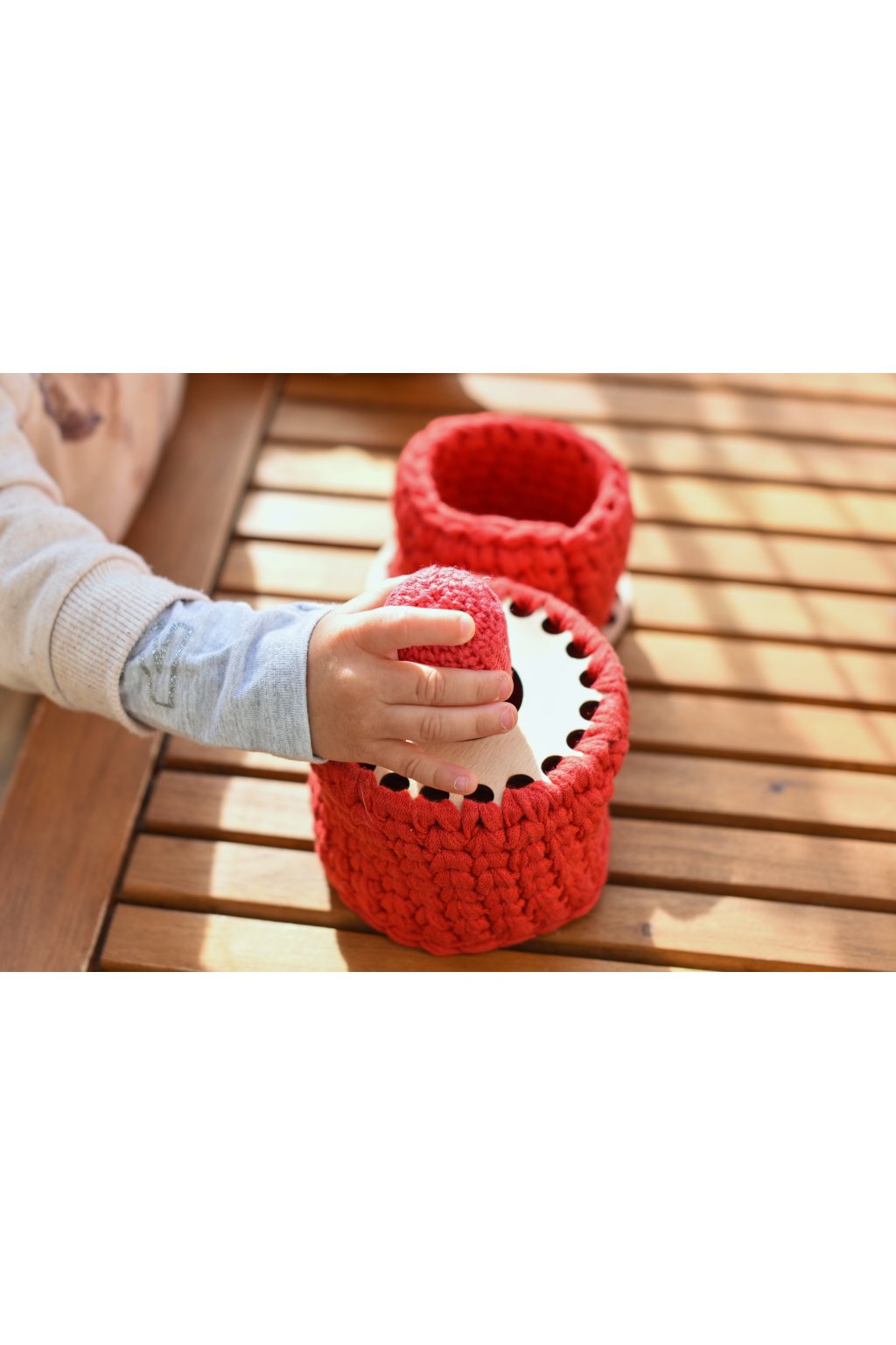 Sada obsahuje: dva do sebe zasouvatelné košíky, obháčkovaný váleček z kindervajíčka (šetříme životní prostředí a snažíme se efetivně využívat přebytečné předměty :-)