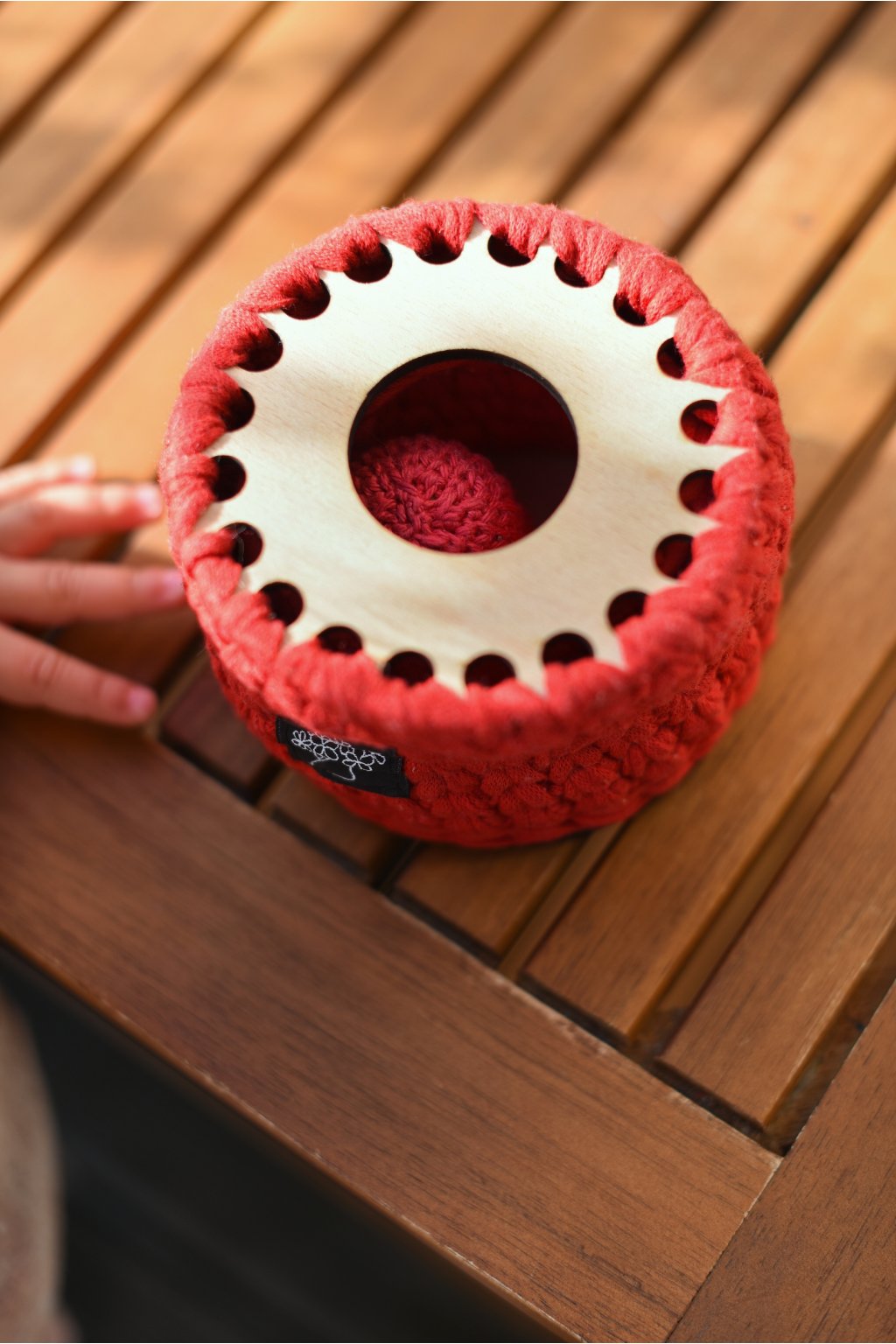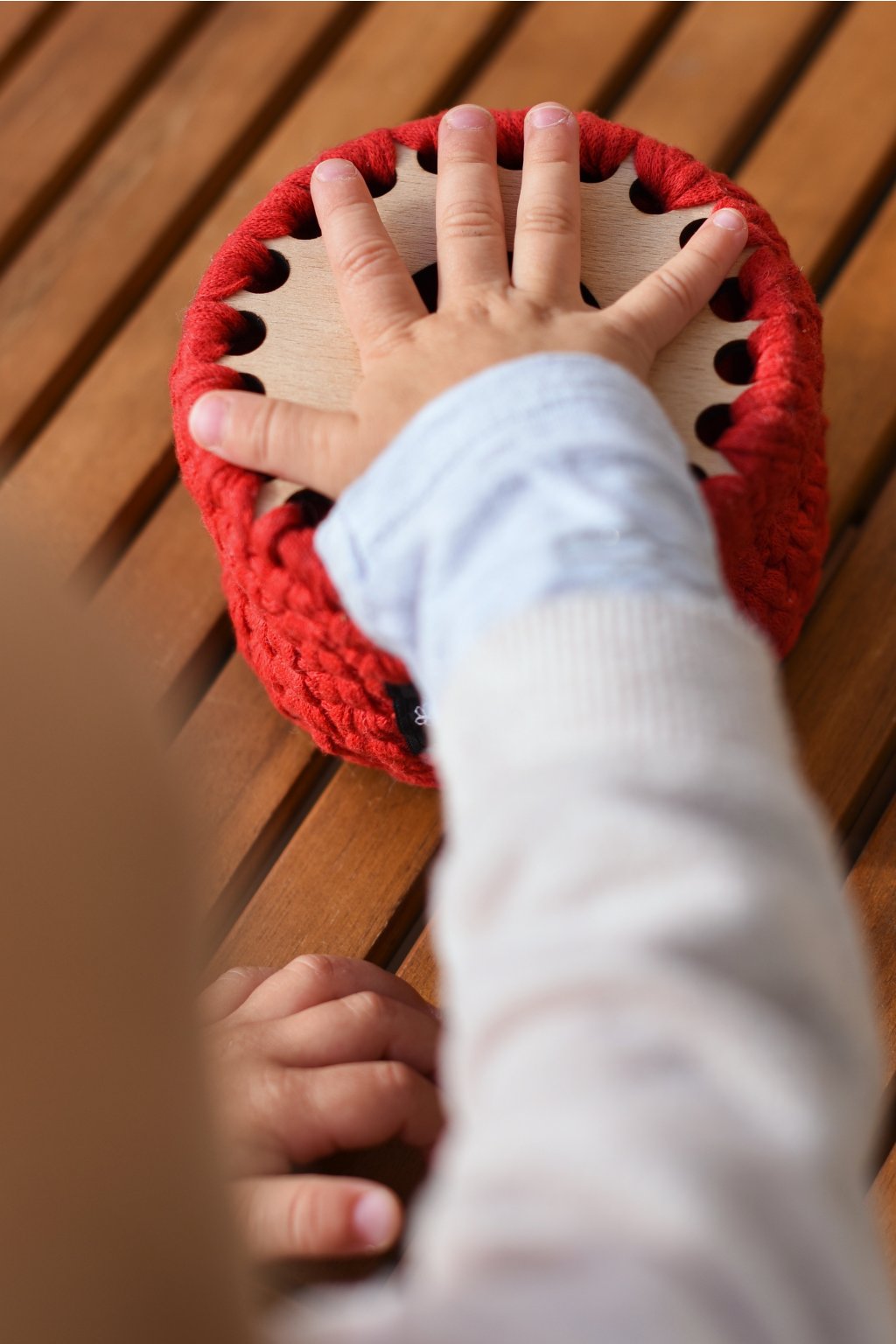 Materiál: příze směs bavlny, viskózy a polyesteru, což zaručuje jemnost, pevnost a pružnost příze, ale také její snadnou údržbu. Je vyrobena z recyklovaného materiálu. Dřevěné desky z dubového dřeva. Váleček plastový z kindervajíčka obháčkovaný 100% bavlněnou přízí certifikovanou pro děti do 3 let.