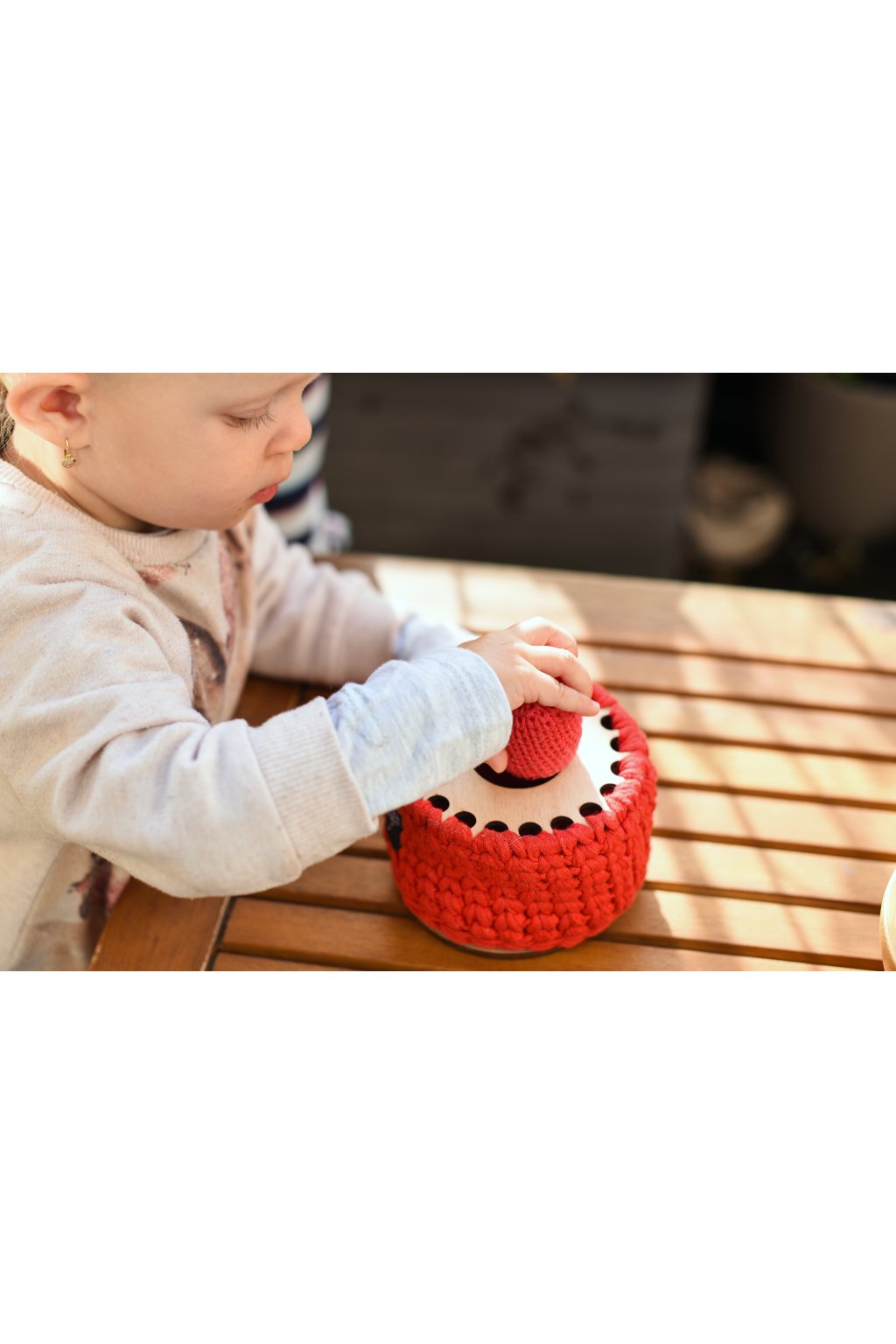 Jedná se o ručně háčkovaný košík s dřevěnou deskou s otvorem pro vhazování válečku či kuličky s vnitřním košíkem s dřevěným dnem.
