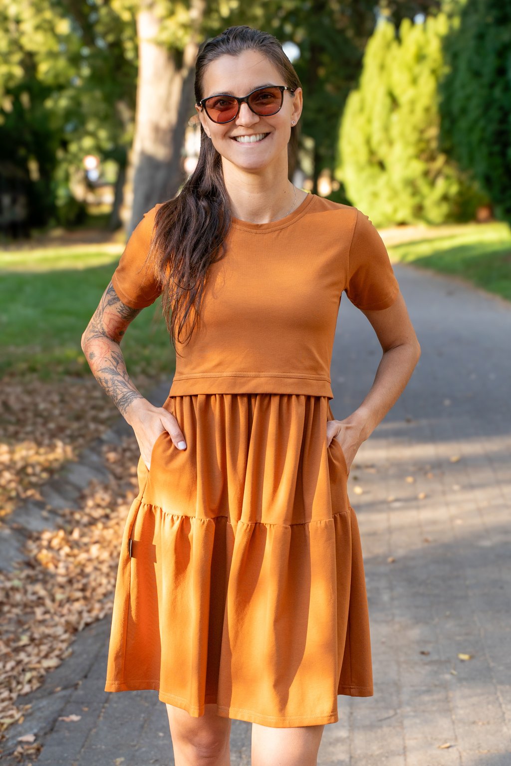 Volnočasové kojicí šaty Jsem máma s kapsami Hořčicové