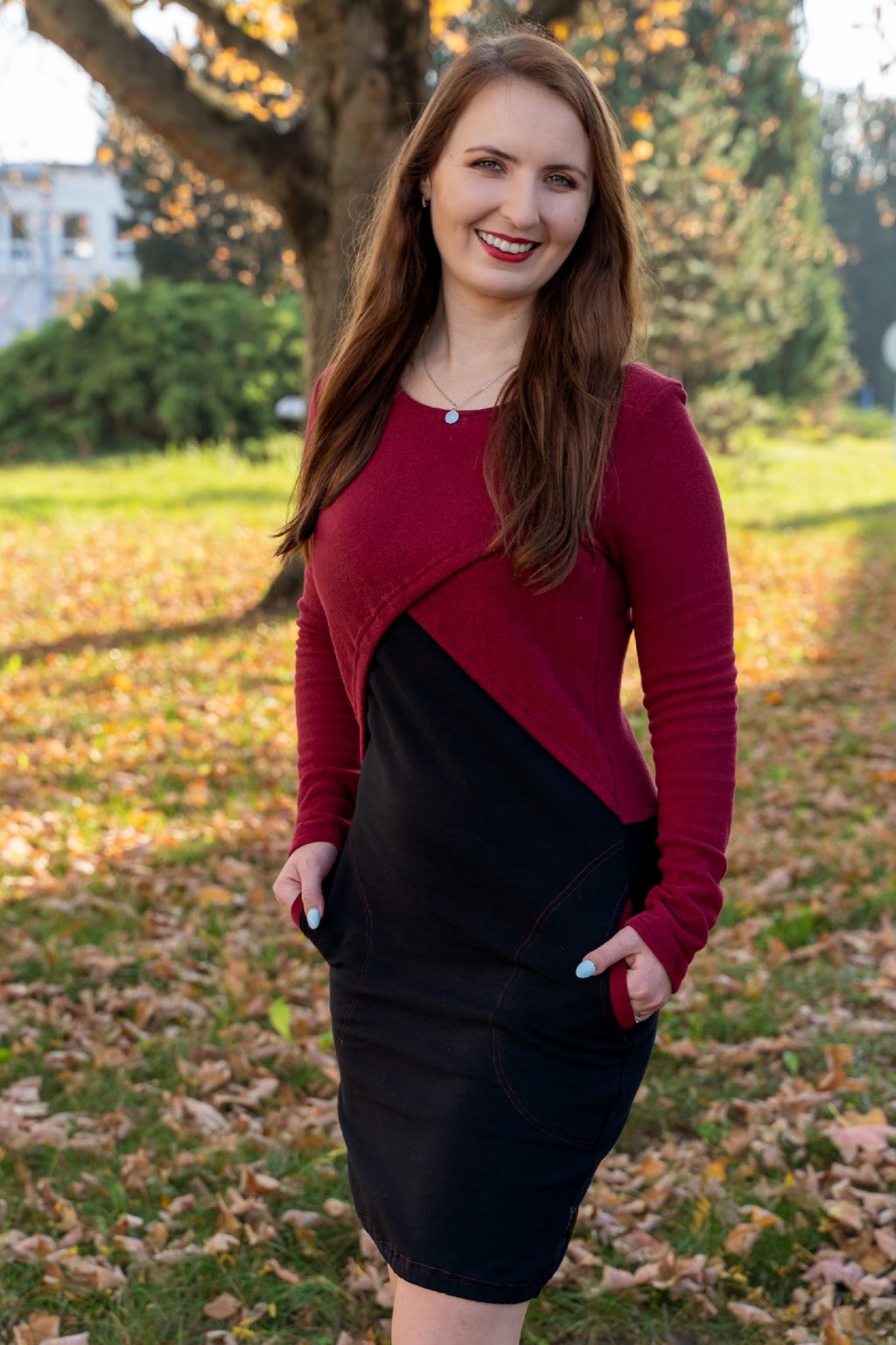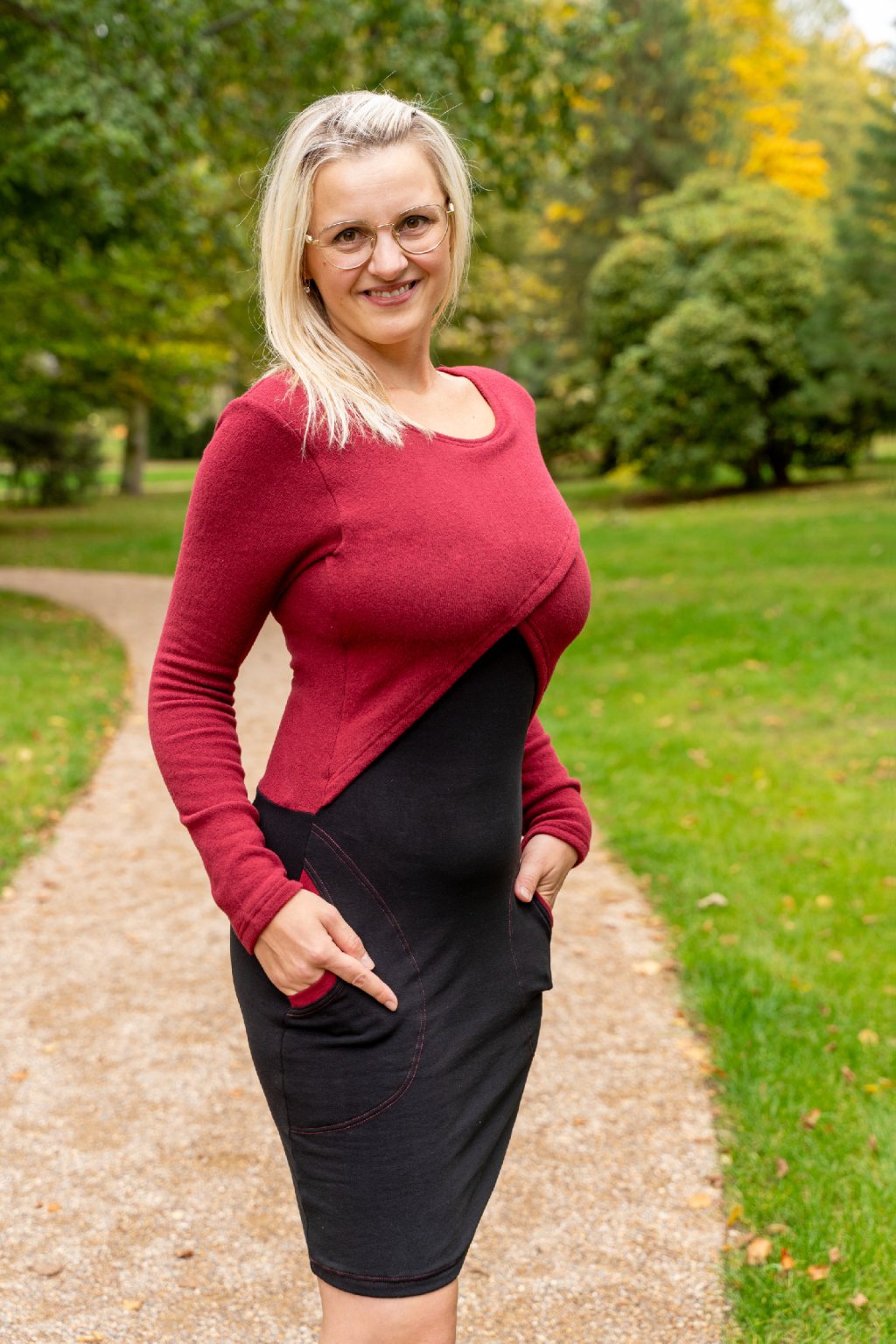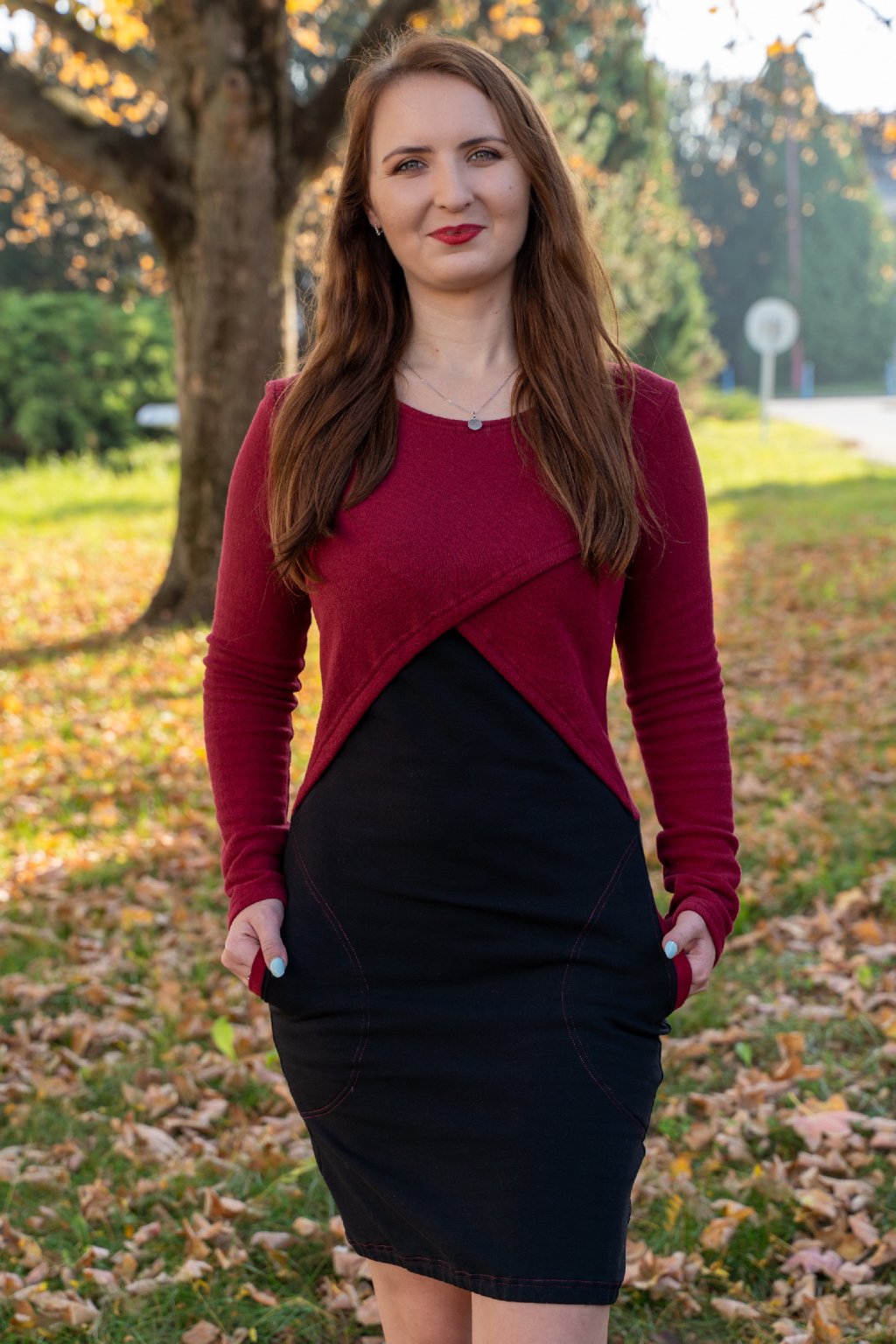 S barvou tohoto kousku jsme si opravdu pohráli. Jako základ jsme se rozhodli zvolit elegantní černý odstín, o kterém se ví, že opticky zeštíhluje. A vínový vršek pak šatům propůjčuje dotek barvy a ženské energie. Díky této rafinované kombinaci model využijete při různých příležitostech – můžete si ho obléct jako kojicí šaty na svatbu, na večírek, do divadla nebo třeba na romantickou večeři s nejúžasnějším tátou vašeho nejúžasnějšího děťátka!