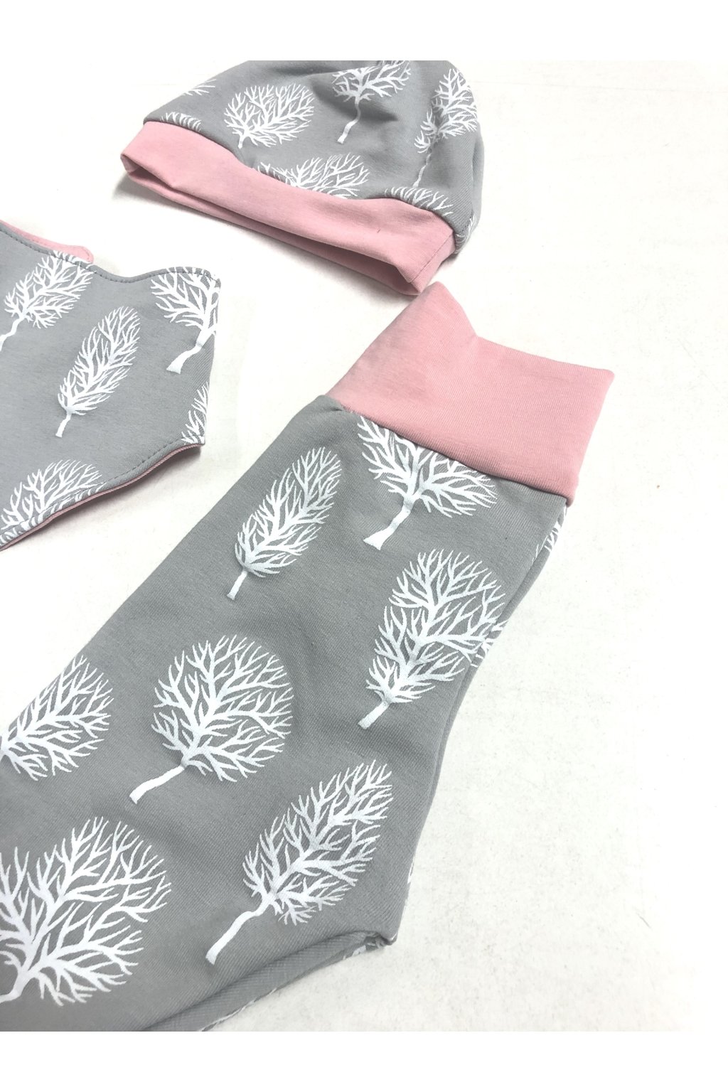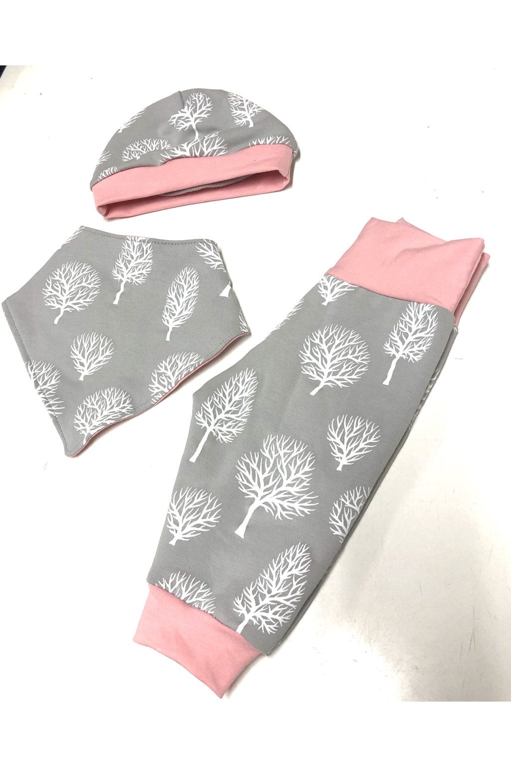 Zimní Mimi set DARIA Šedý zateplený miminkovský set s plastickým potiskem bílých stromků, který obsahuje trojkombinaci - tepláčky, šáteček jako bryndáček a čepičku. Z příjemné počesané teplákoviny, ktera splňuje normu OEKO-TEX Standard 100 pro děti do 3 let. Velikost 62 a 68. Vyrobeno v ČR.Doplňkové parametry